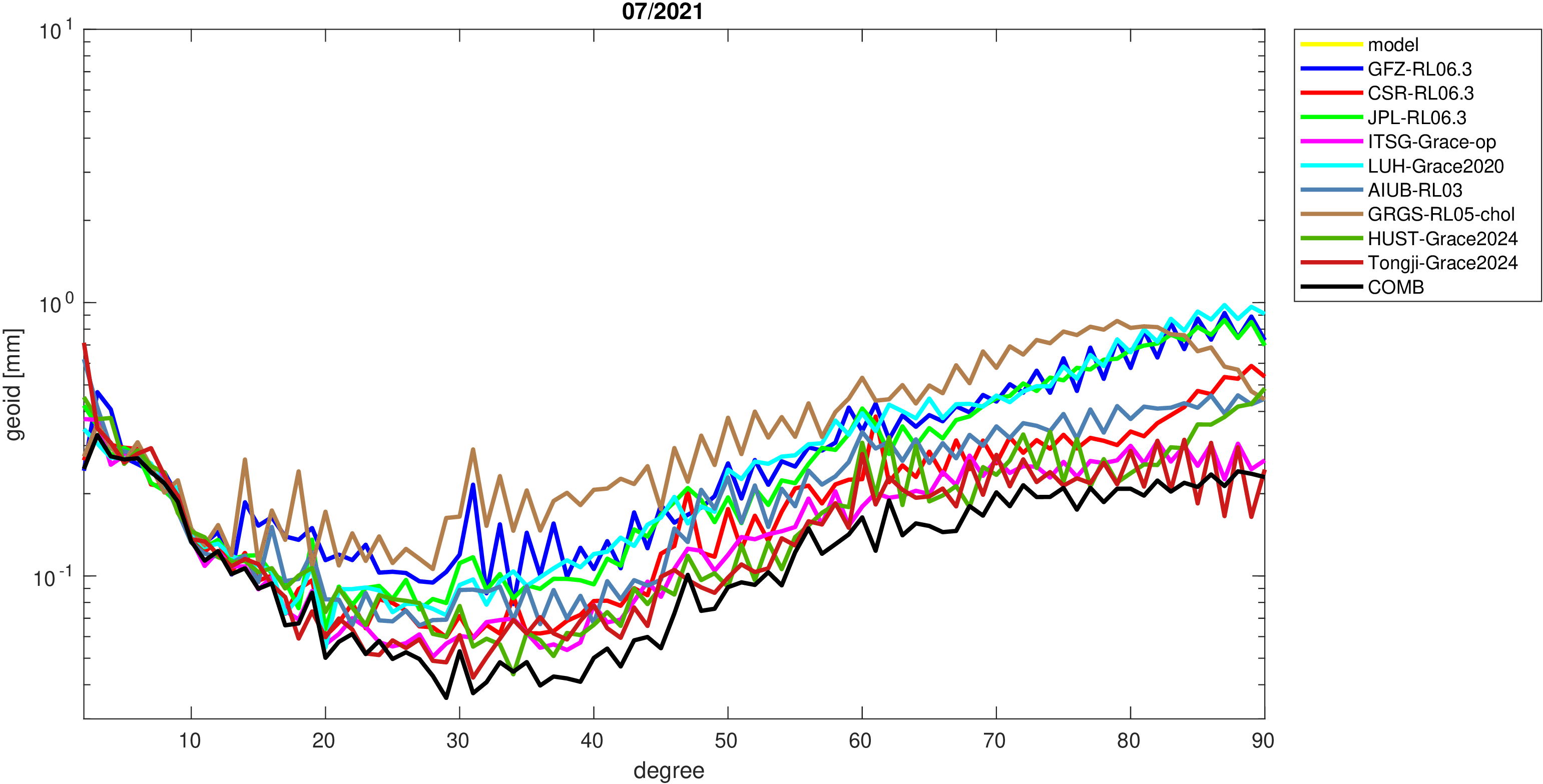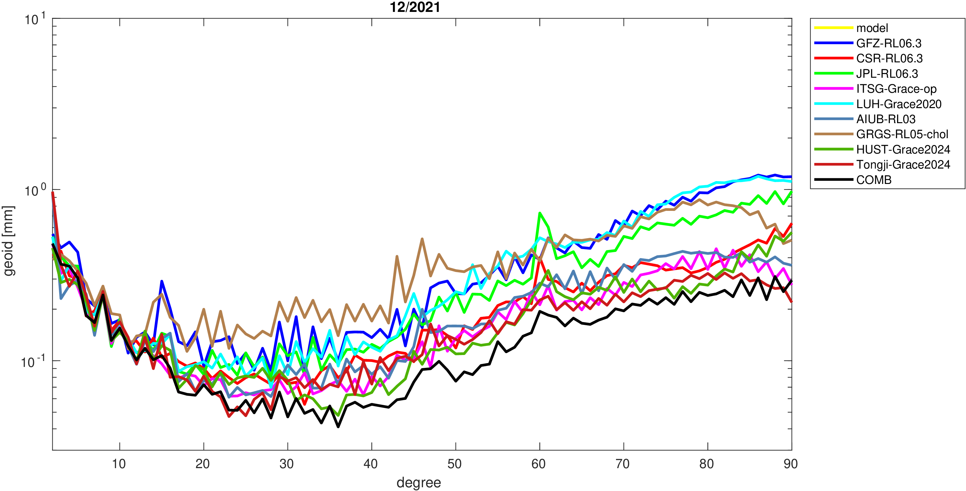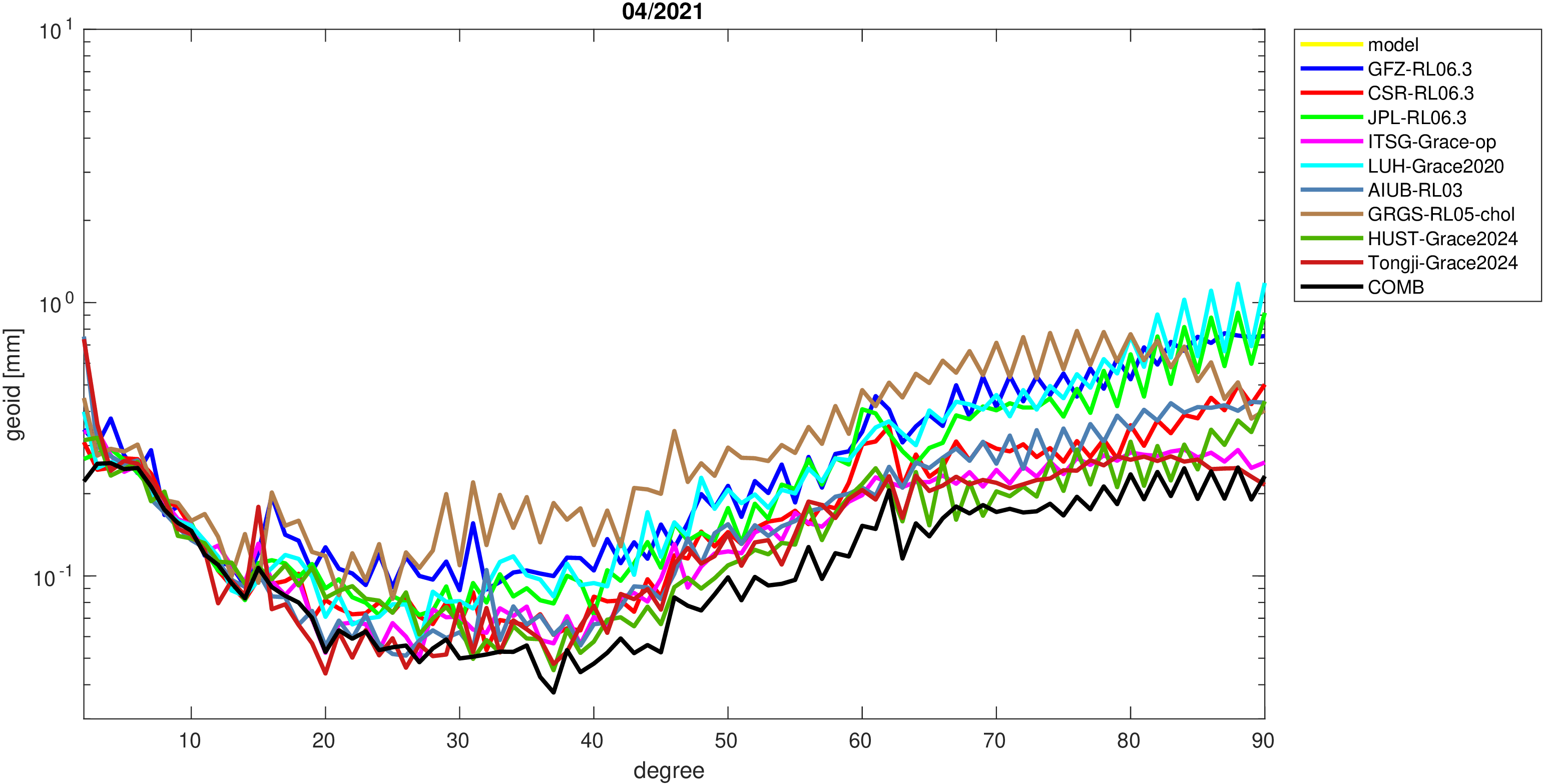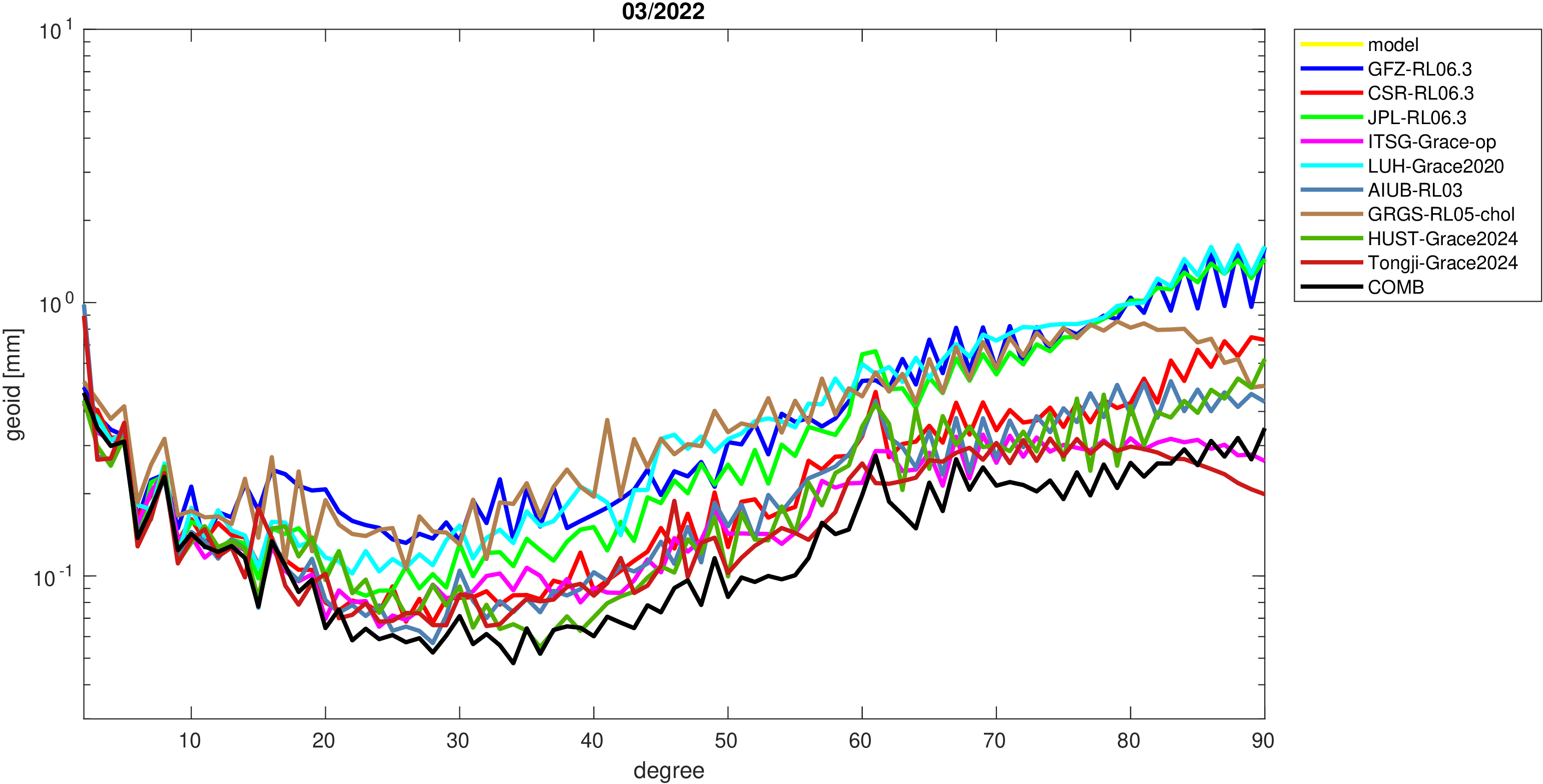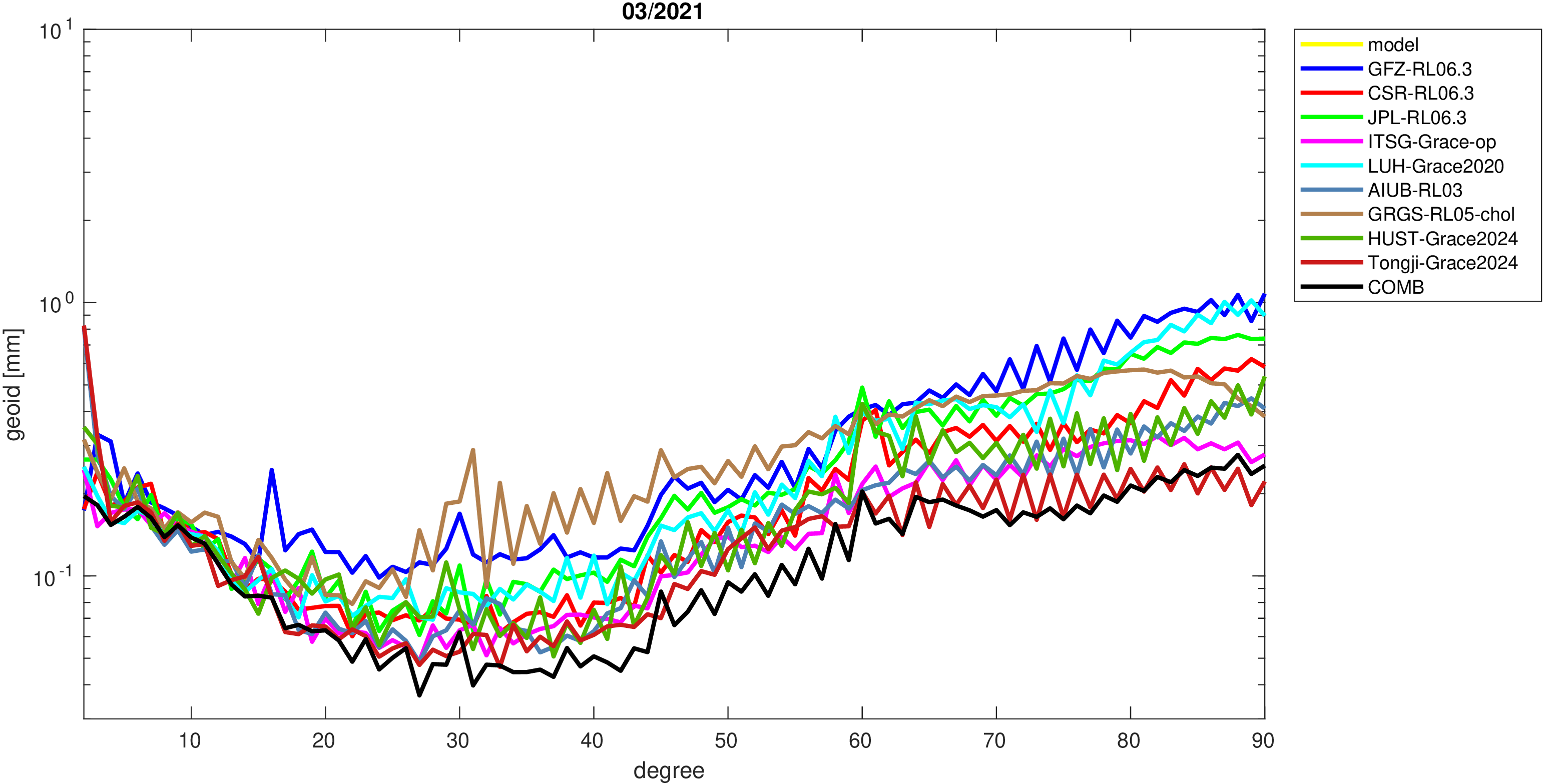 For comparisons in the spherical harmonic domain no filter is applied. Low degree anomalies are dominated by