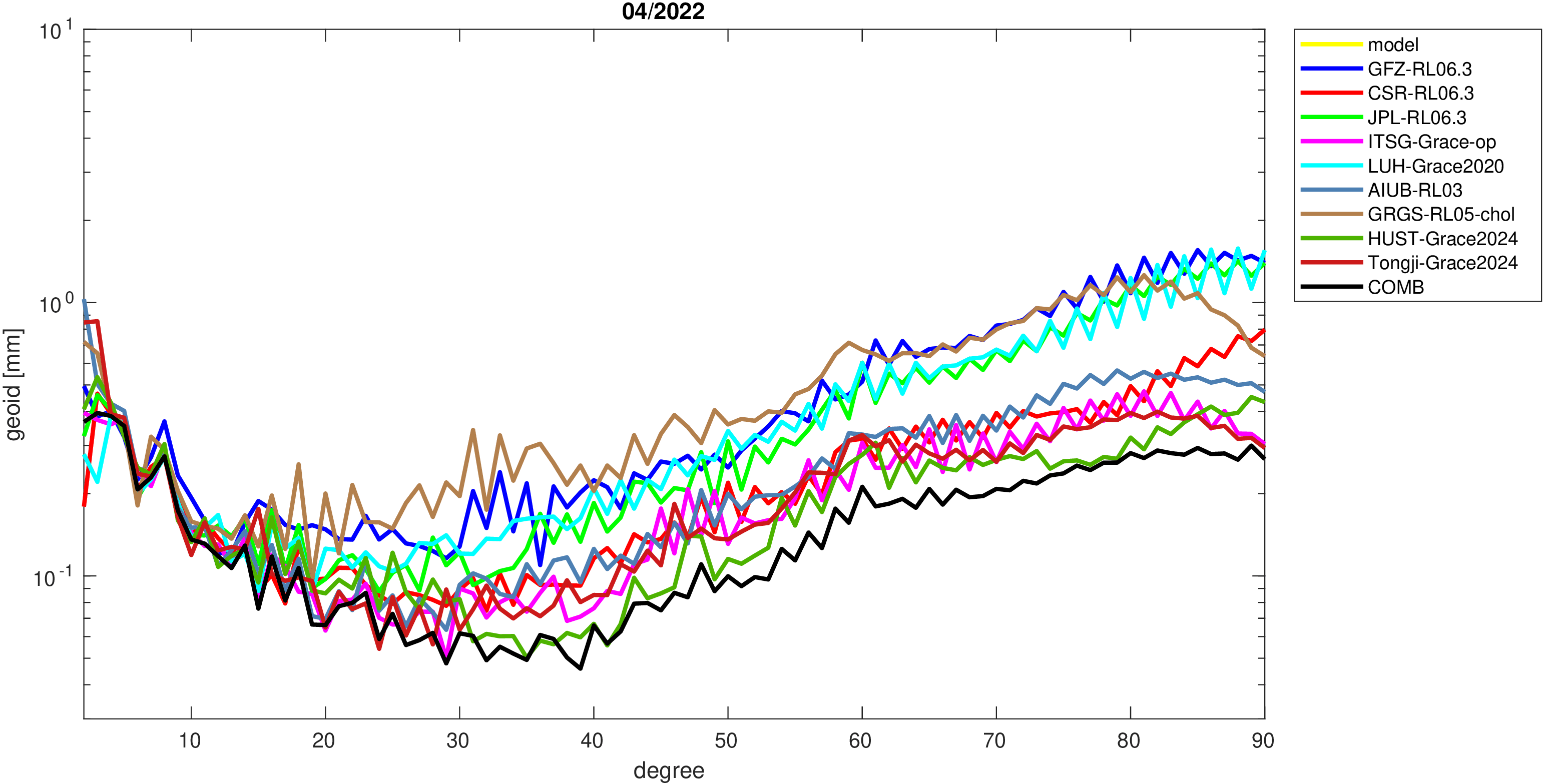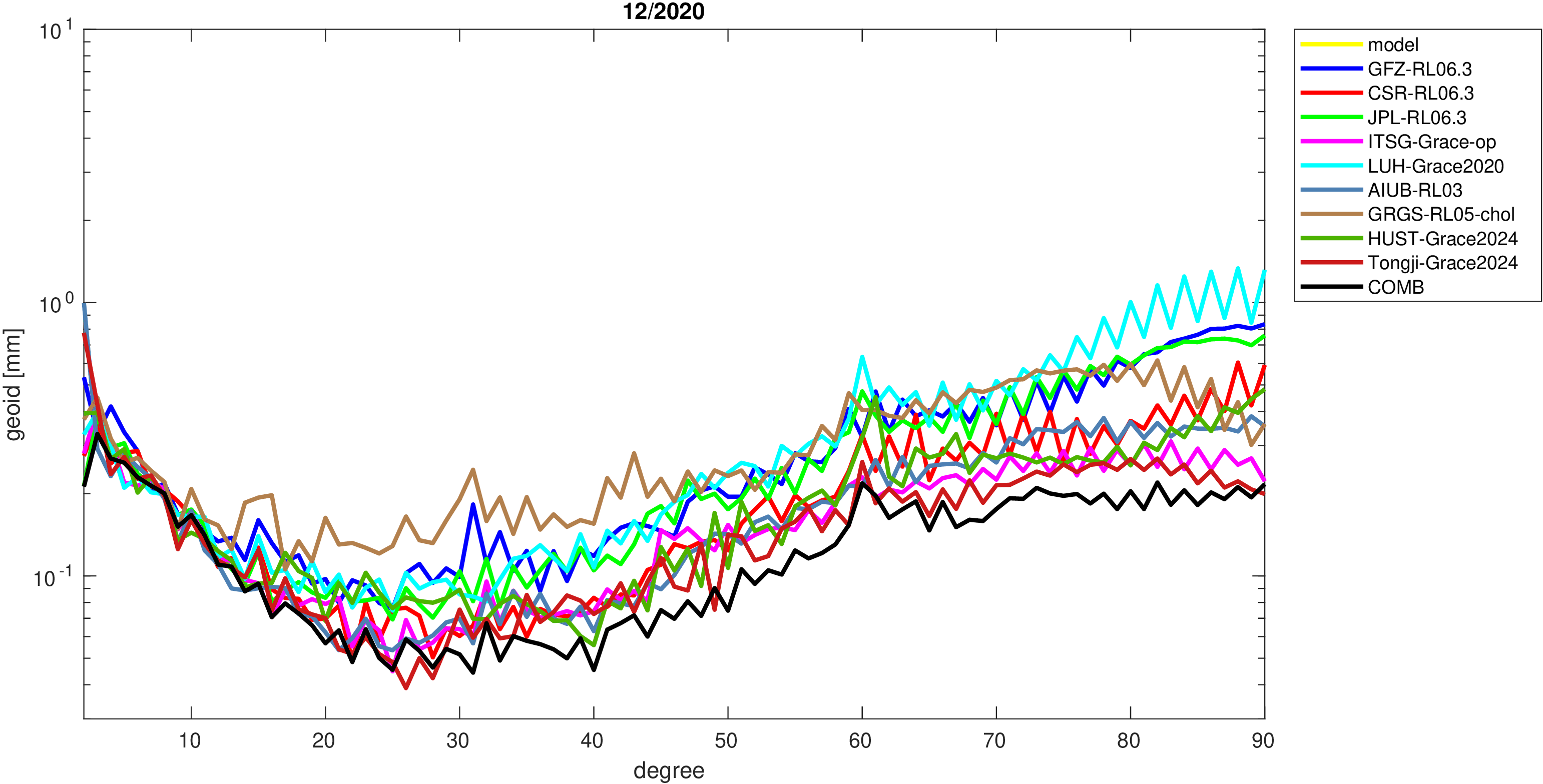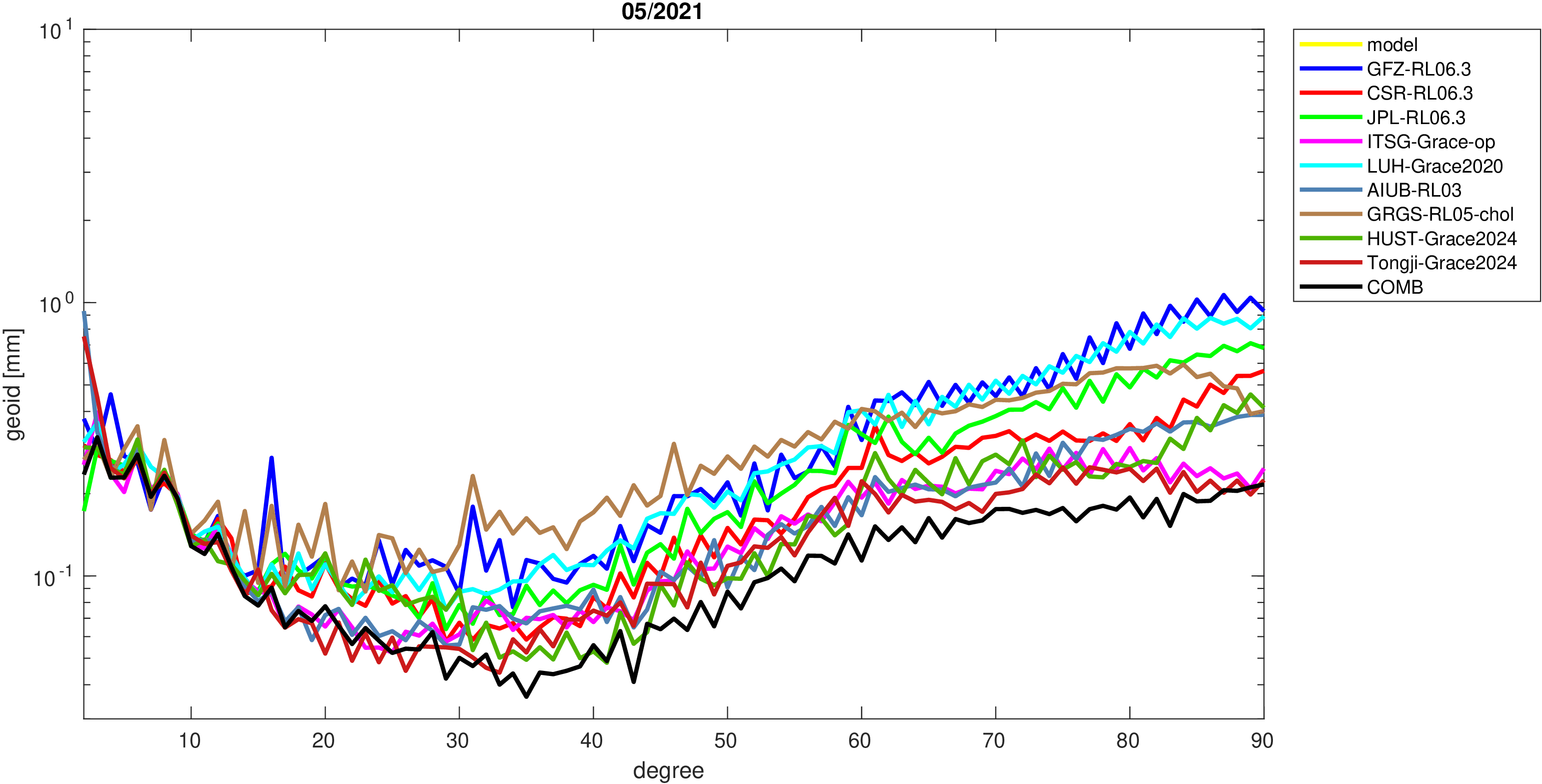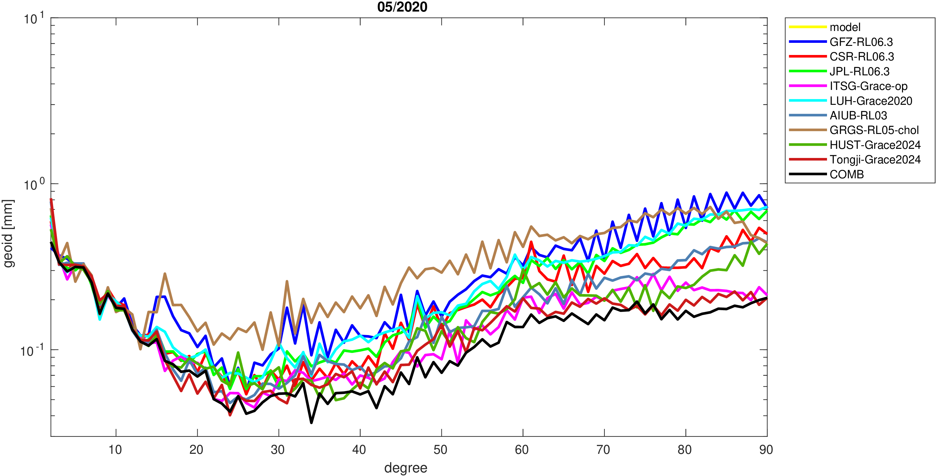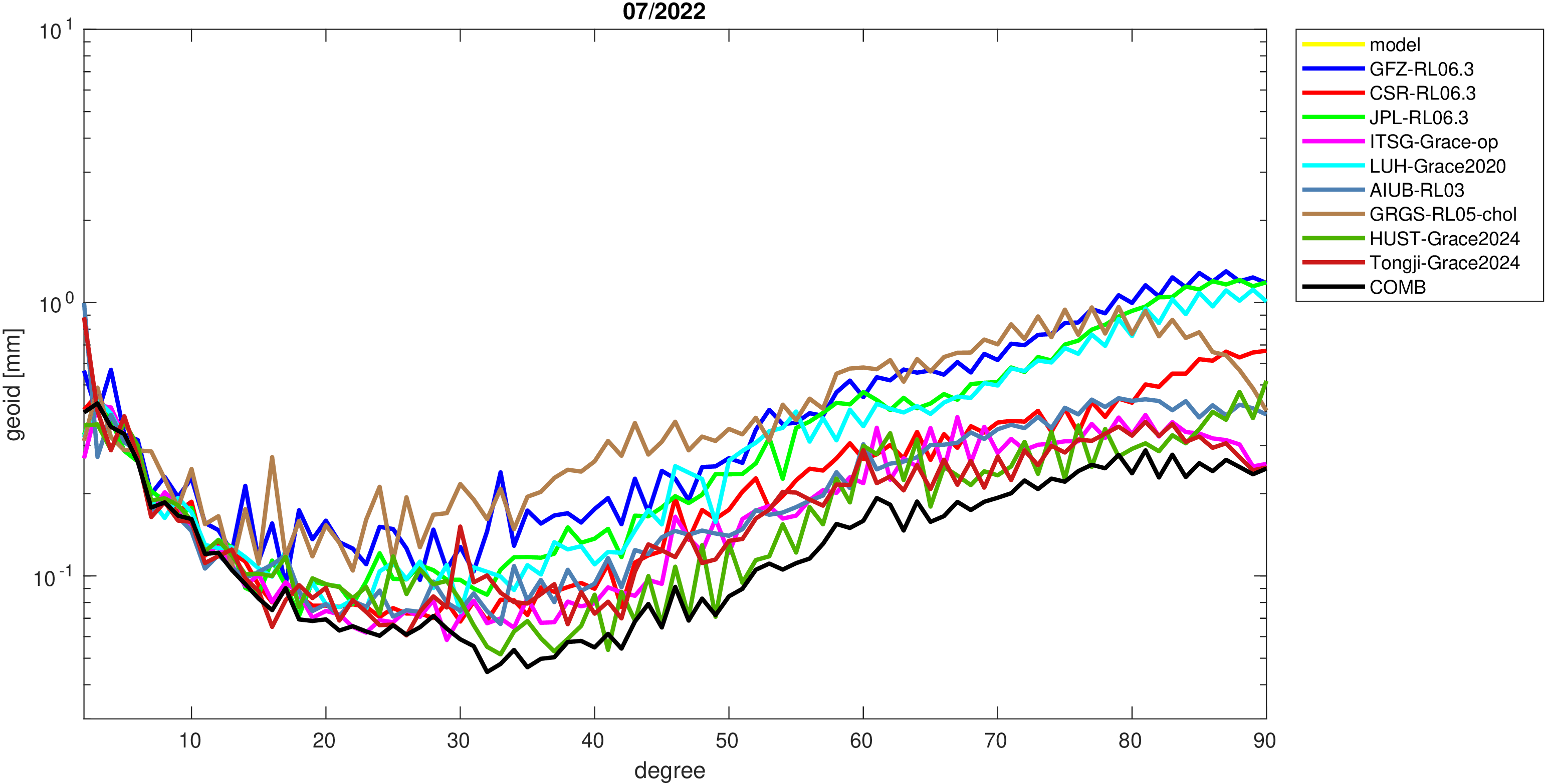For comparisons in the spherical harmonic domain no filter is applied. Low degree anomalies are dominated by
