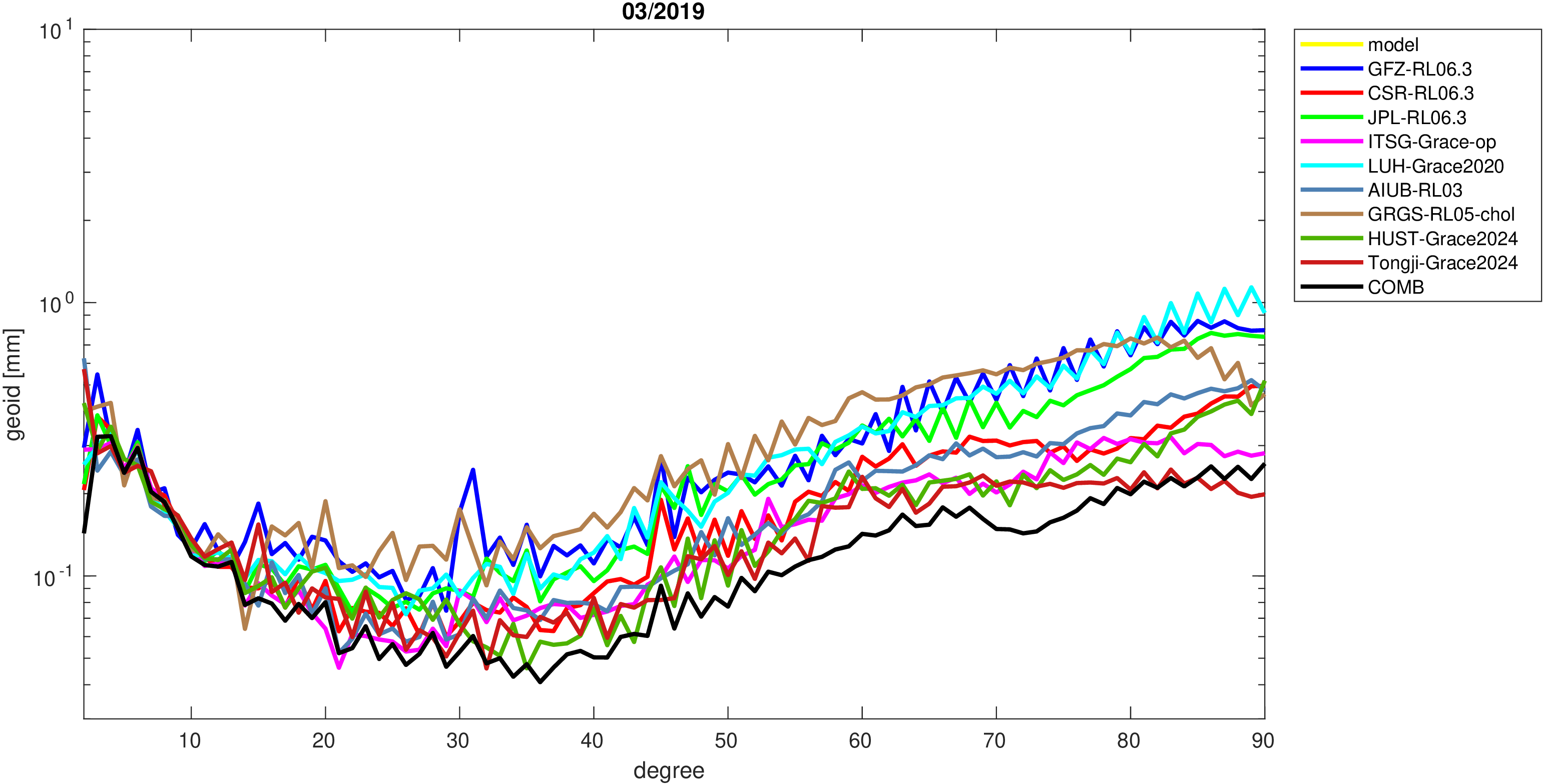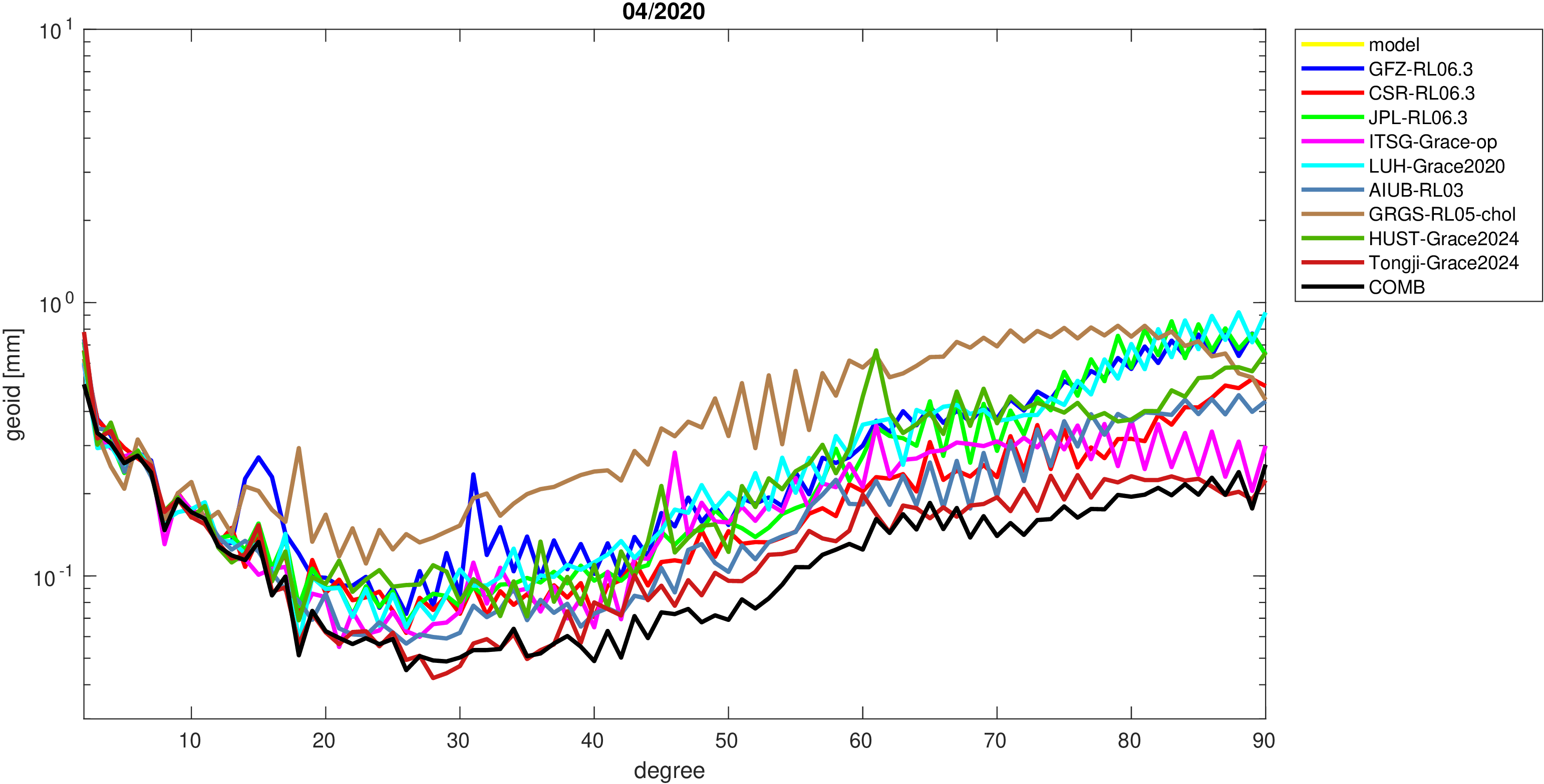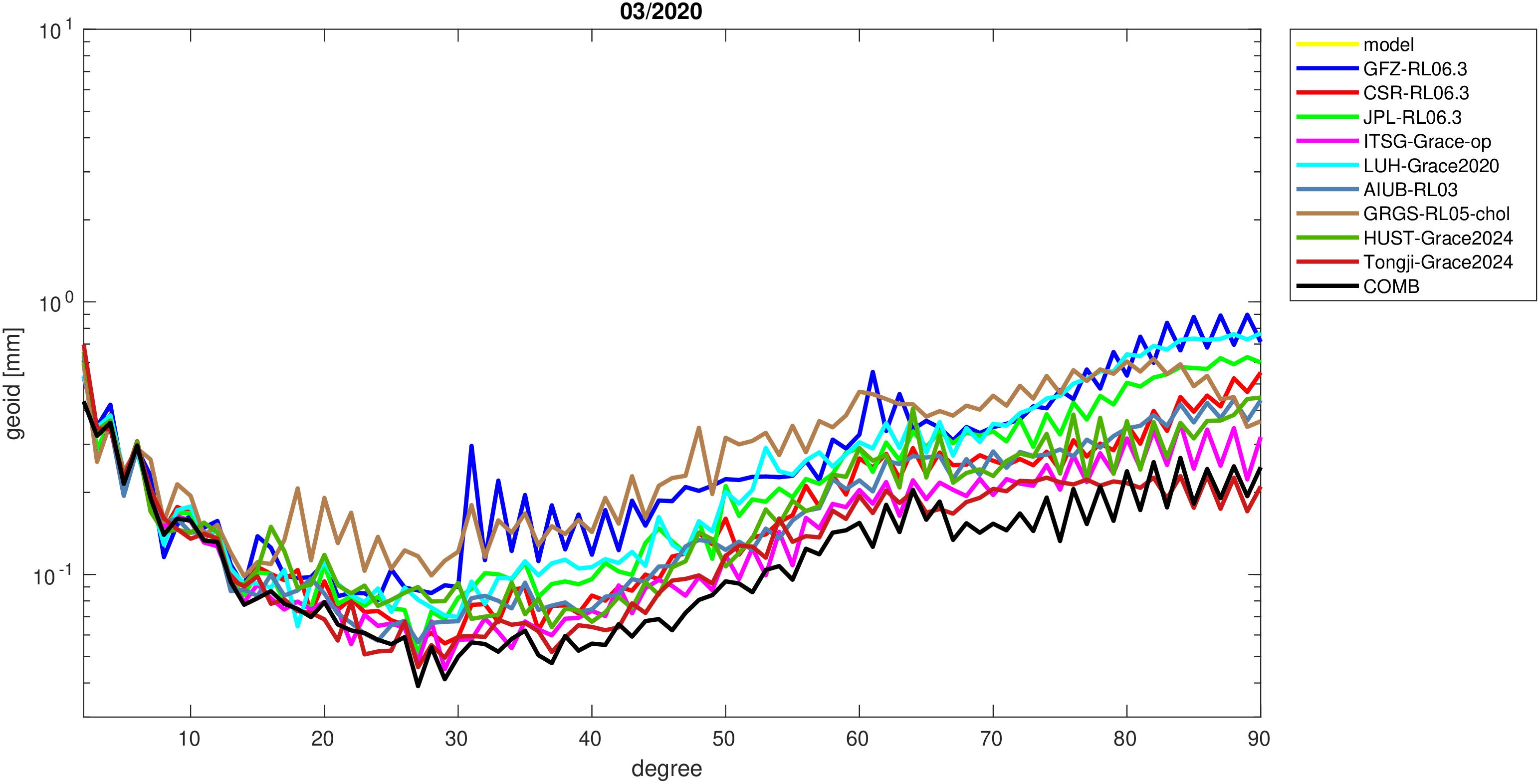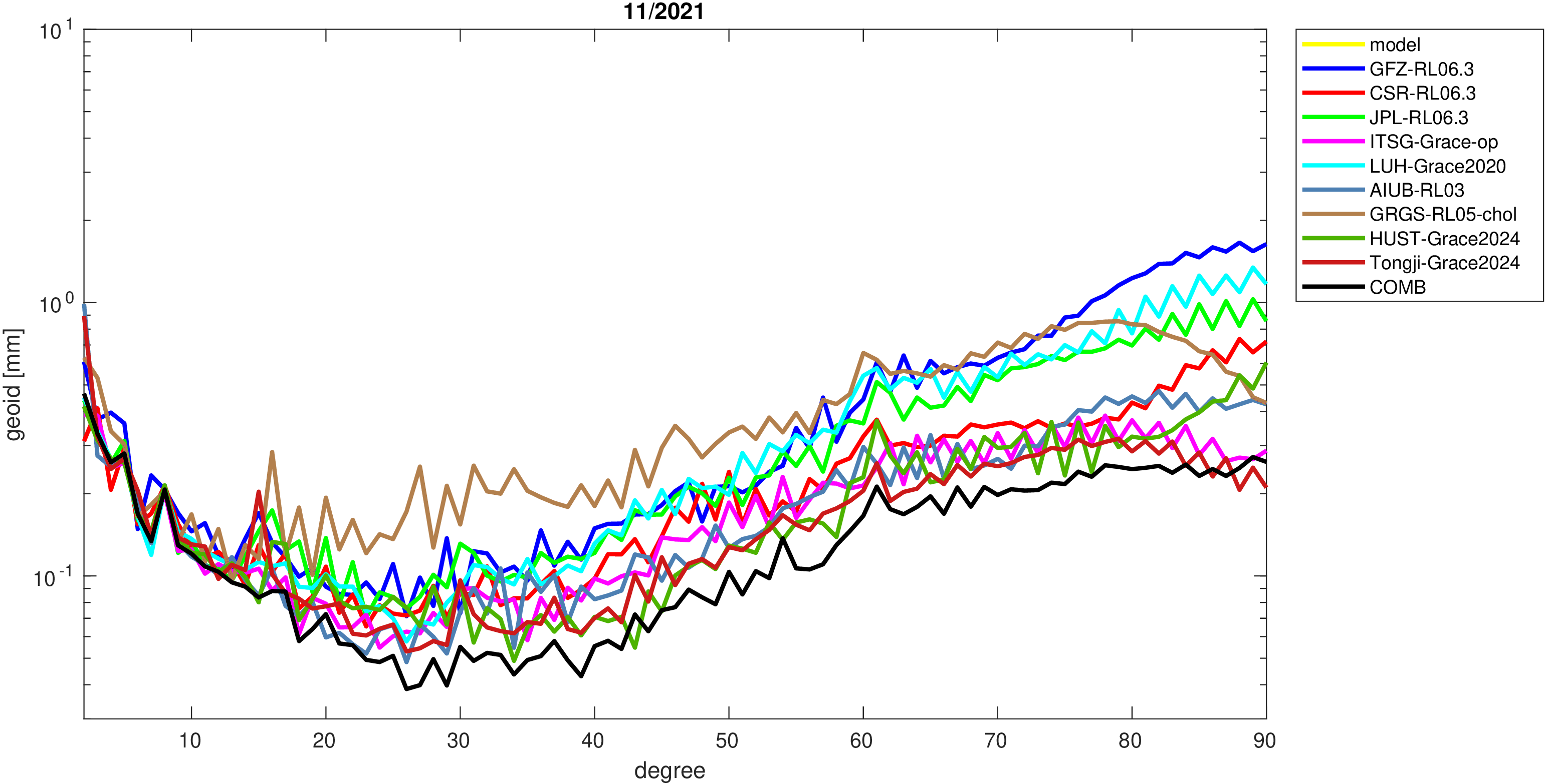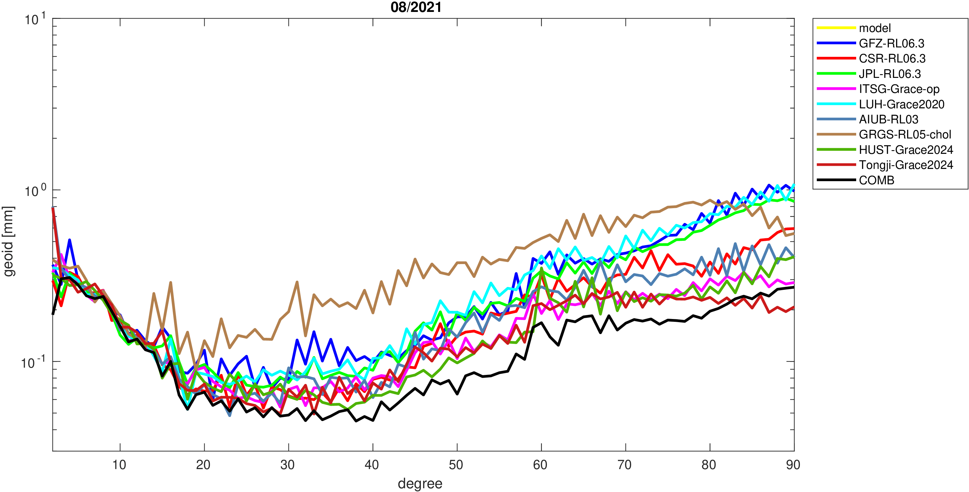 For comparisons in the spherical harmonic domain no filter is applied. Low degree anomalies are dominated by