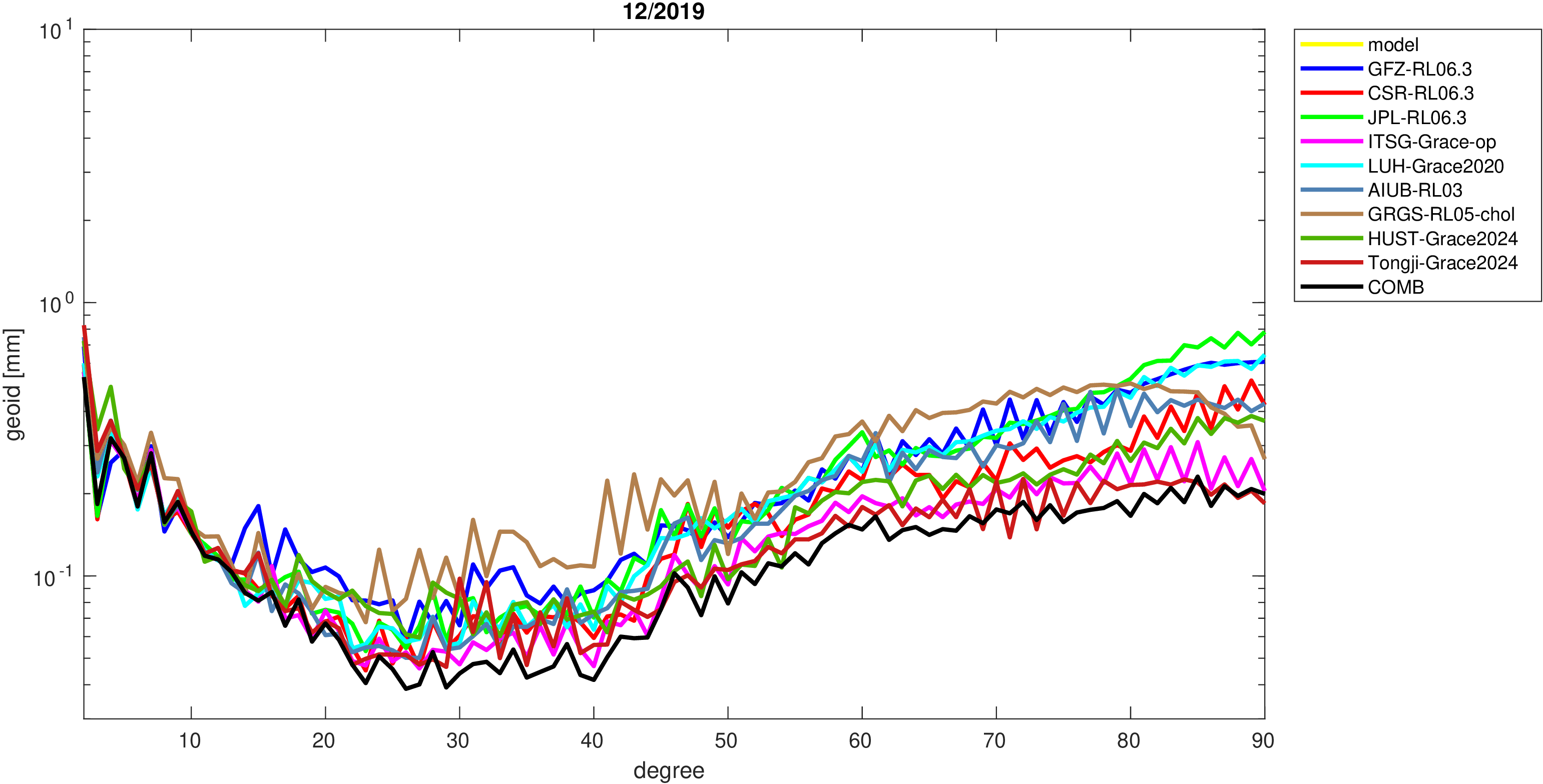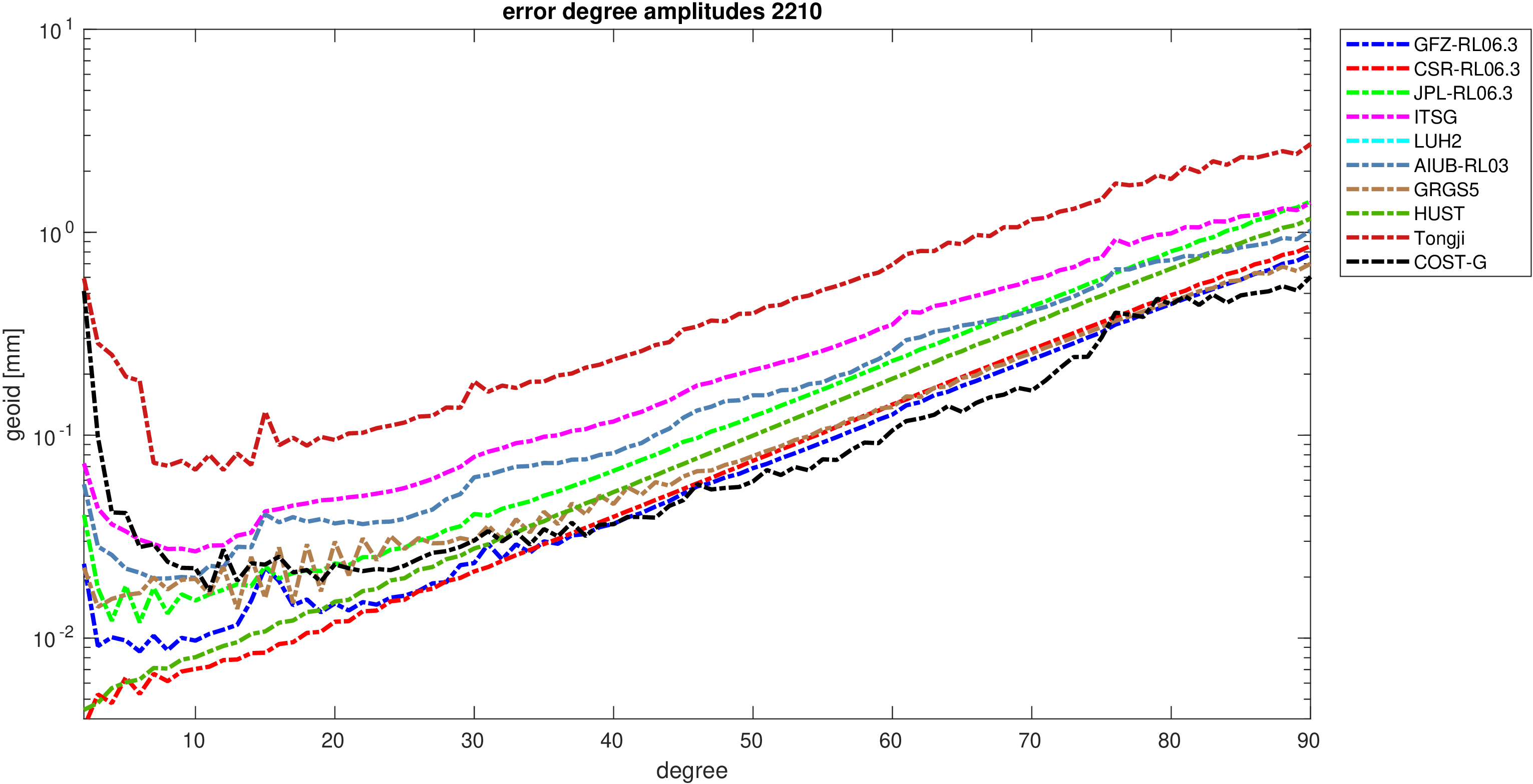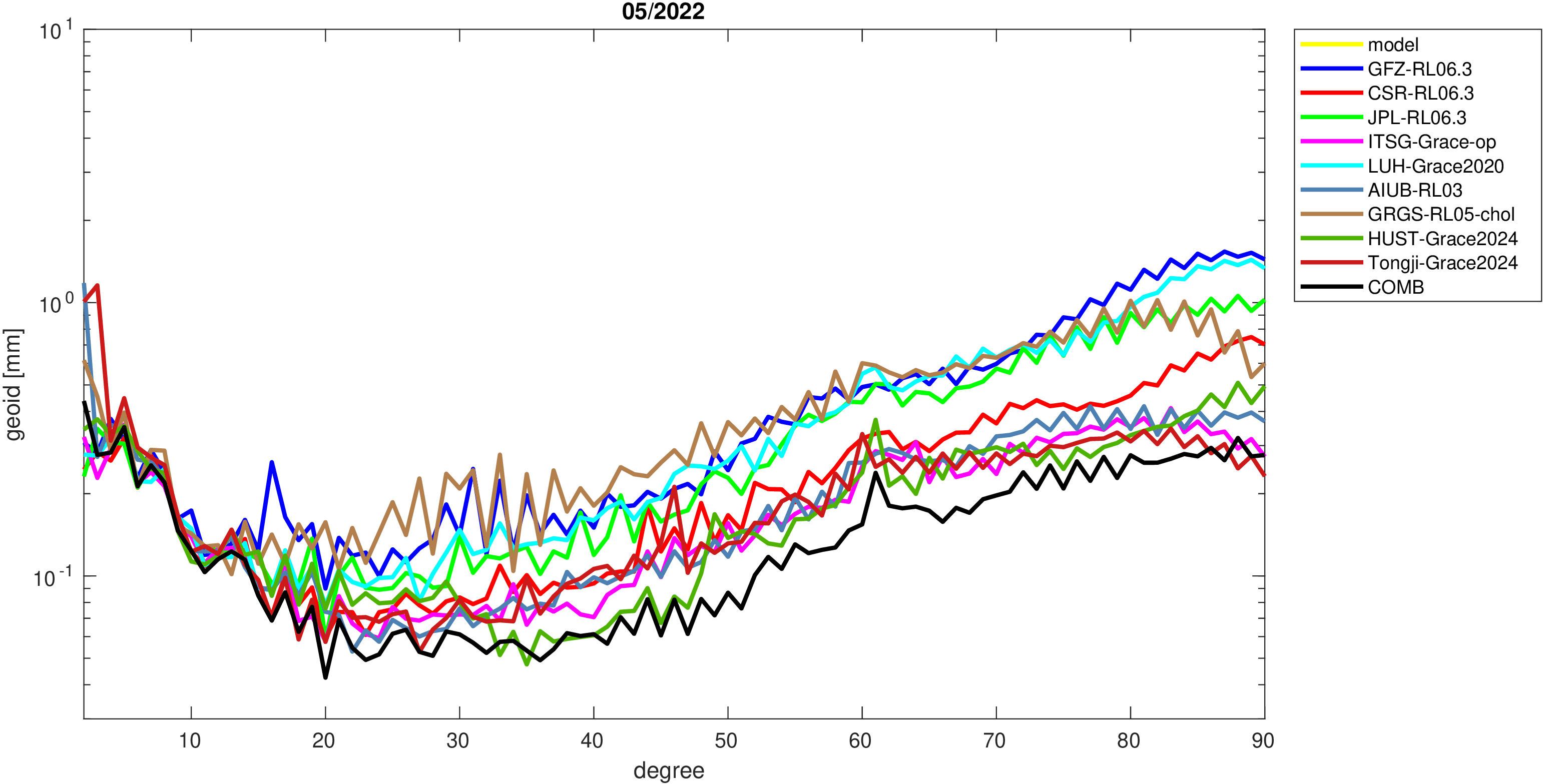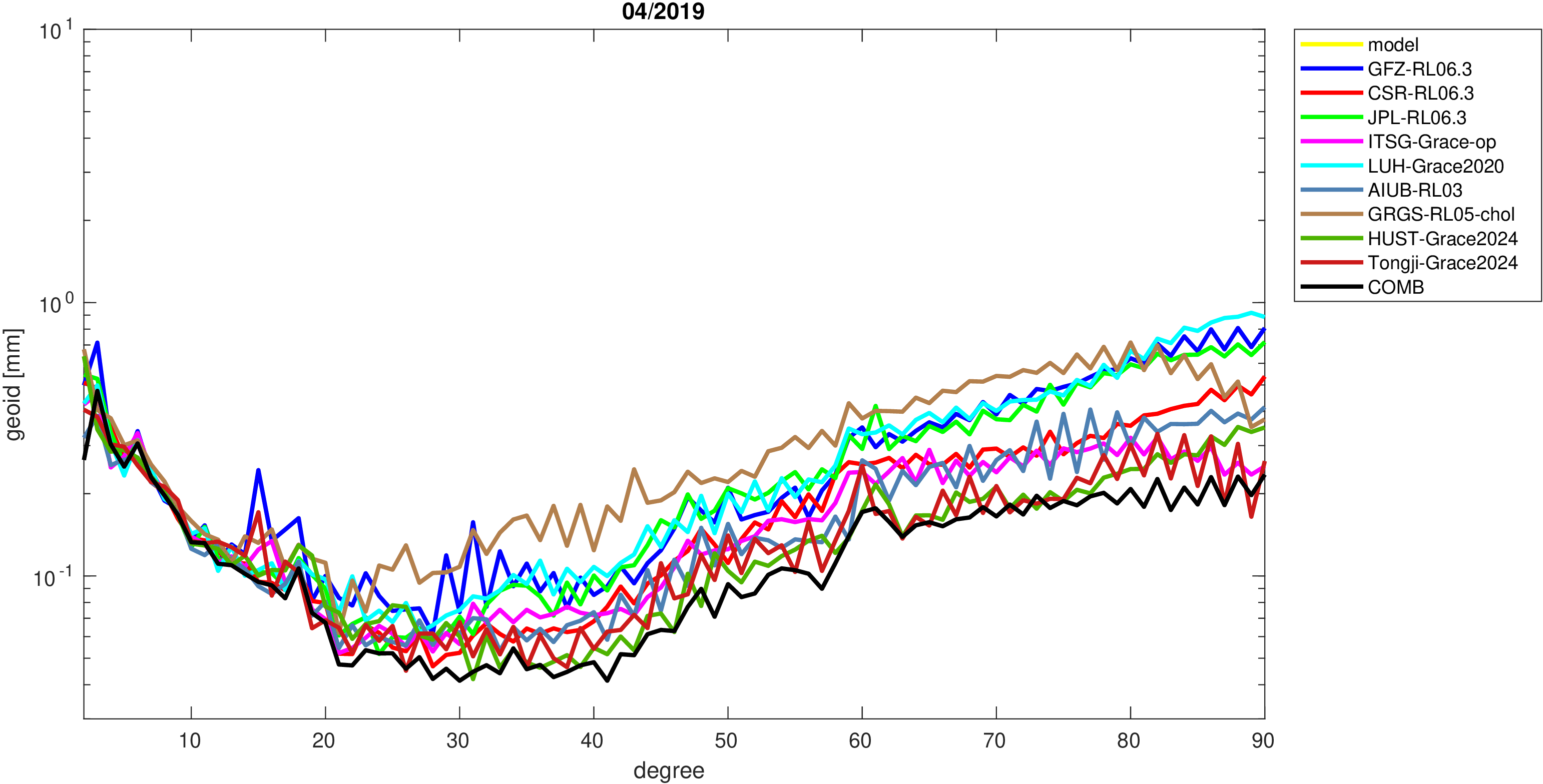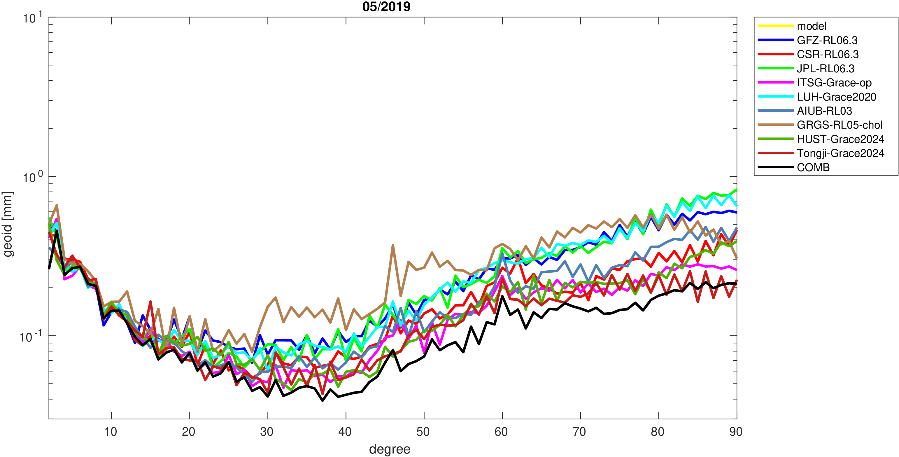 For comparisons in the spherical harmonic domain no filter is applied. Low degree anomalies are dominated by