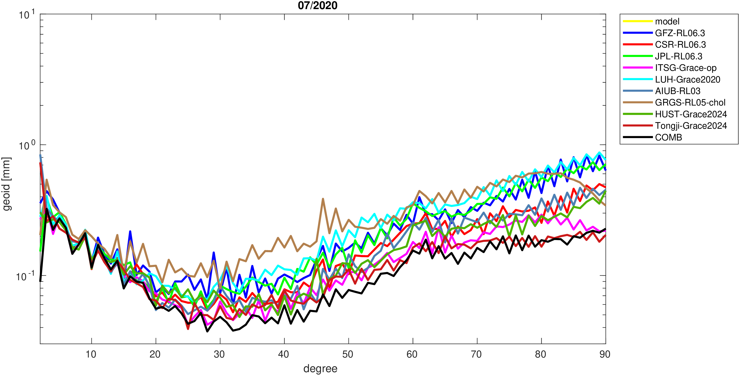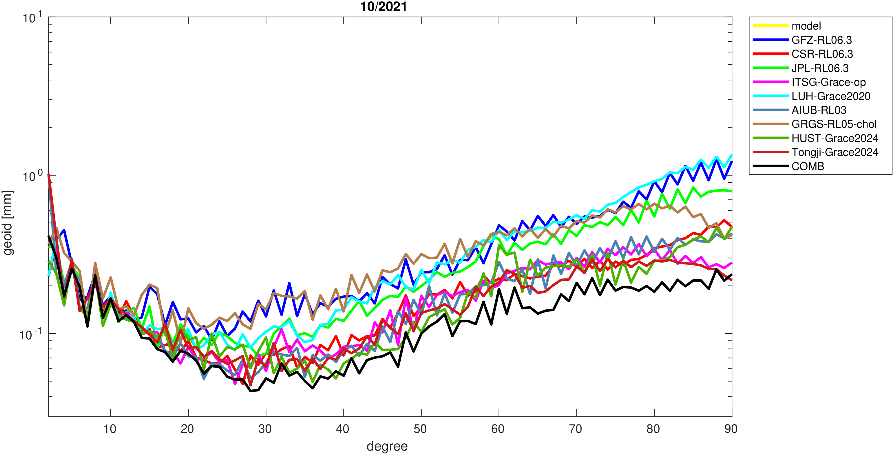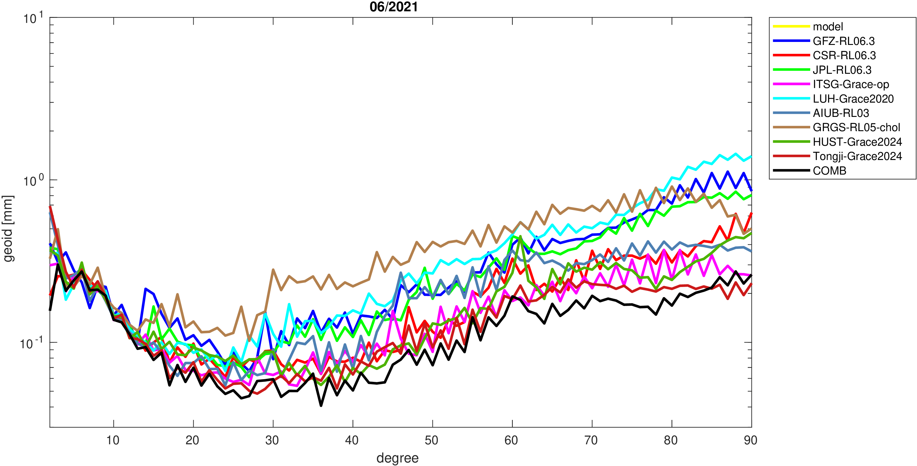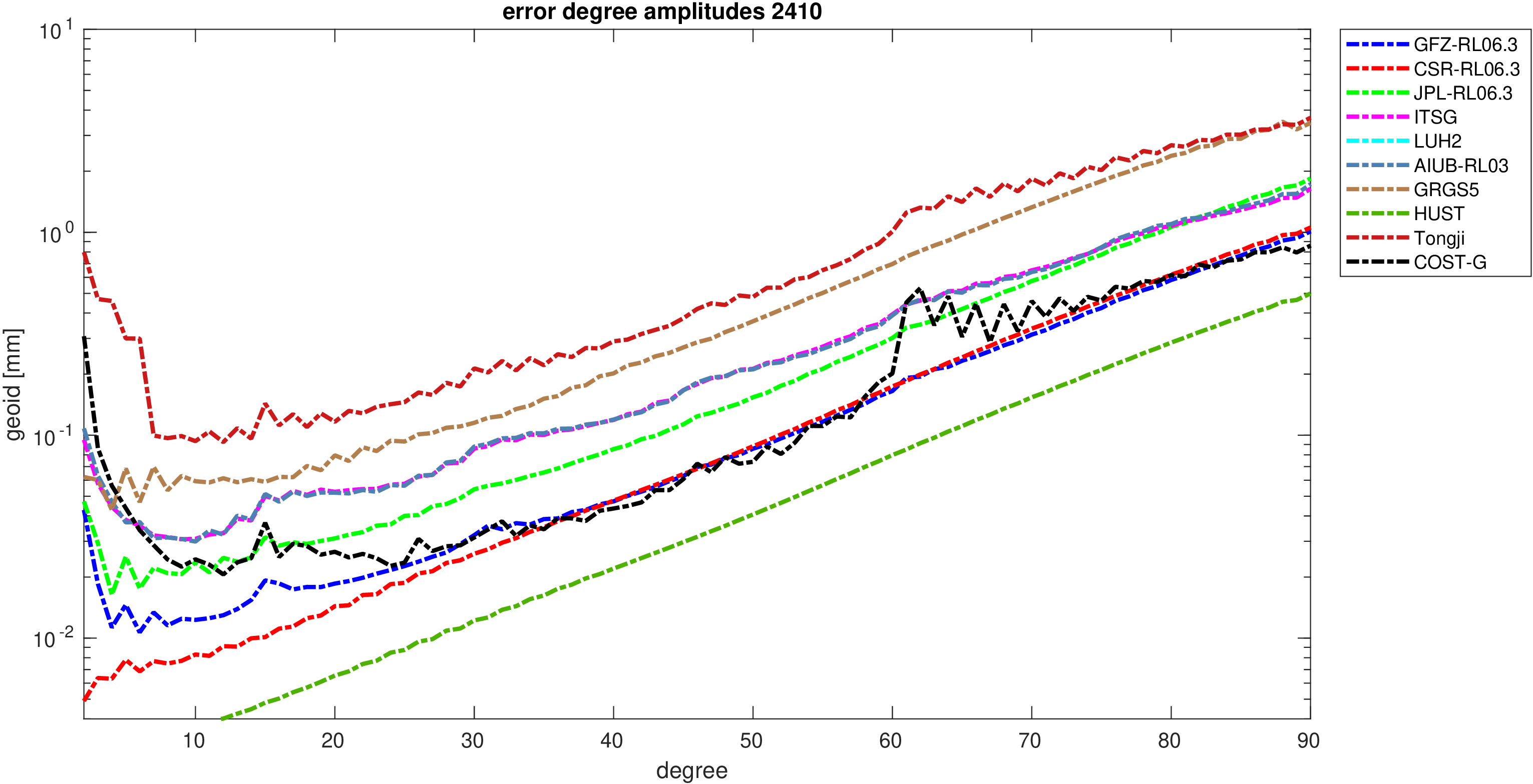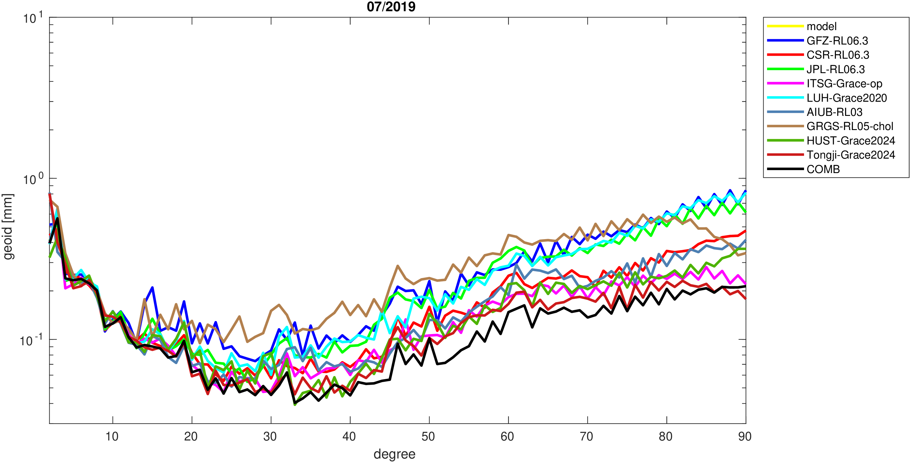 For comparisons in the spherical harmonic domain no filter is applied. Low degree anomalies are dominated by