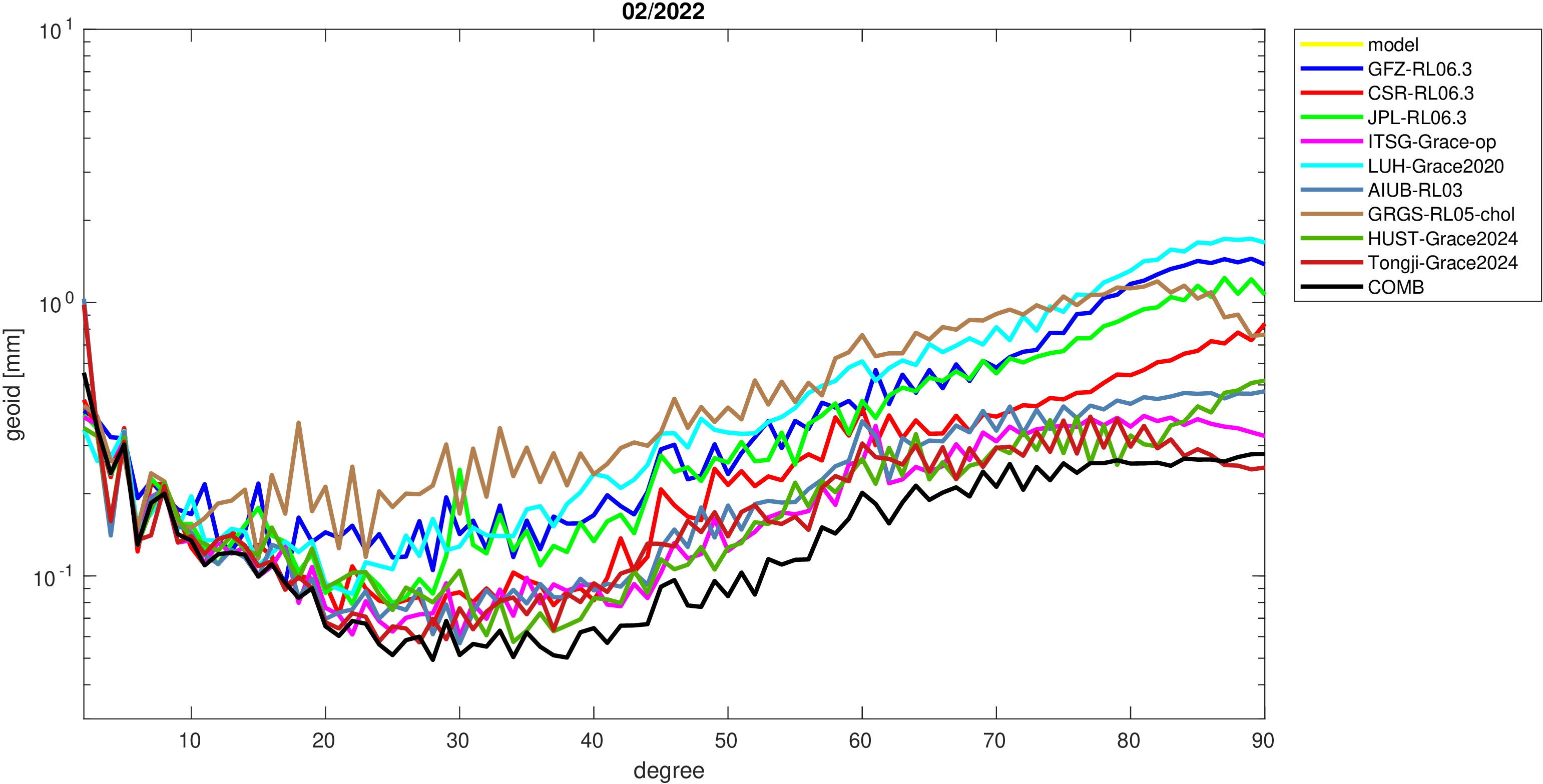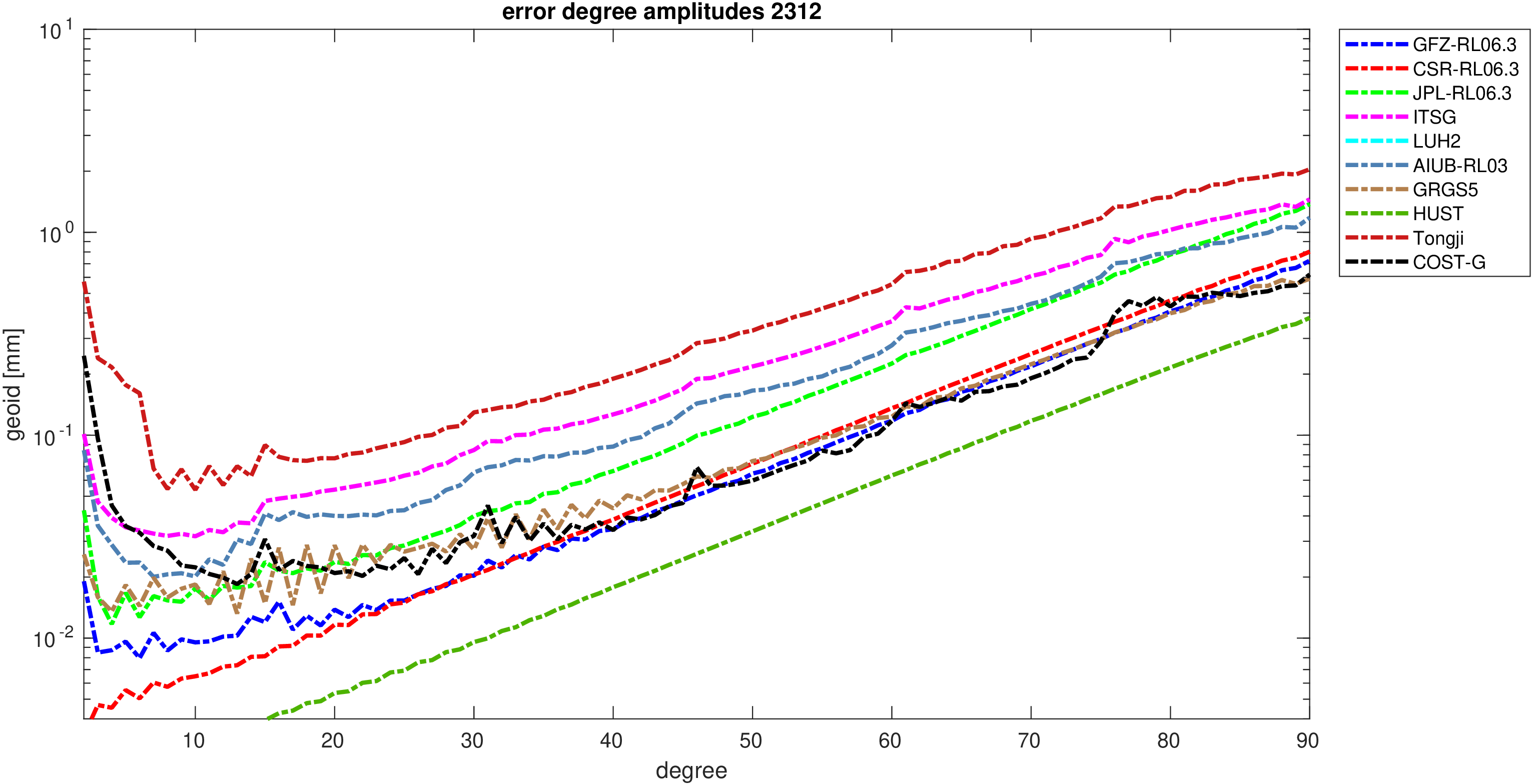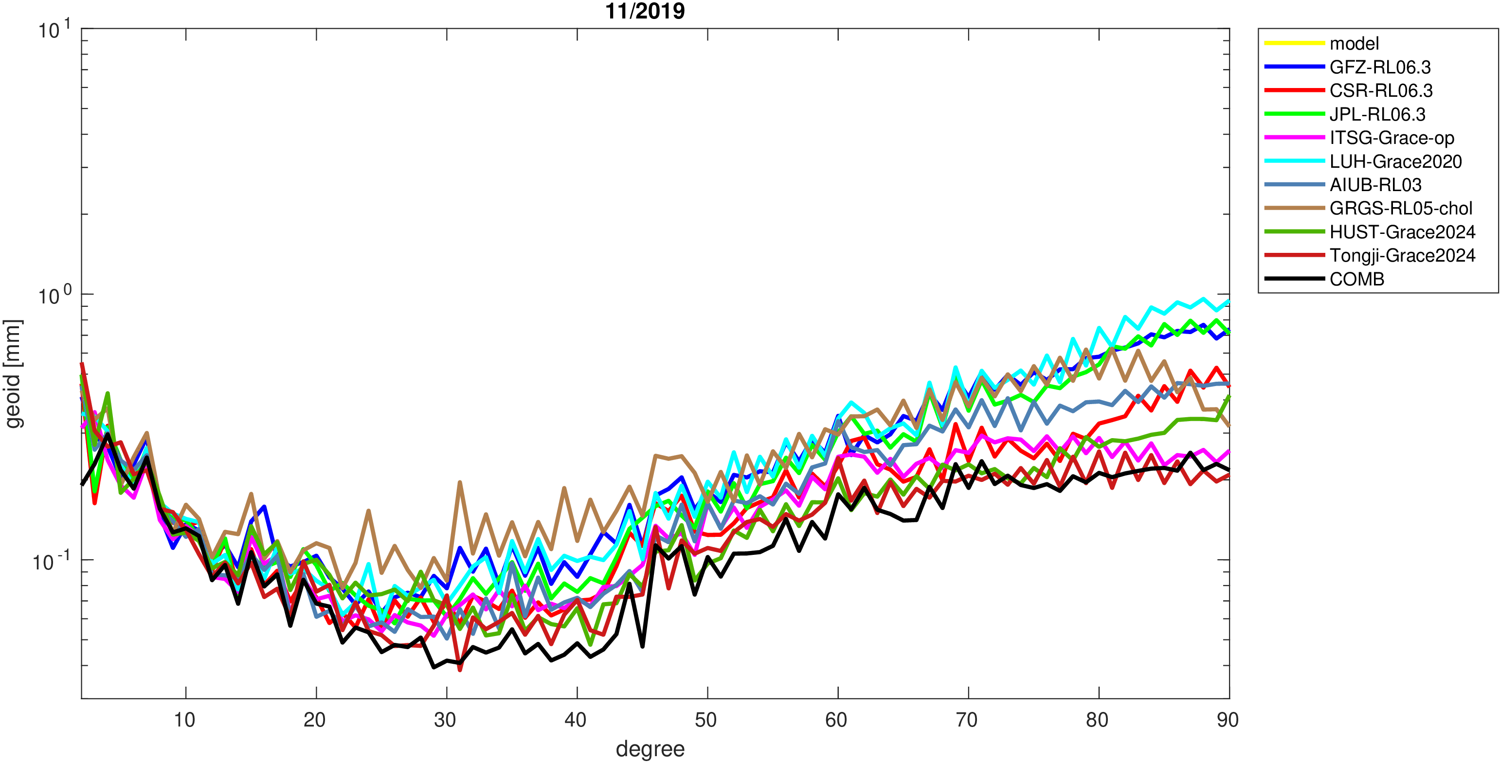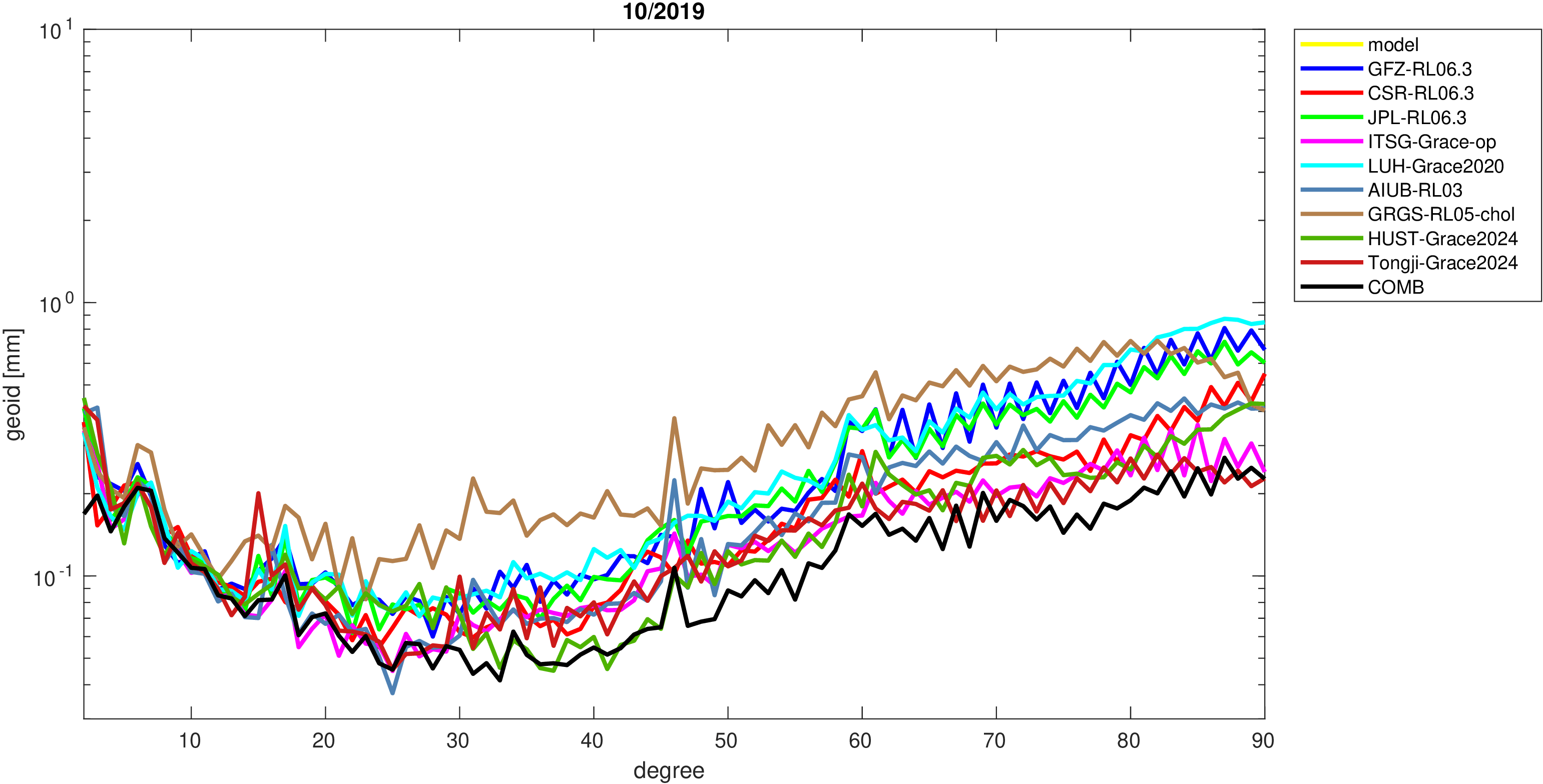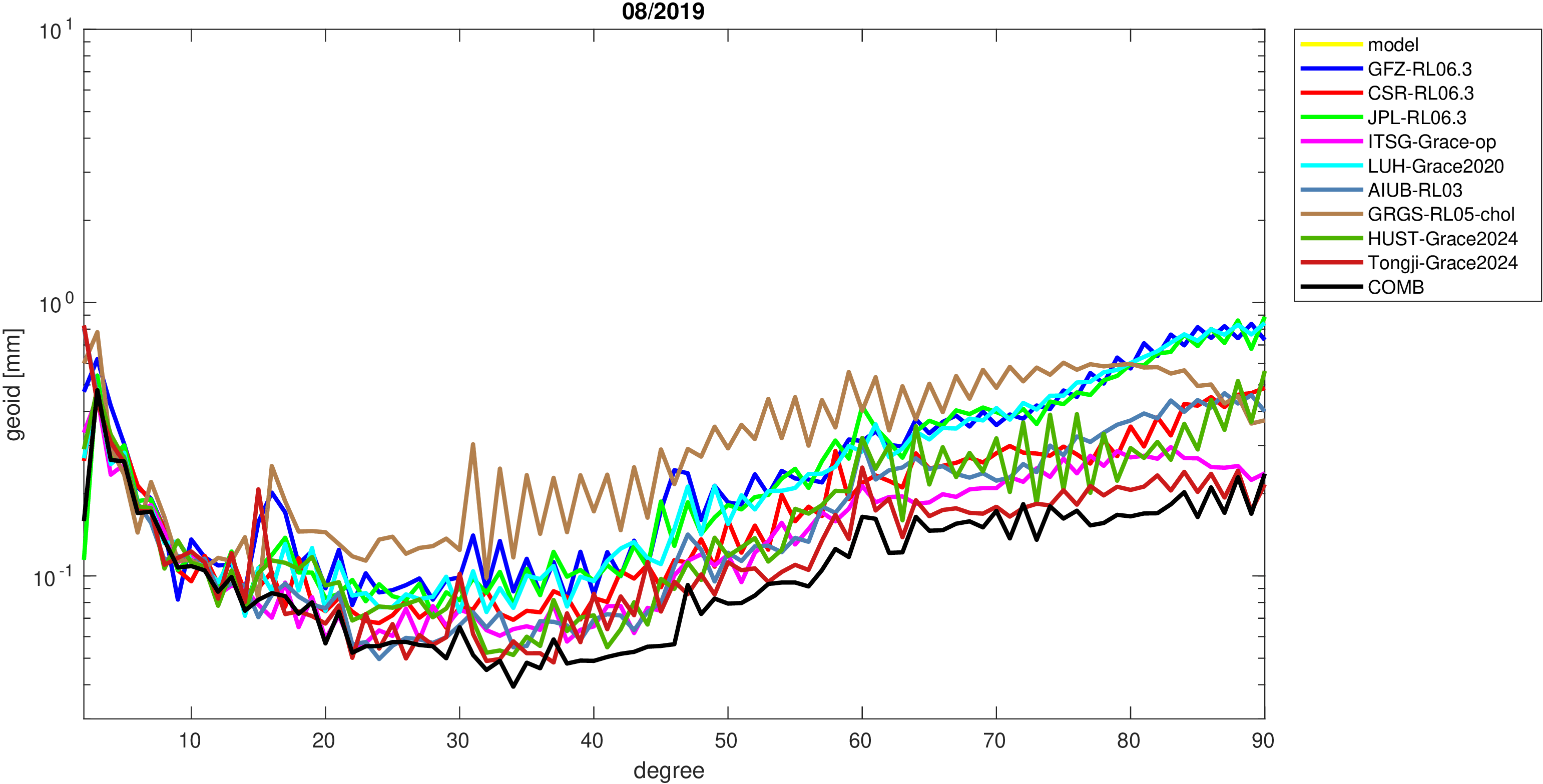 For comparisons in the spherical harmonic domain no filter is applied. Low degree anomalies are dominated by