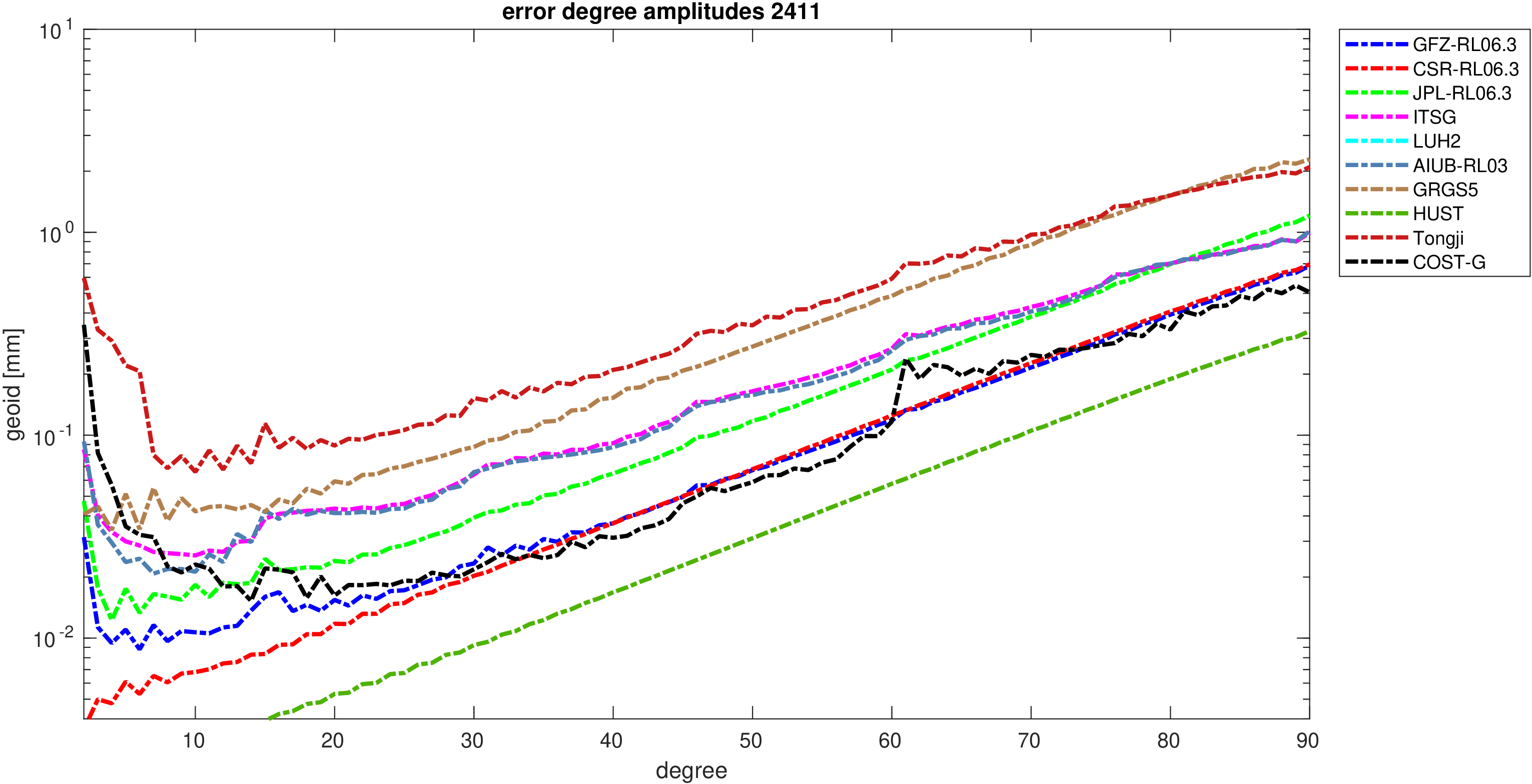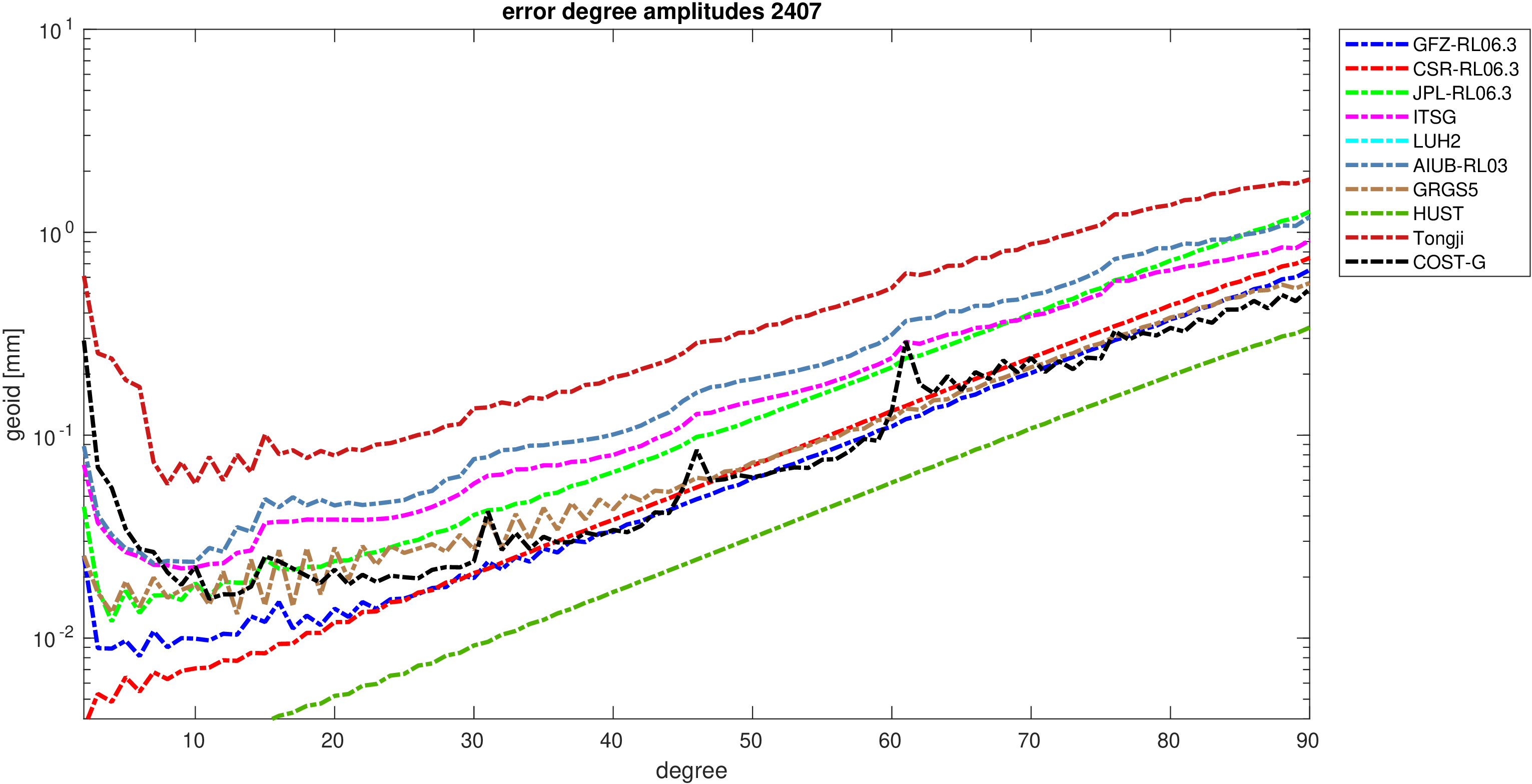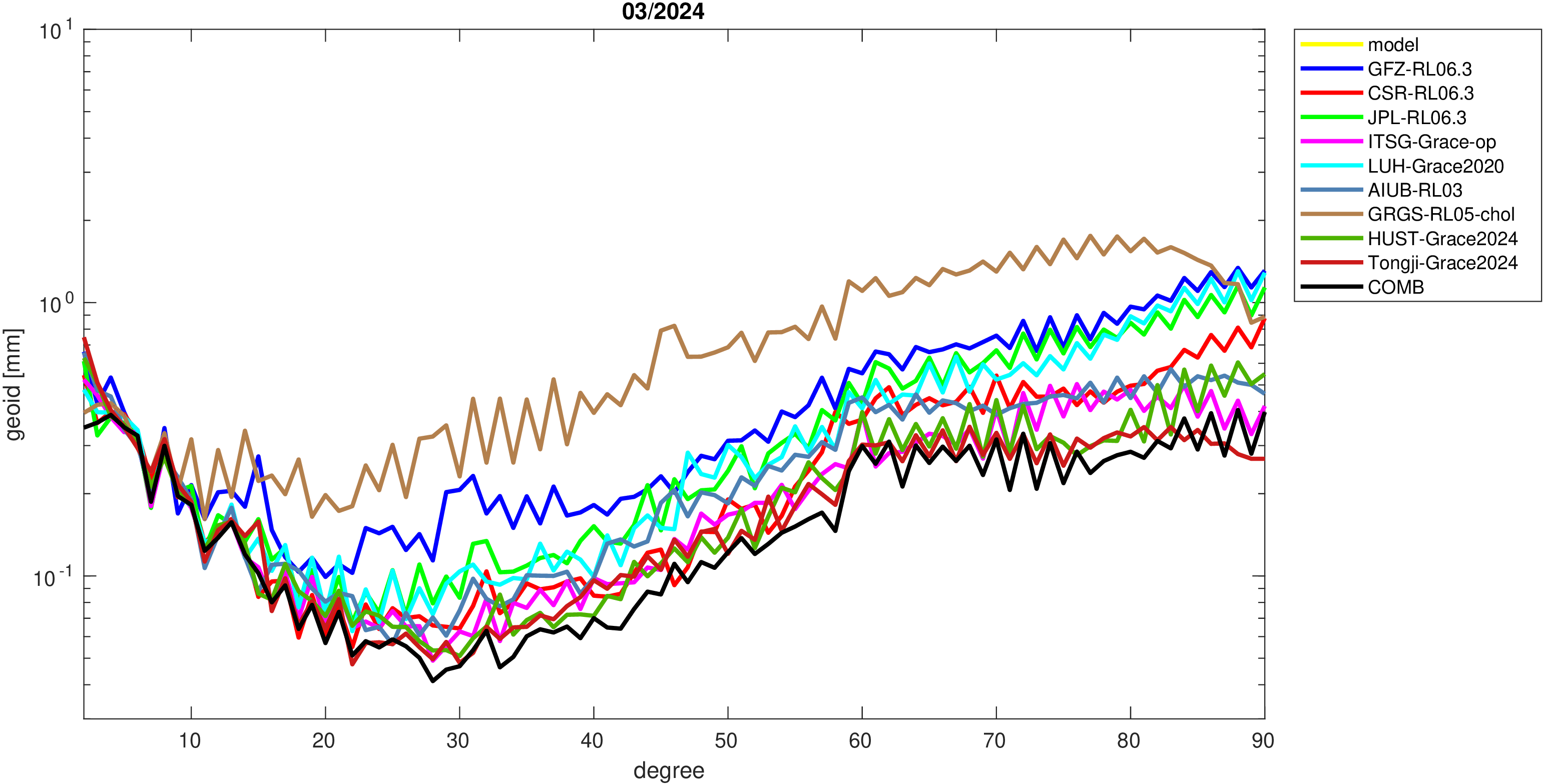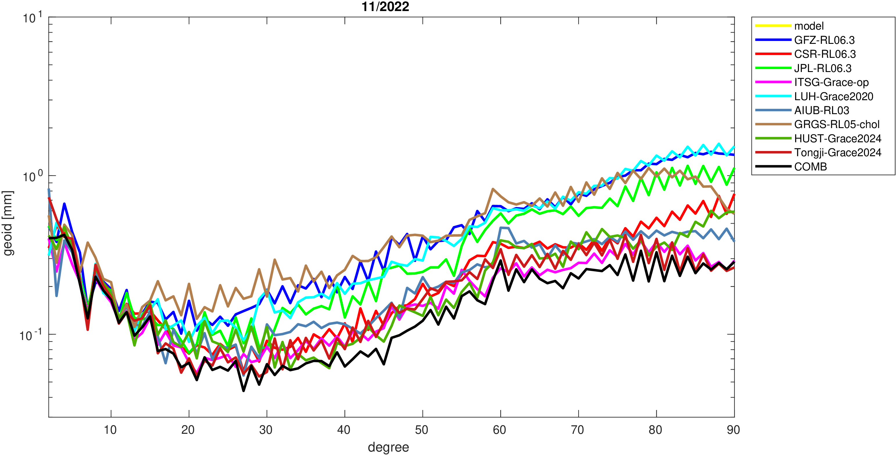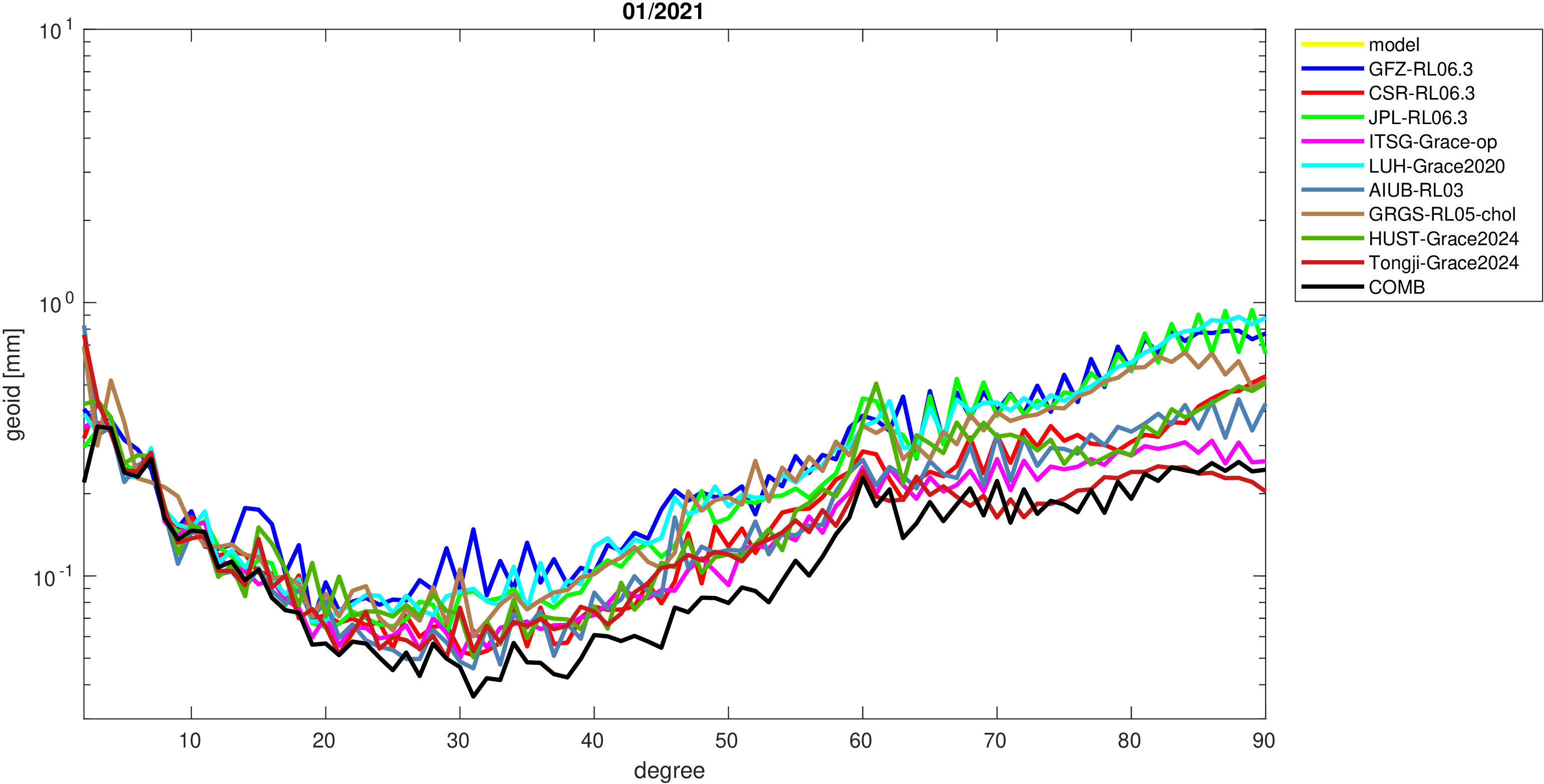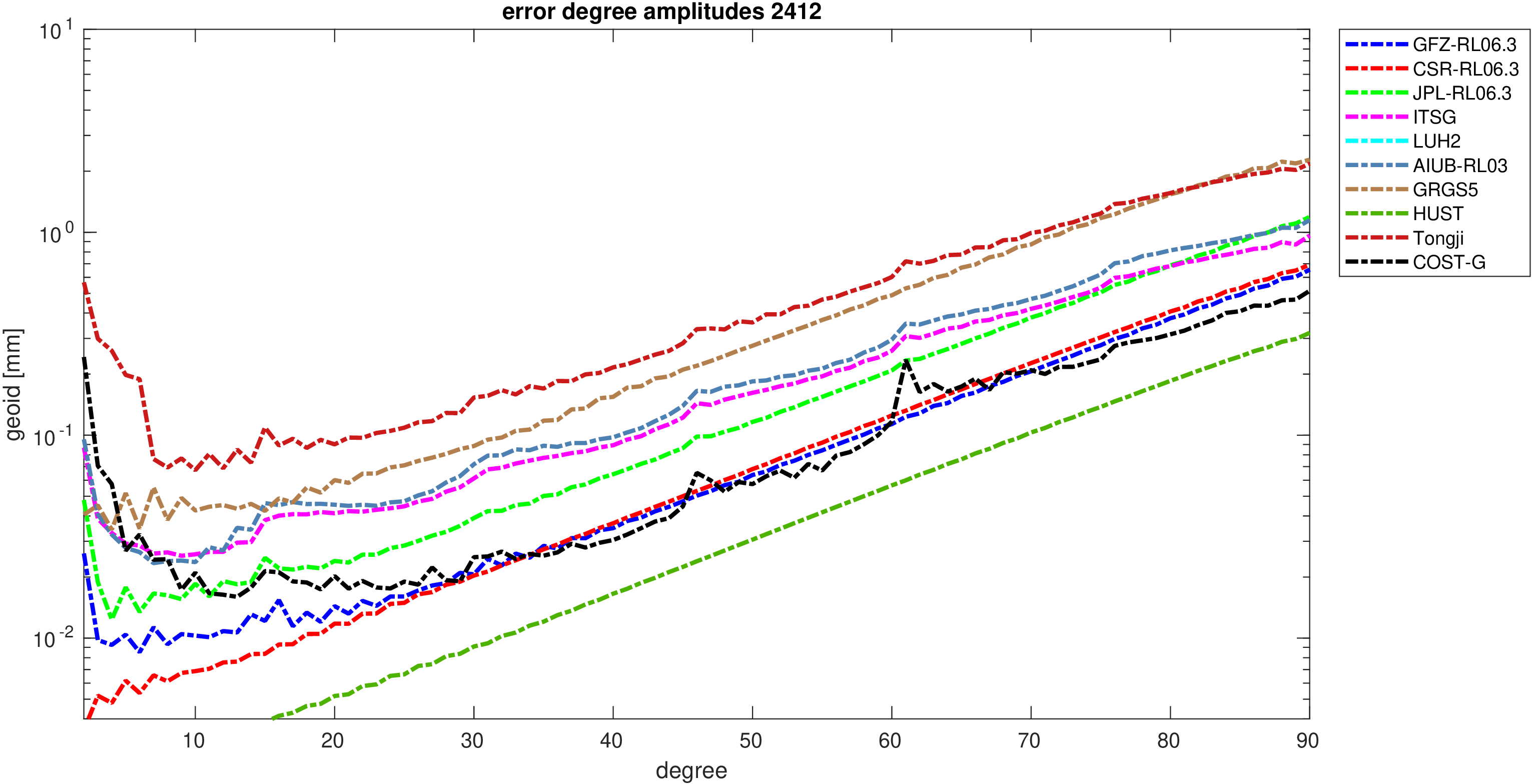 For comparisons in the spherical harmonic domain no filter is applied. Low degree anomalies are dominated by