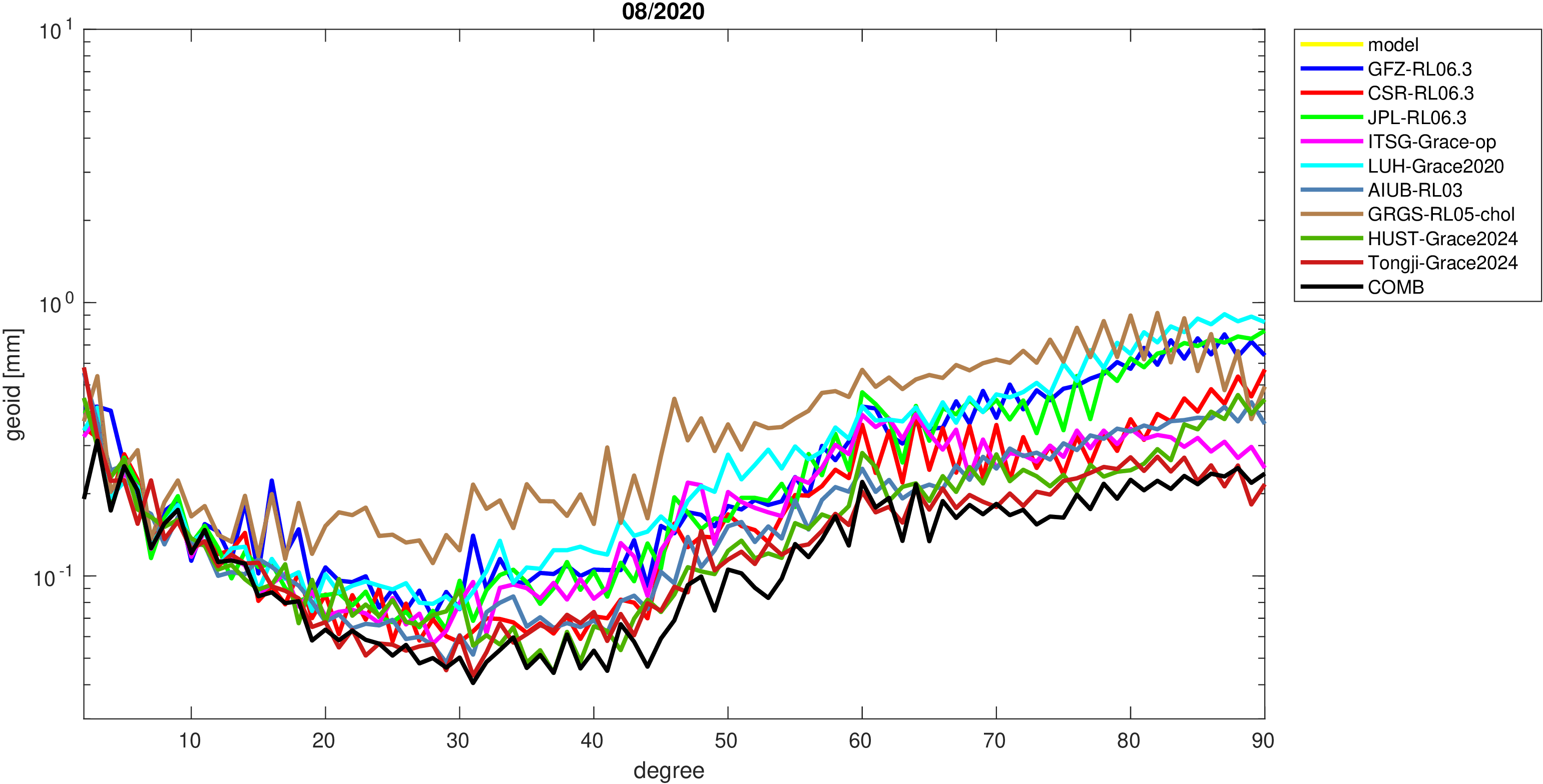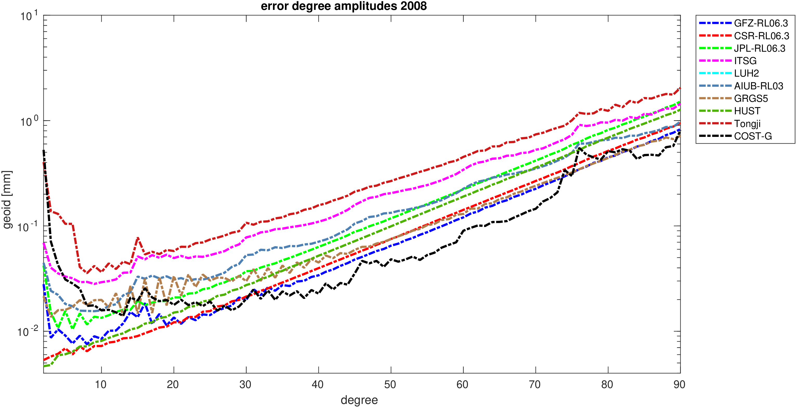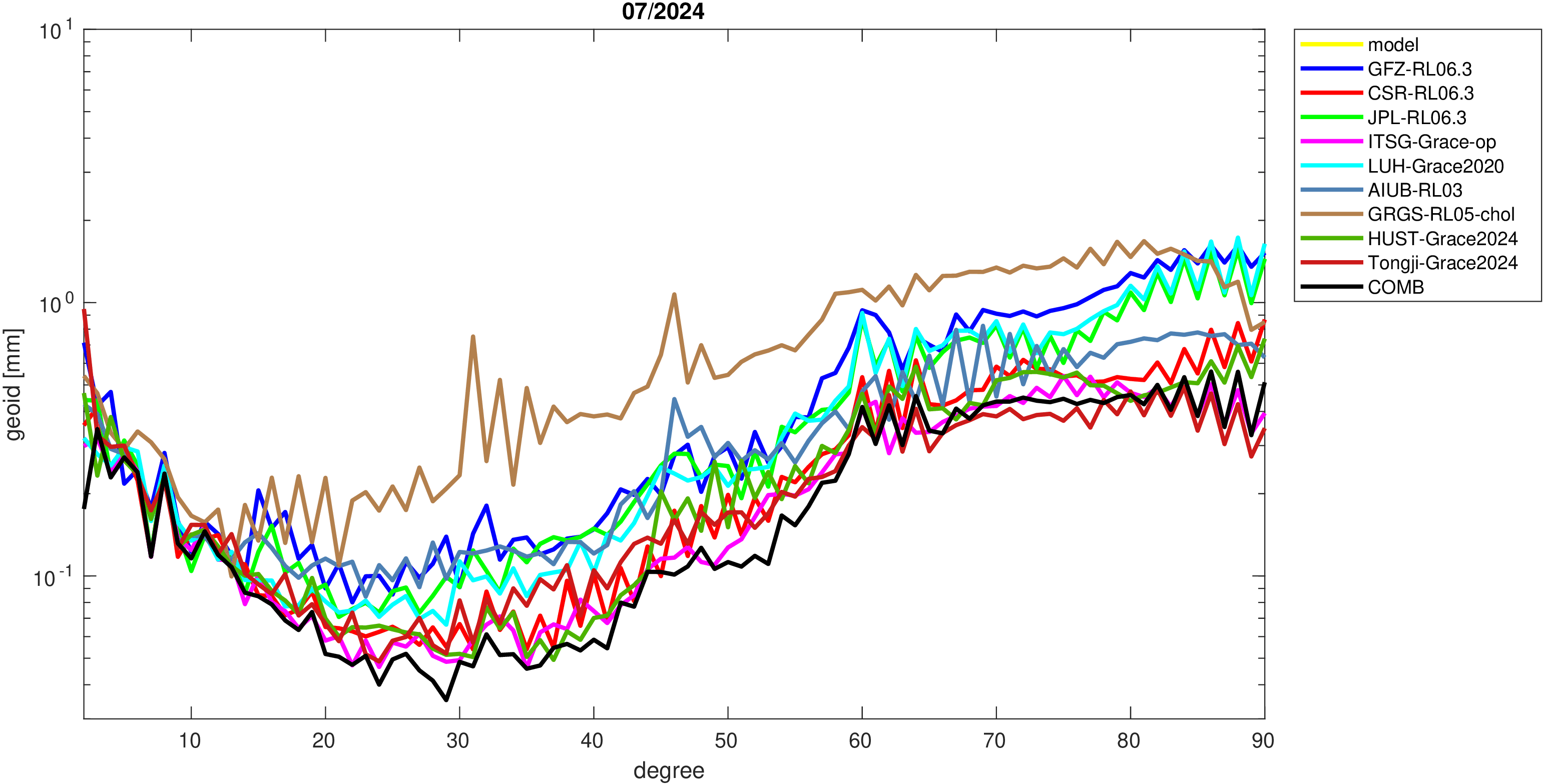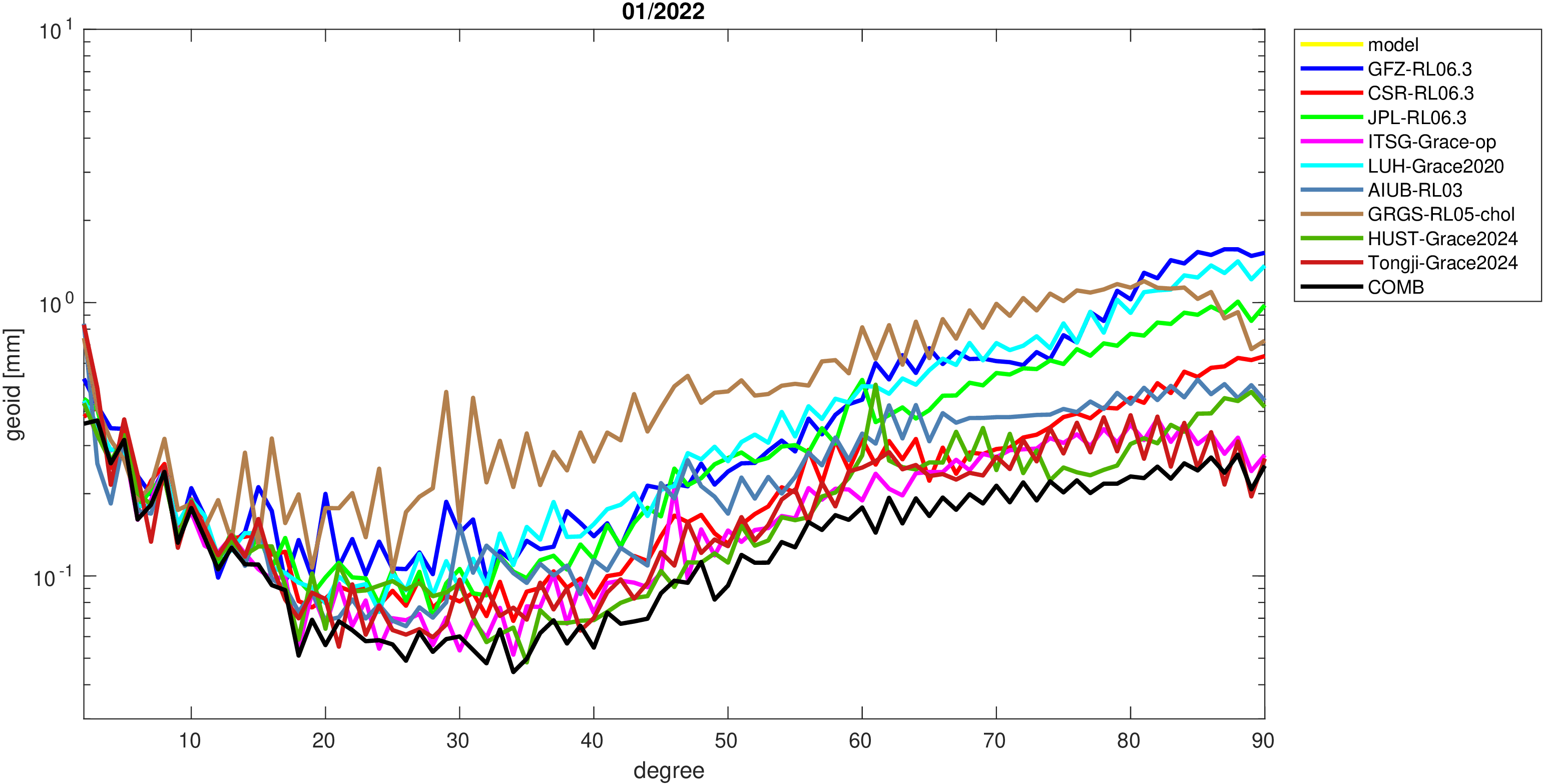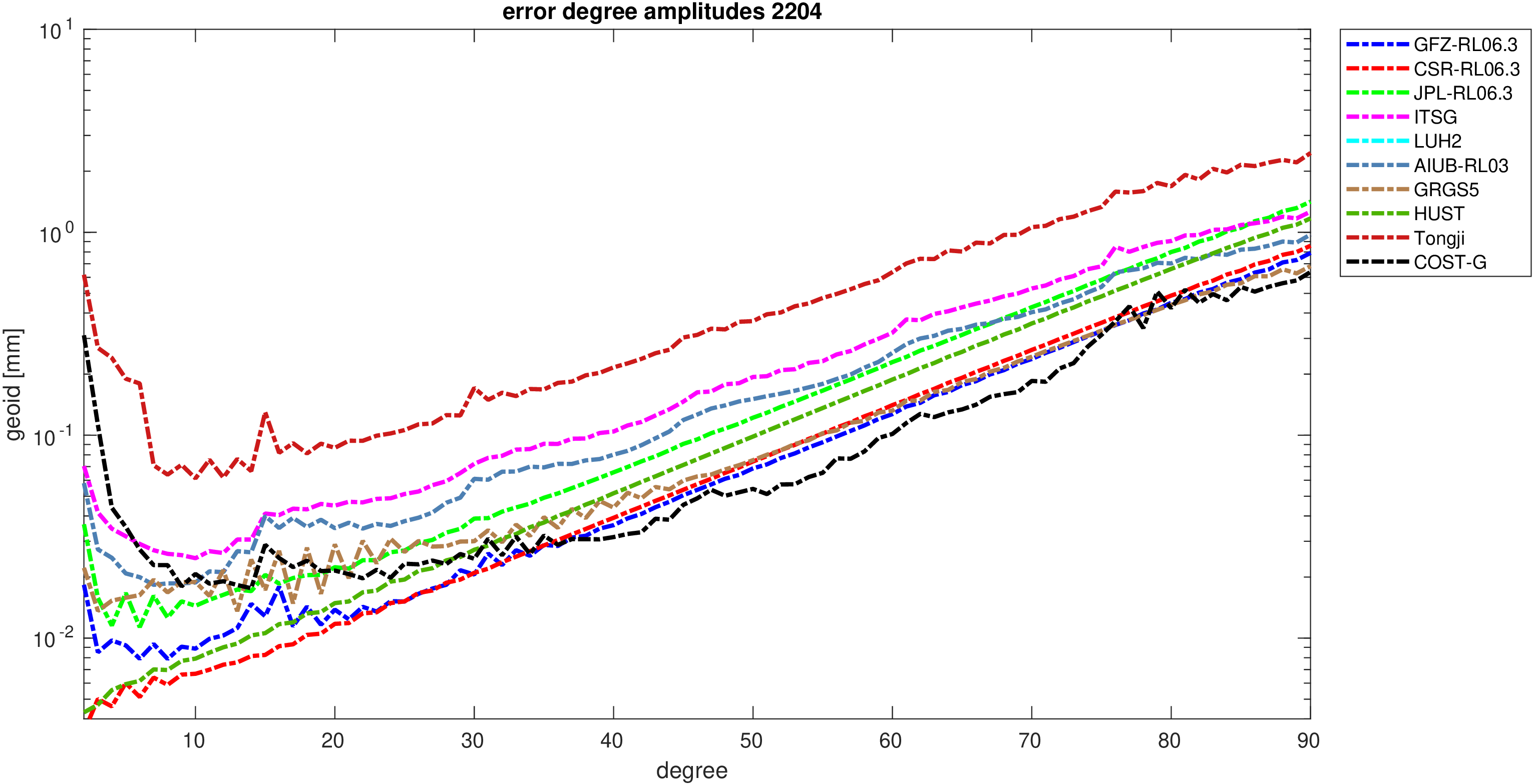 For comparisons in the spherical harmonic domain no filter is applied. Low degree anomalies are dominated by