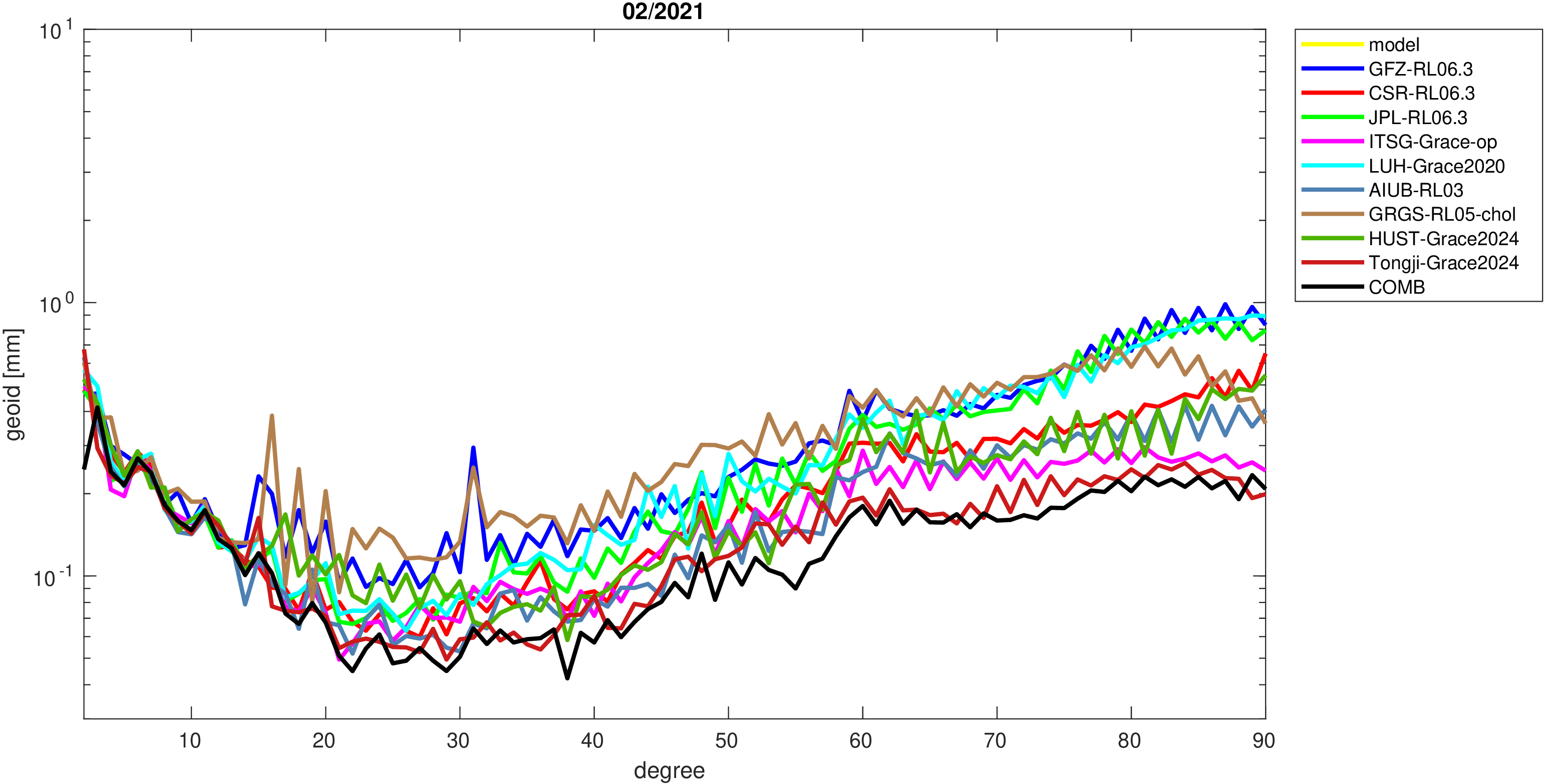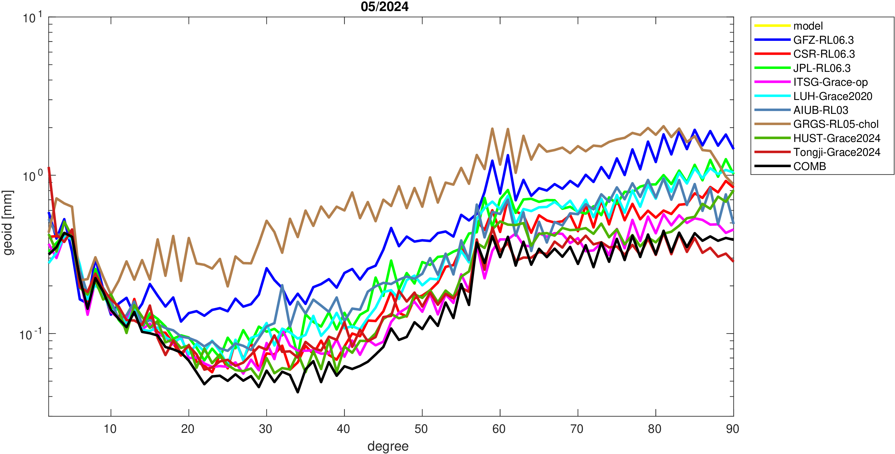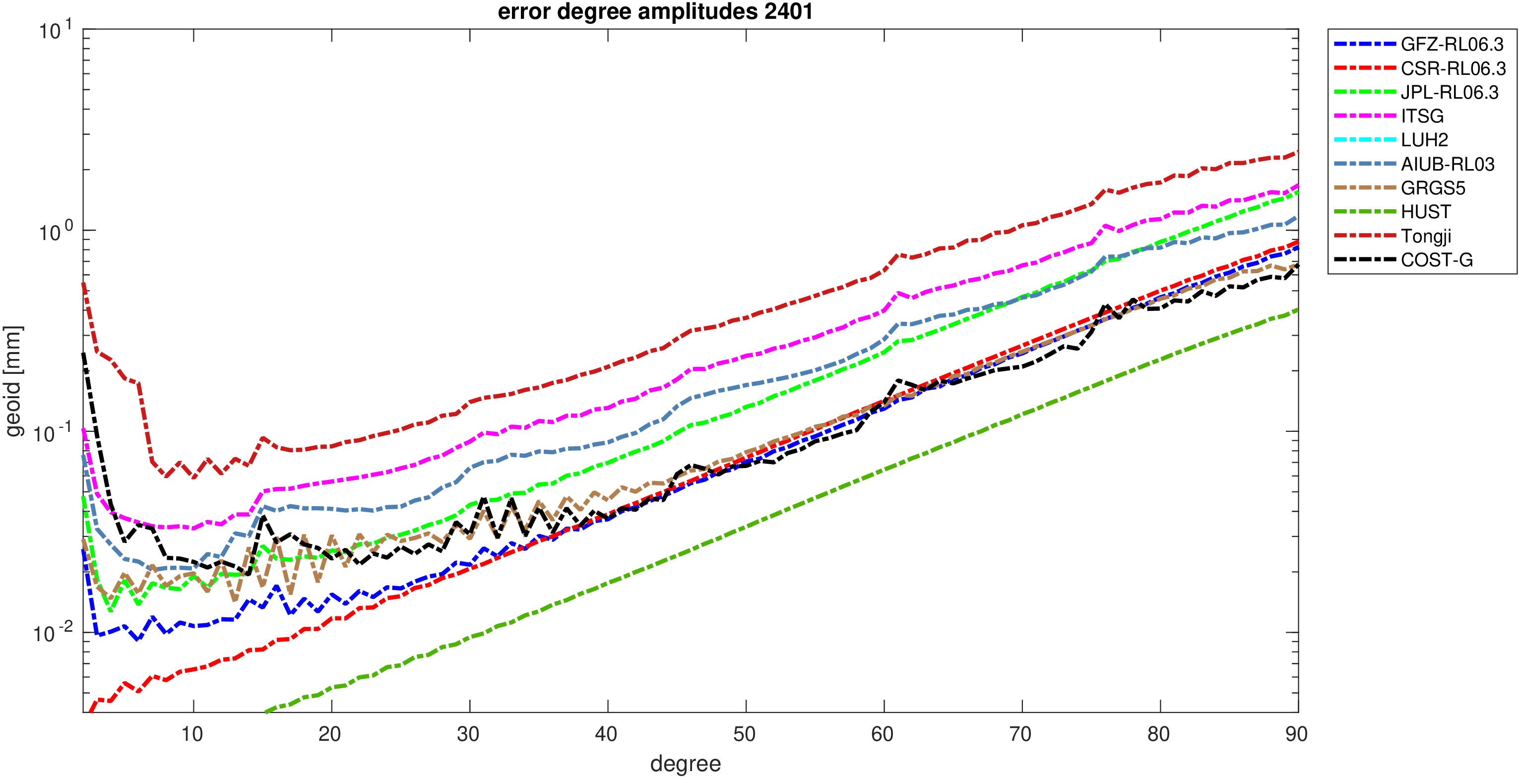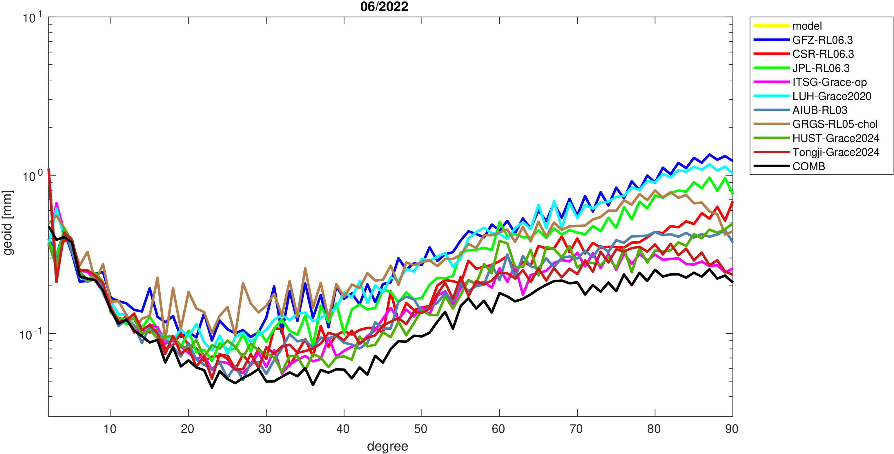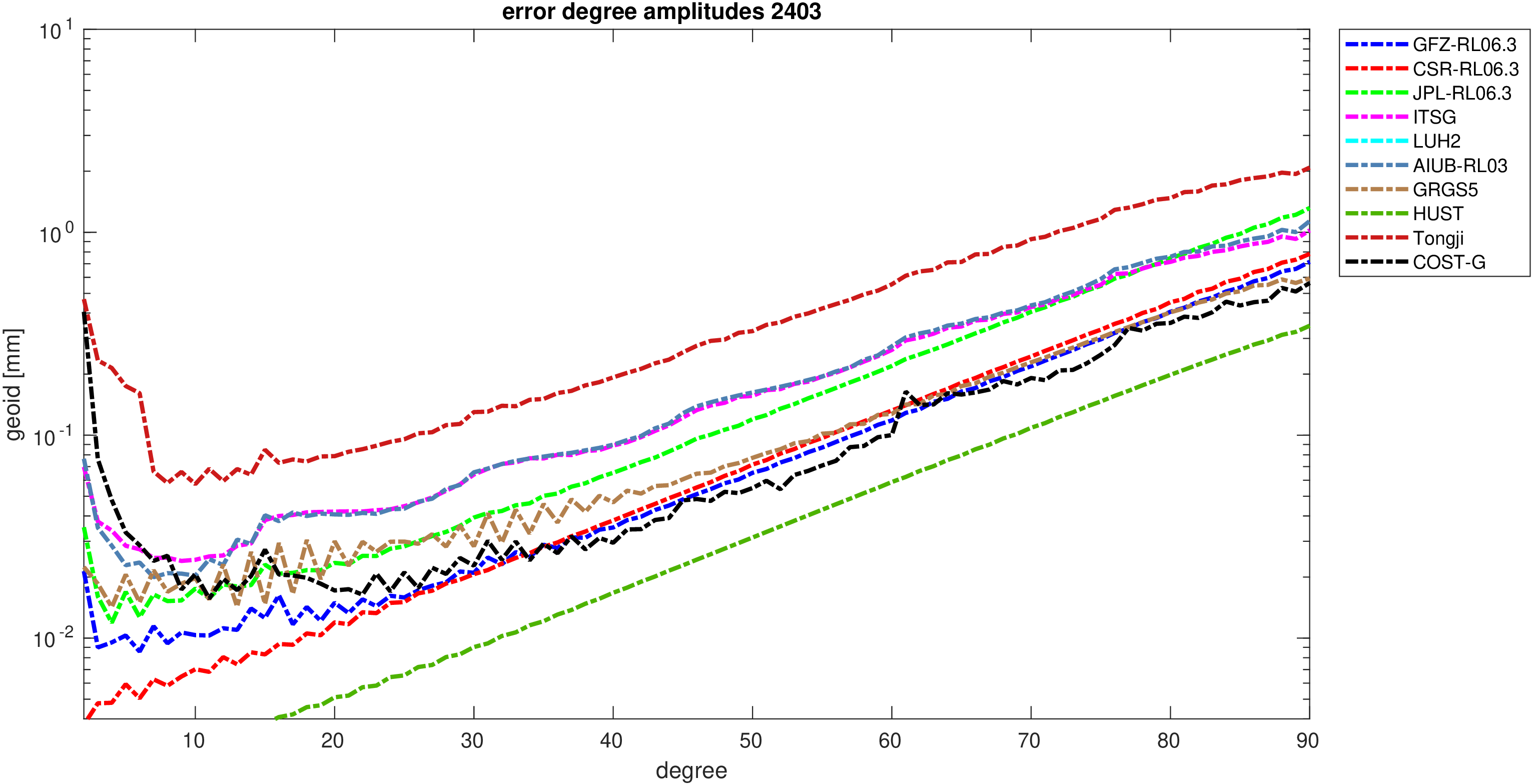 For comparisons in the spherical harmonic domain no filter is applied. Low degree anomalies are dominated by