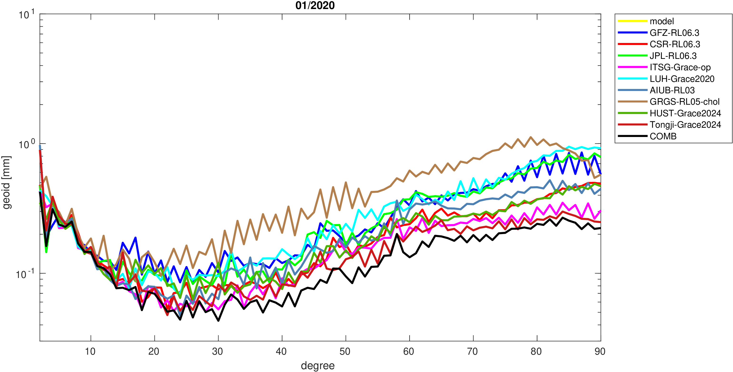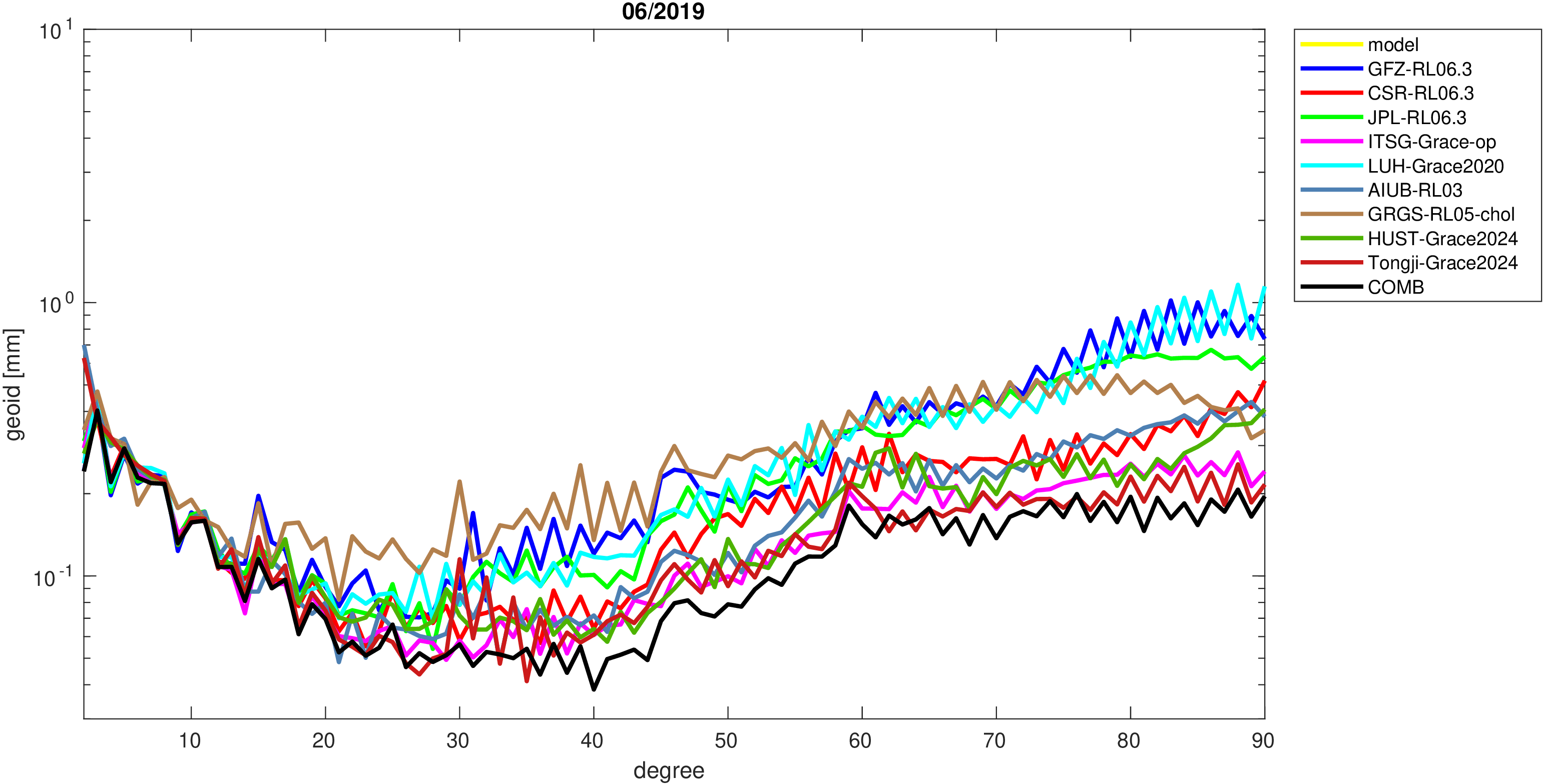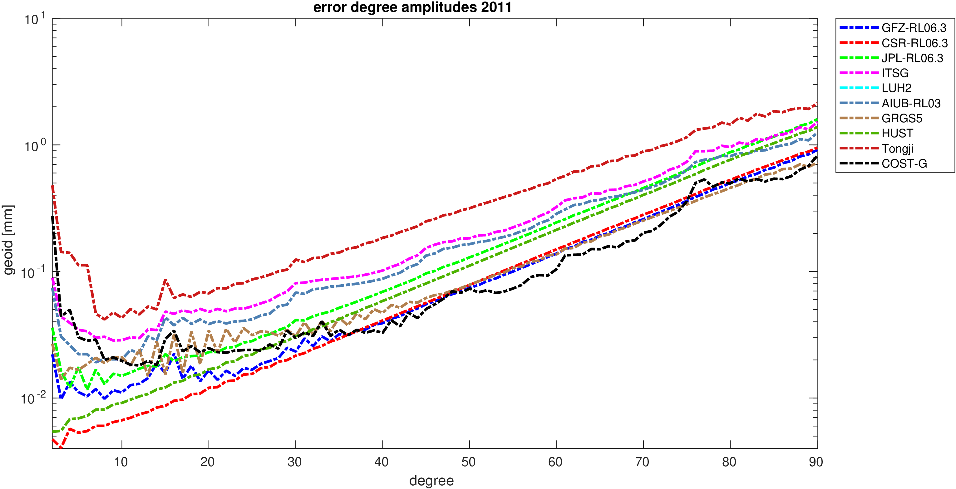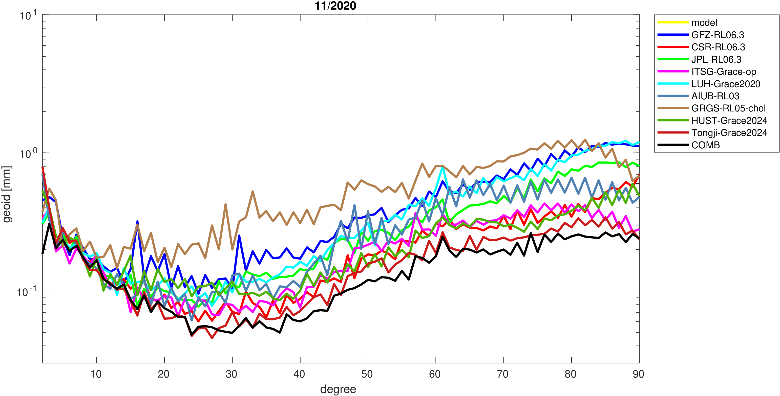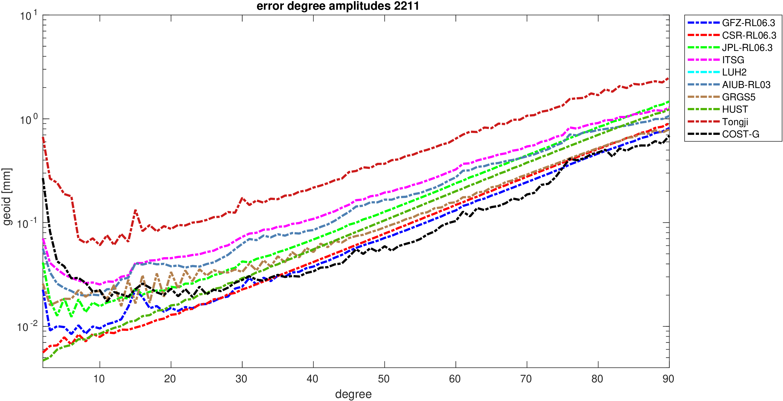 For comparisons in the spherical harmonic domain no filter is applied. Low degree anomalies are dominated by