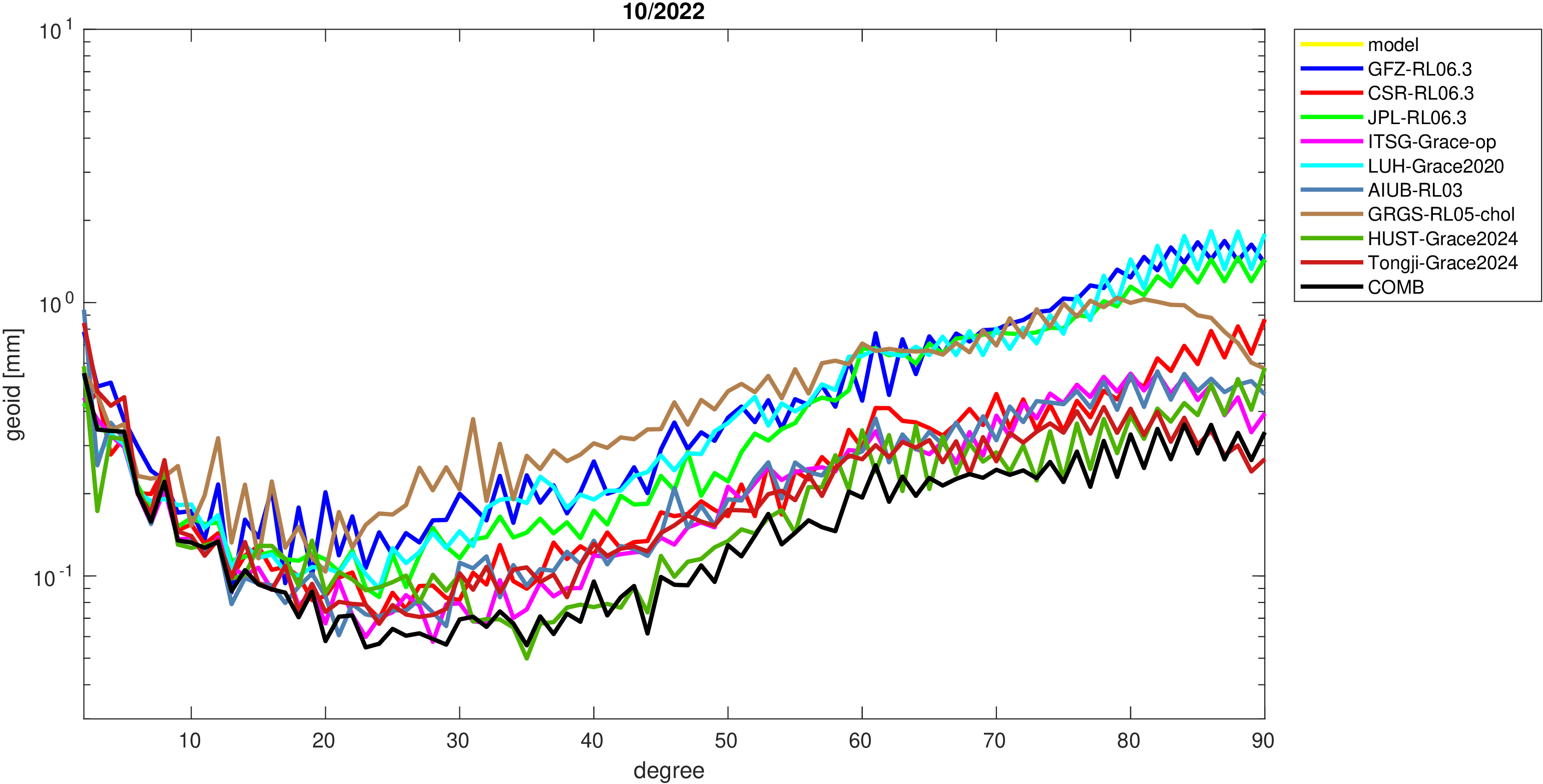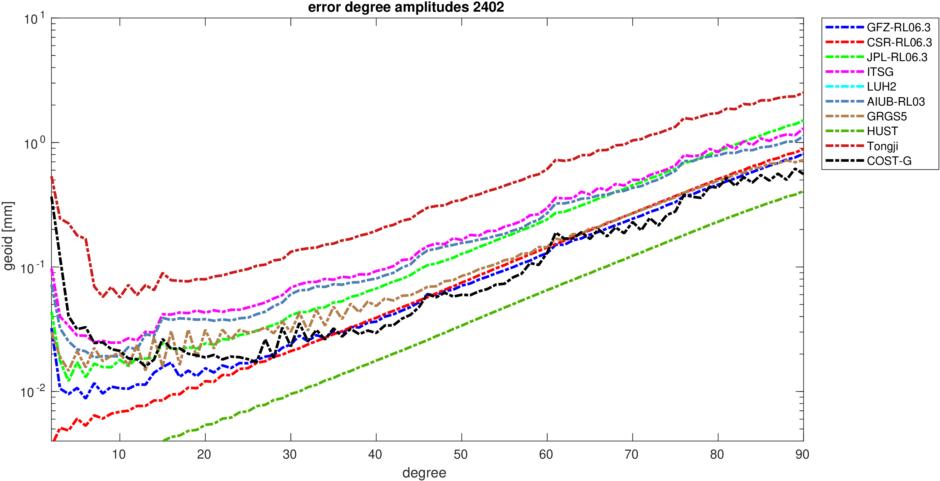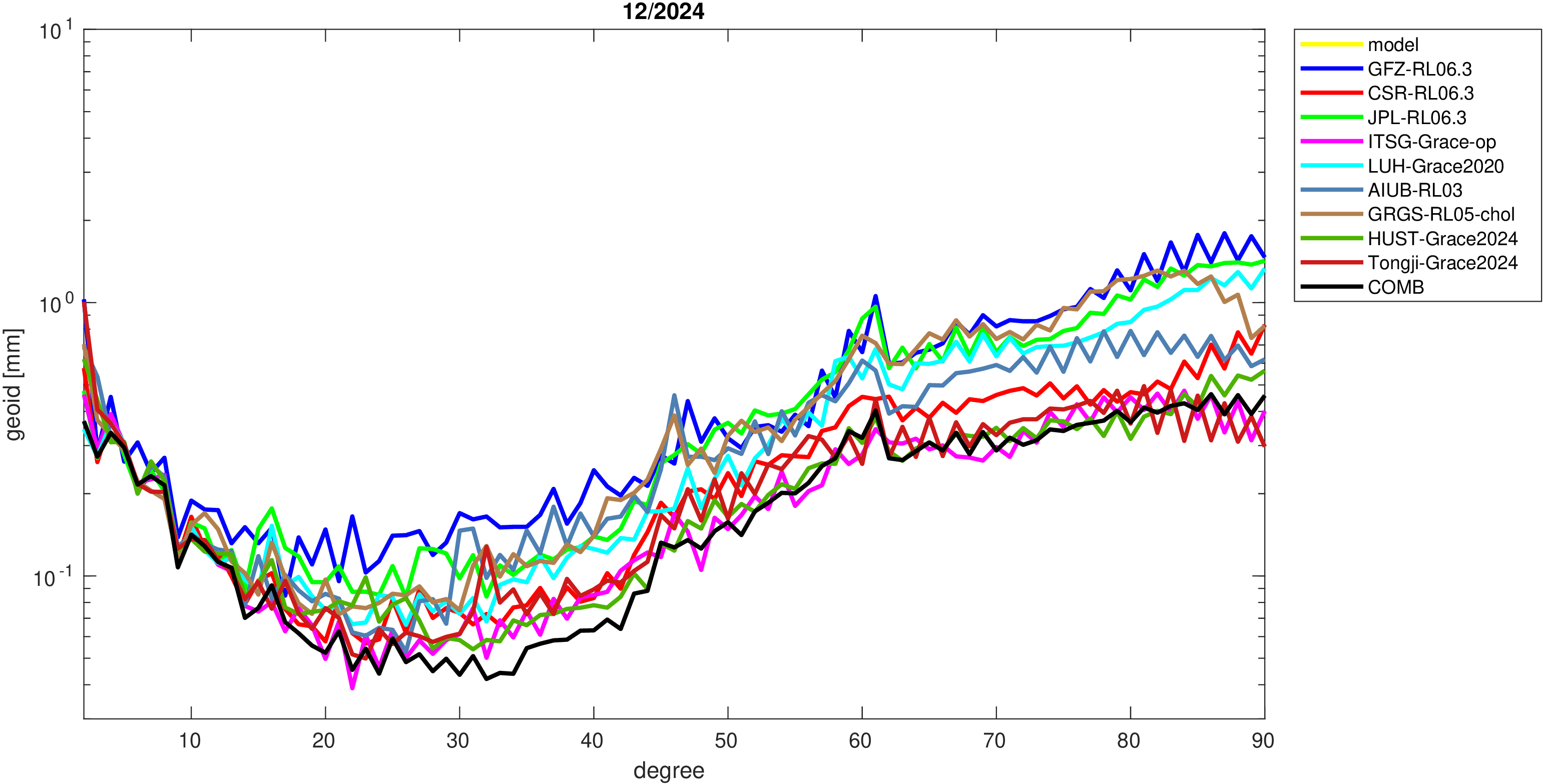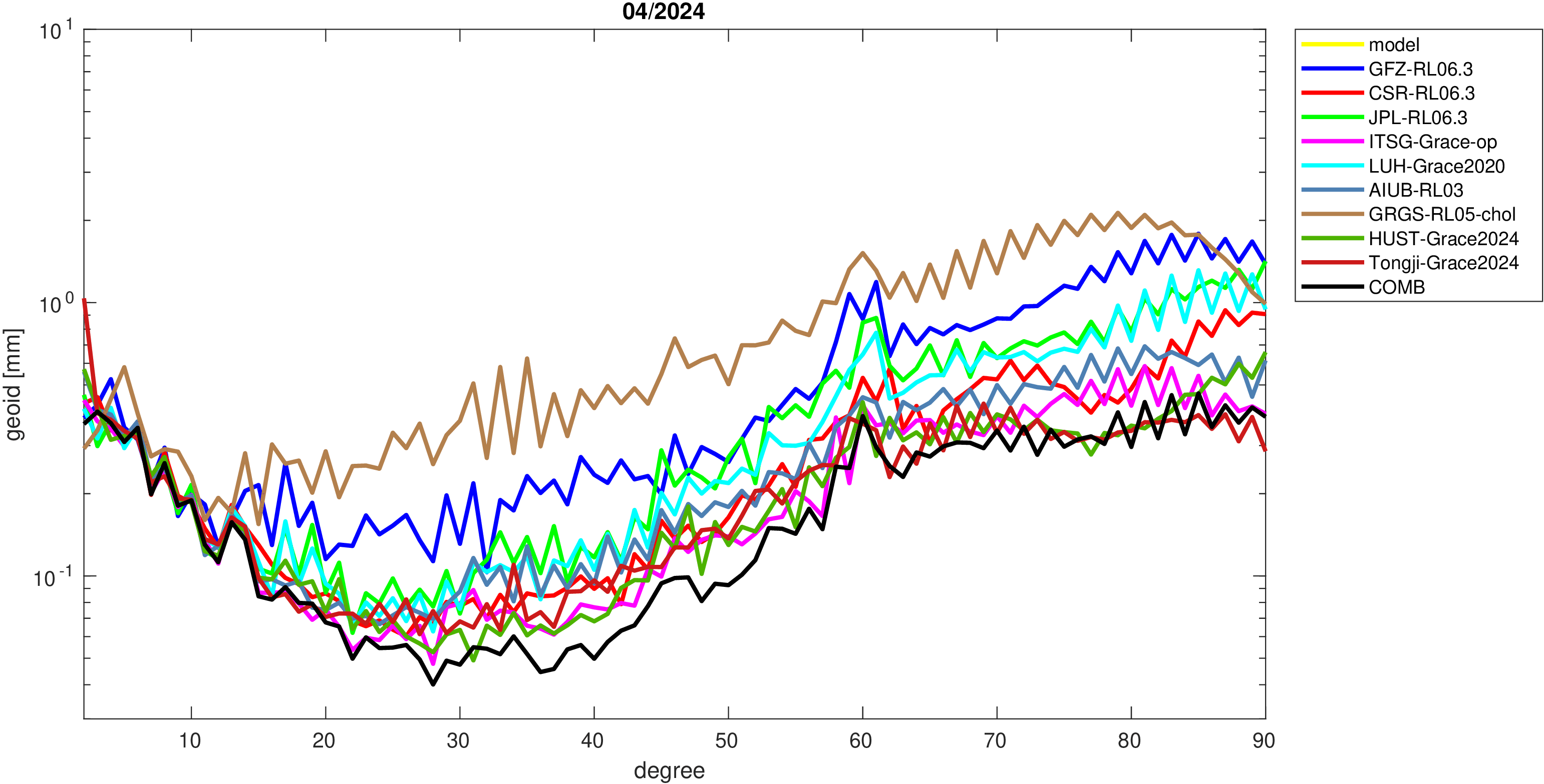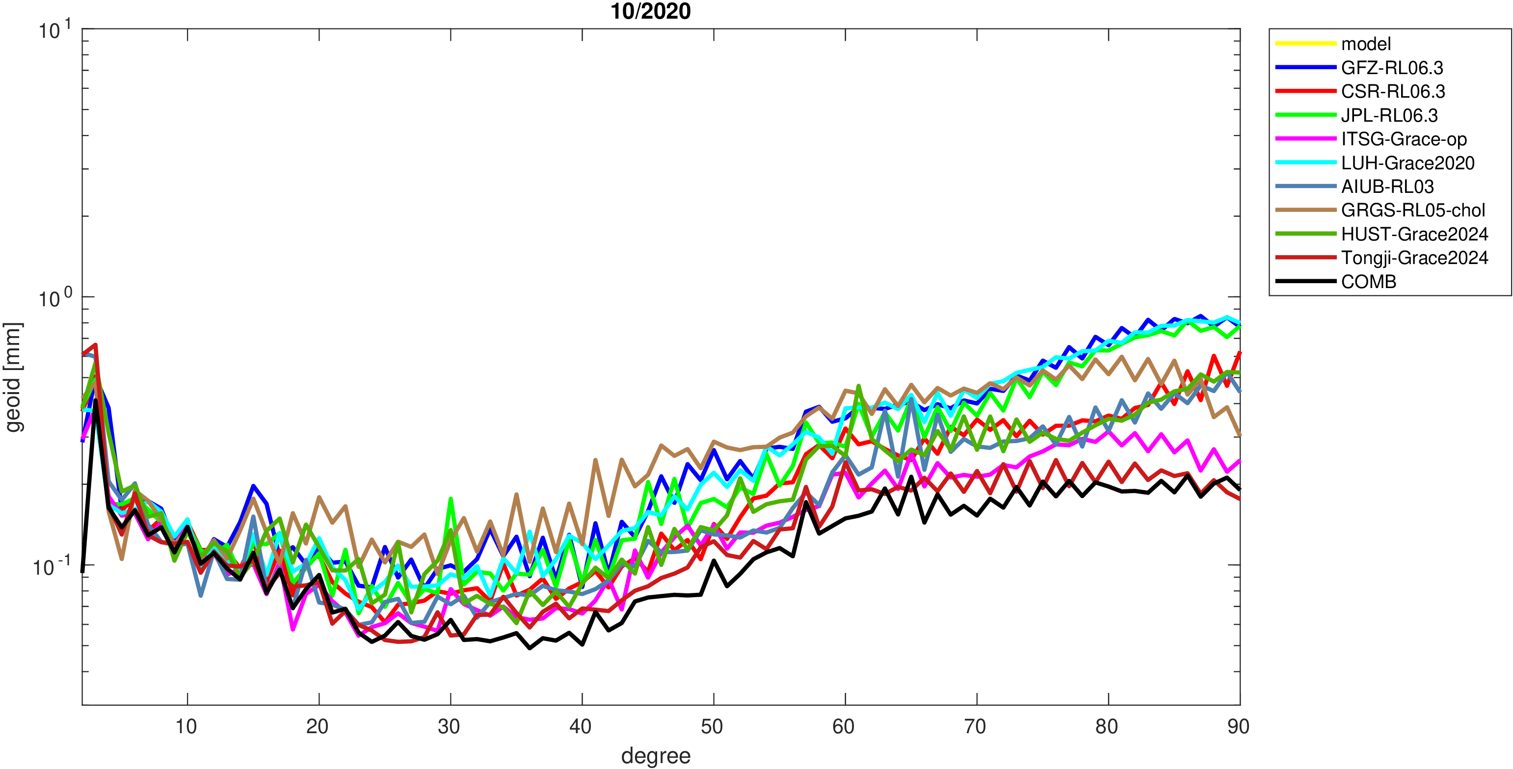 For comparisons in the spherical harmonic domain no filter is applied. Low degree anomalies are dominated by