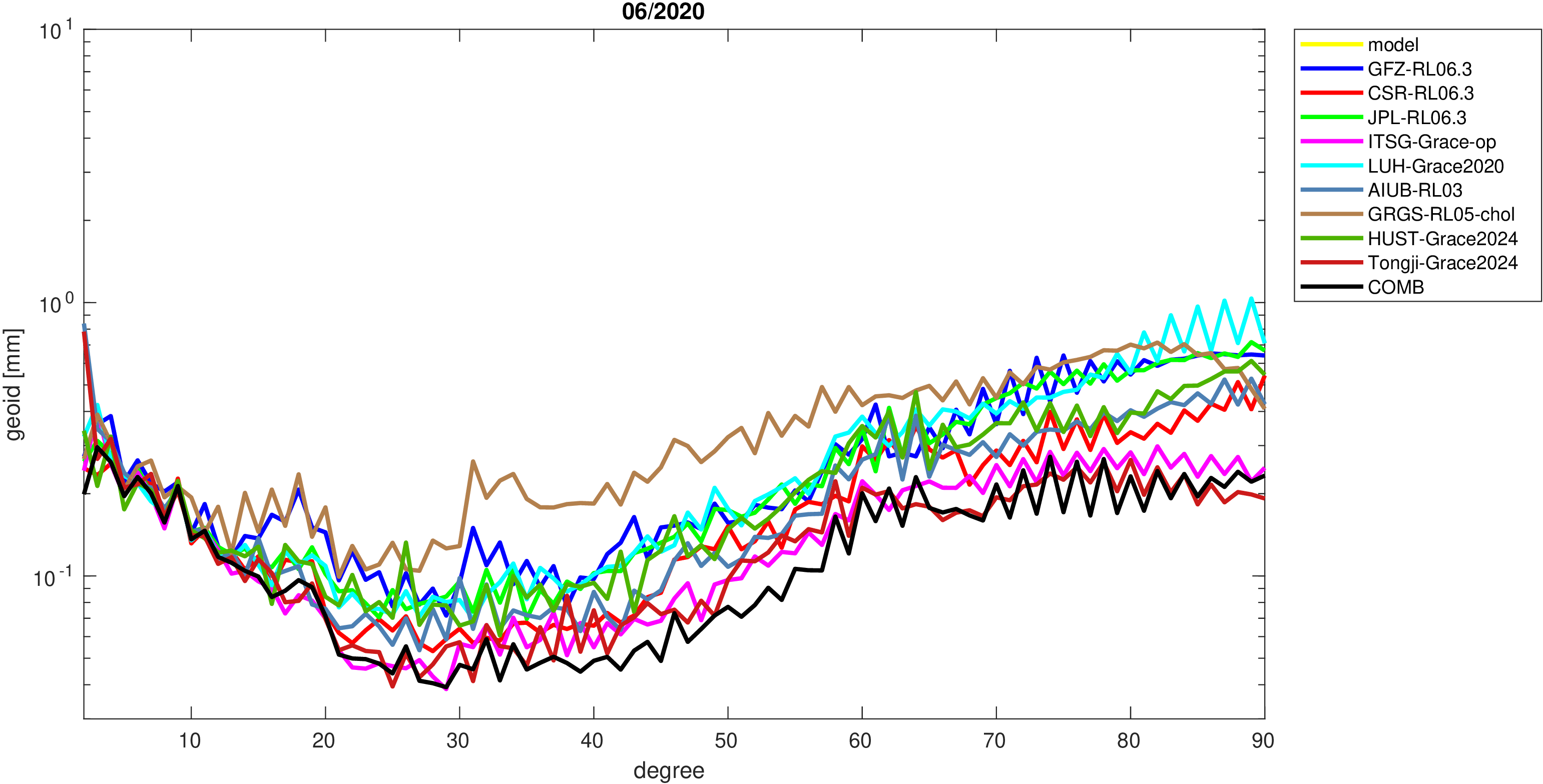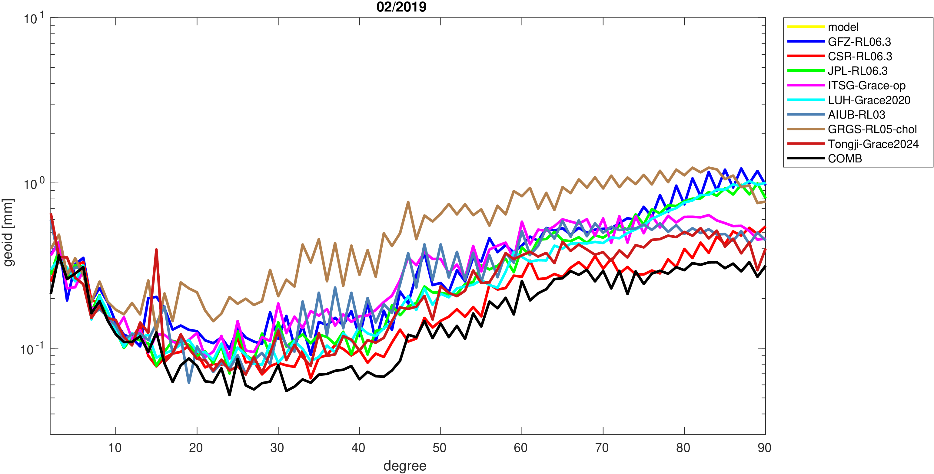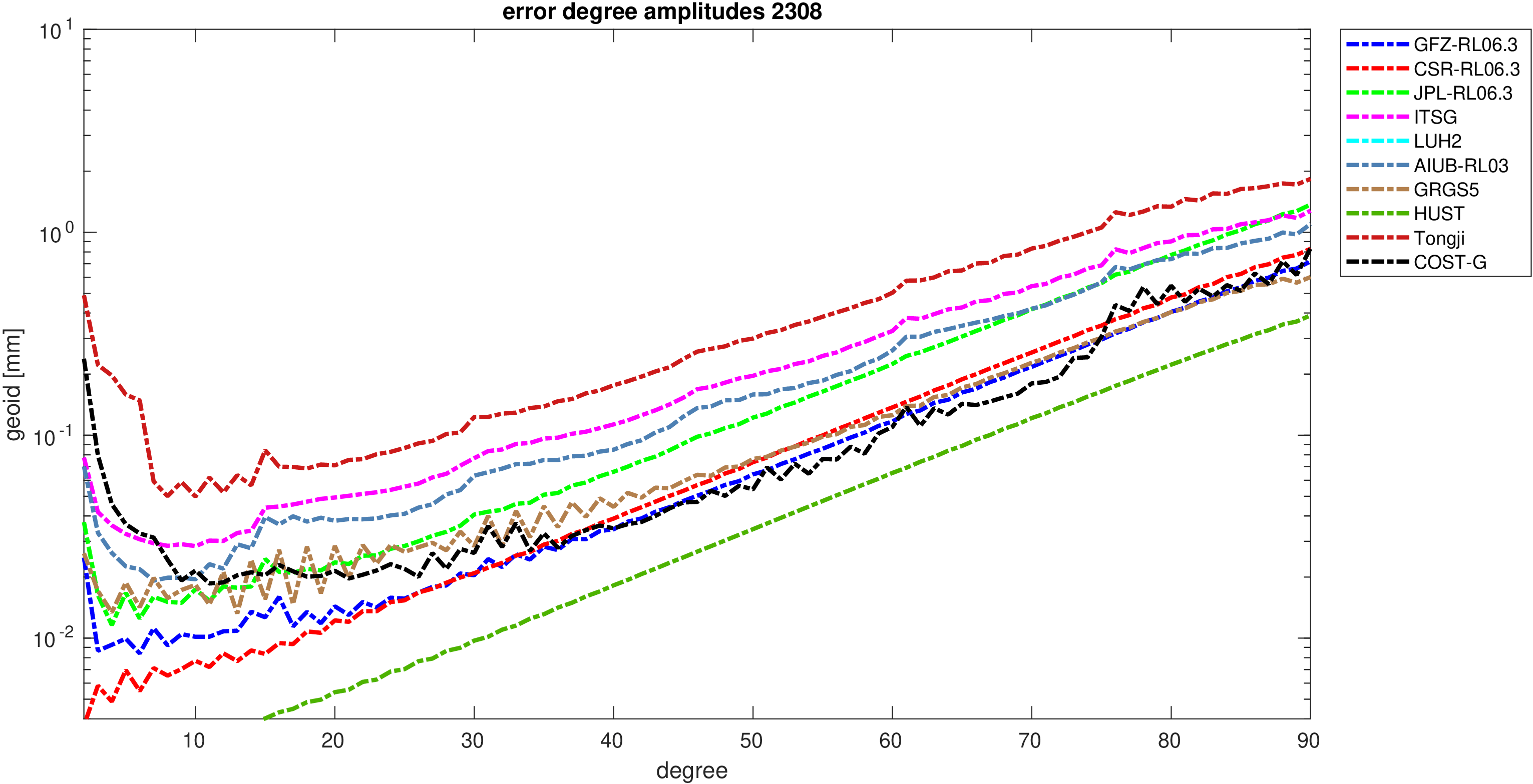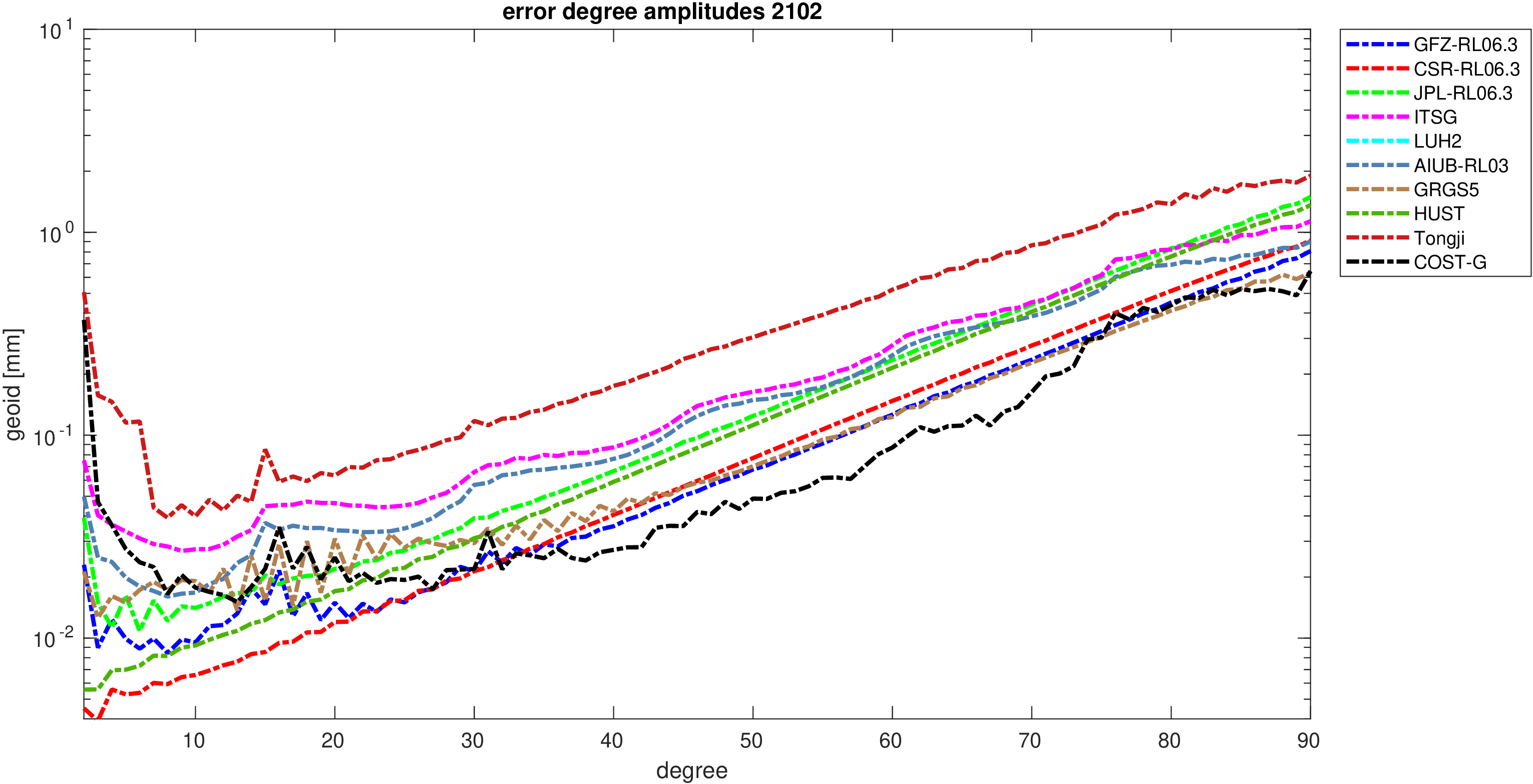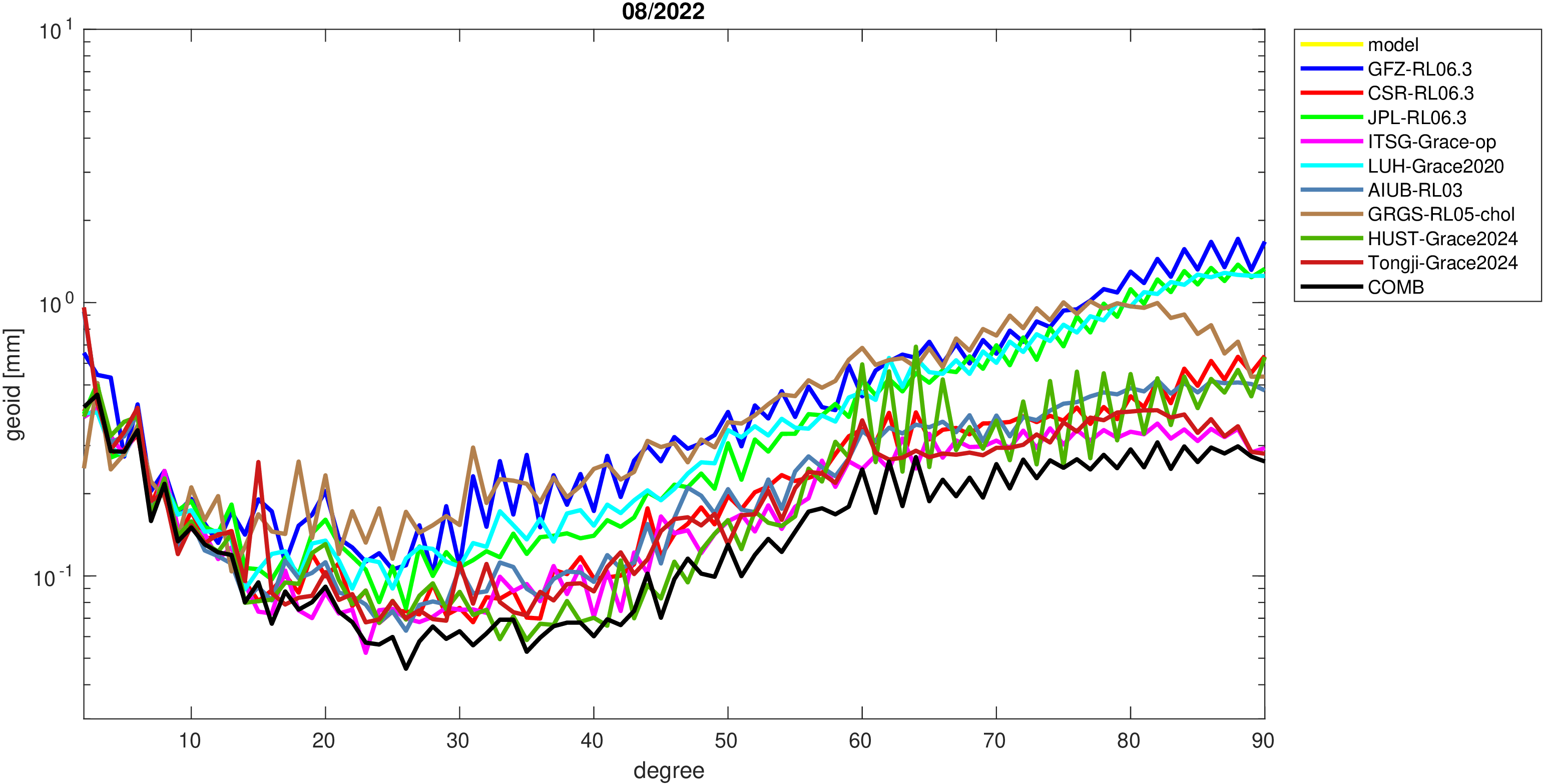 For comparisons in the spherical harmonic domain no filter is applied. Low degree anomalies are dominated by
