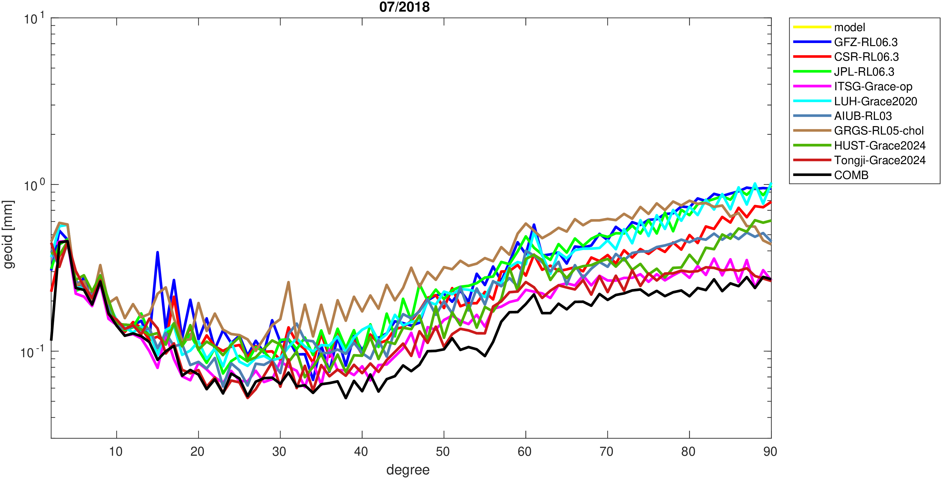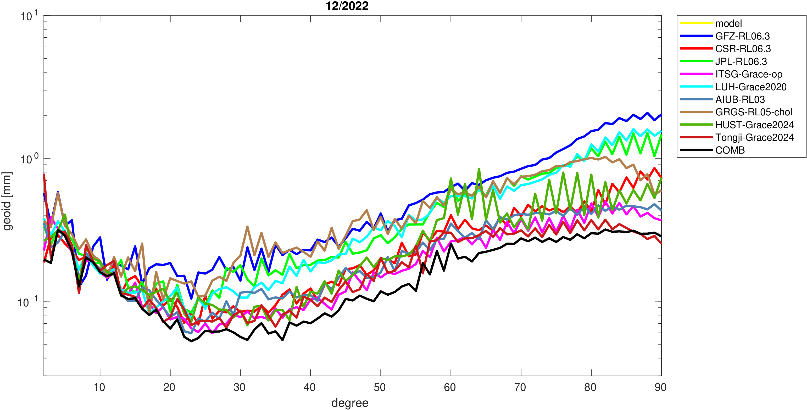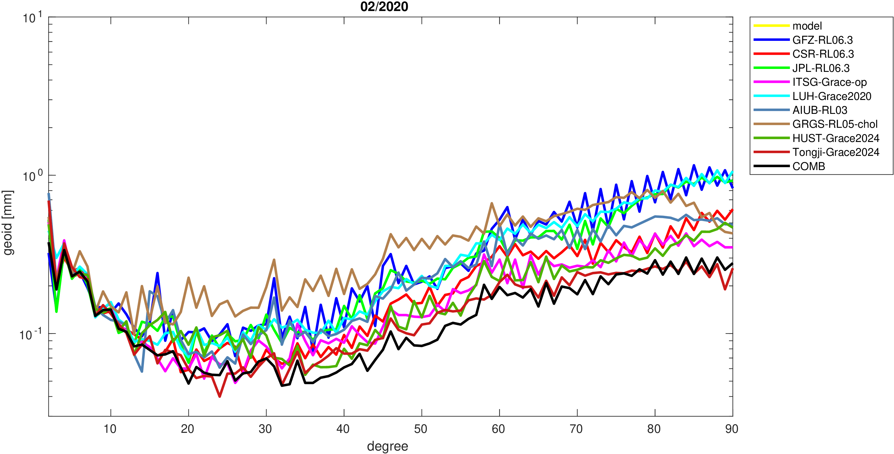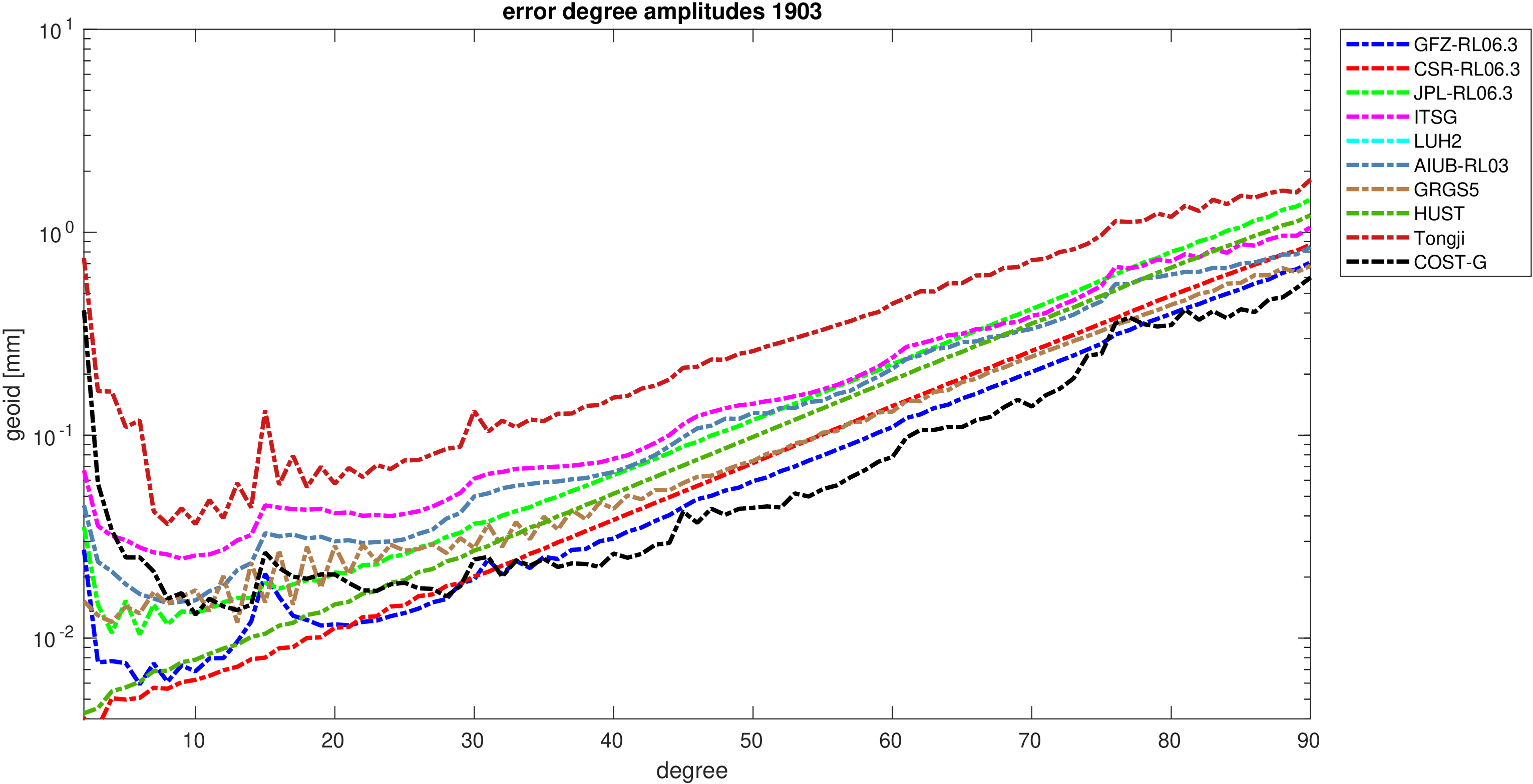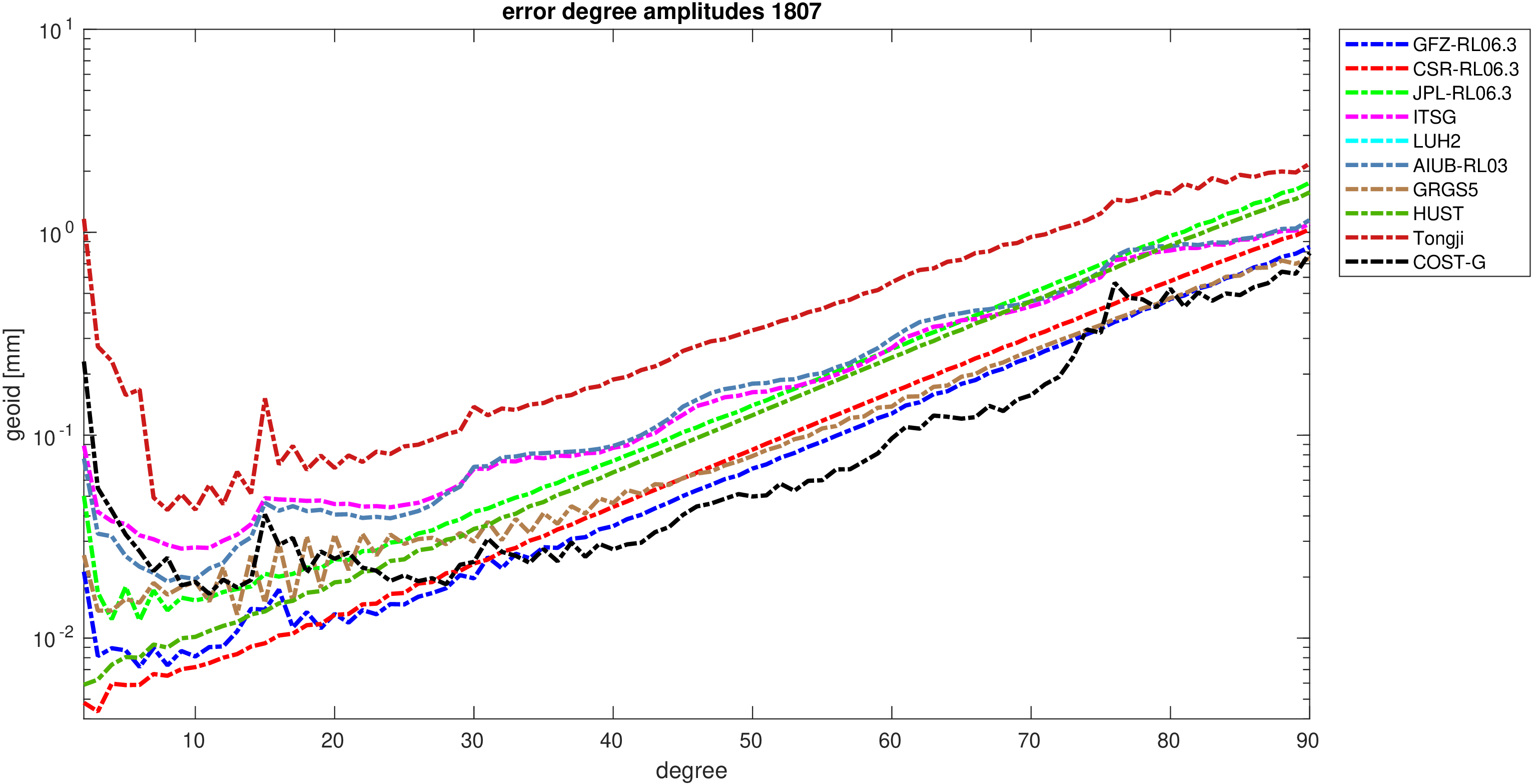 For comparisons in the spherical harmonic domain no filter is applied. Low degree anomalies are dominated by