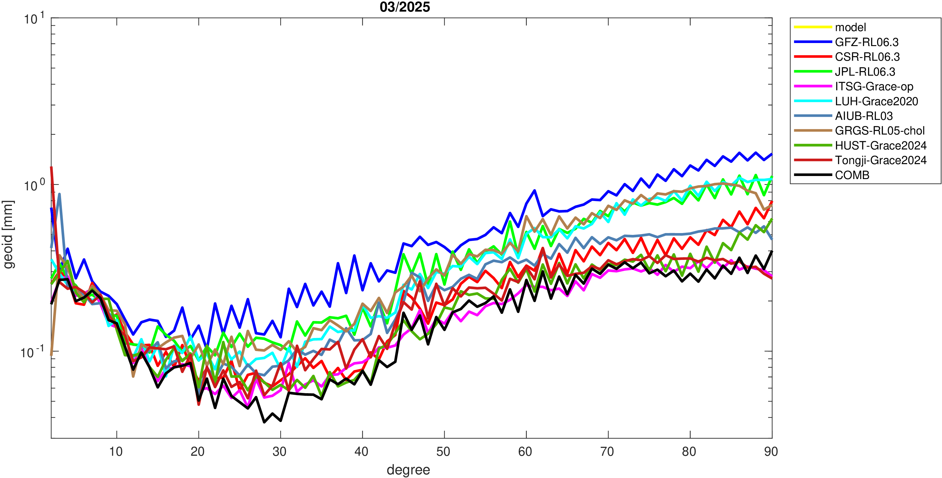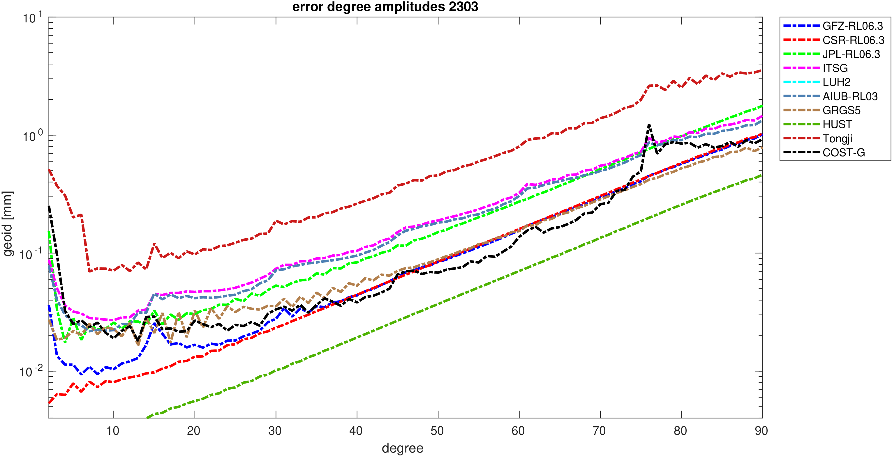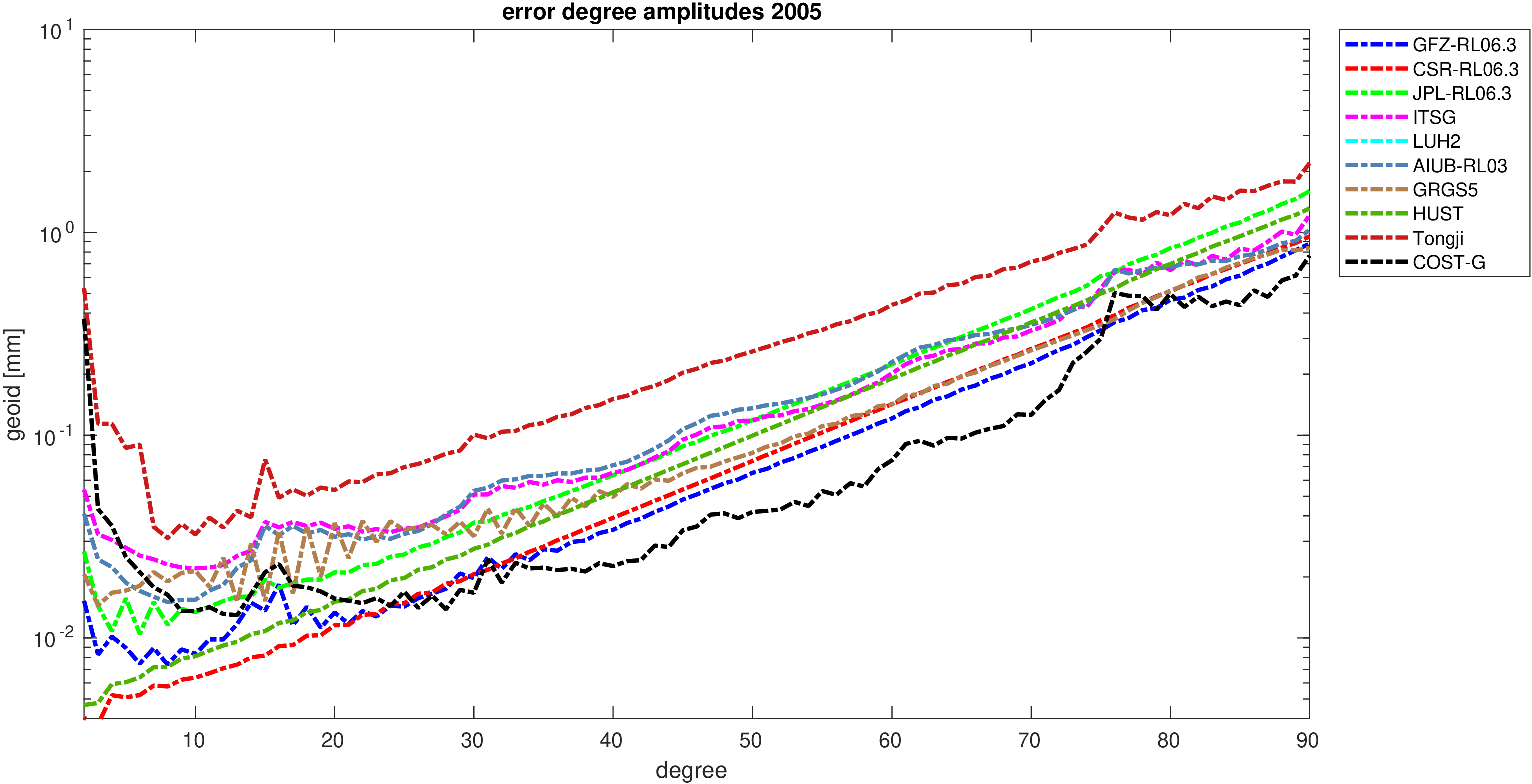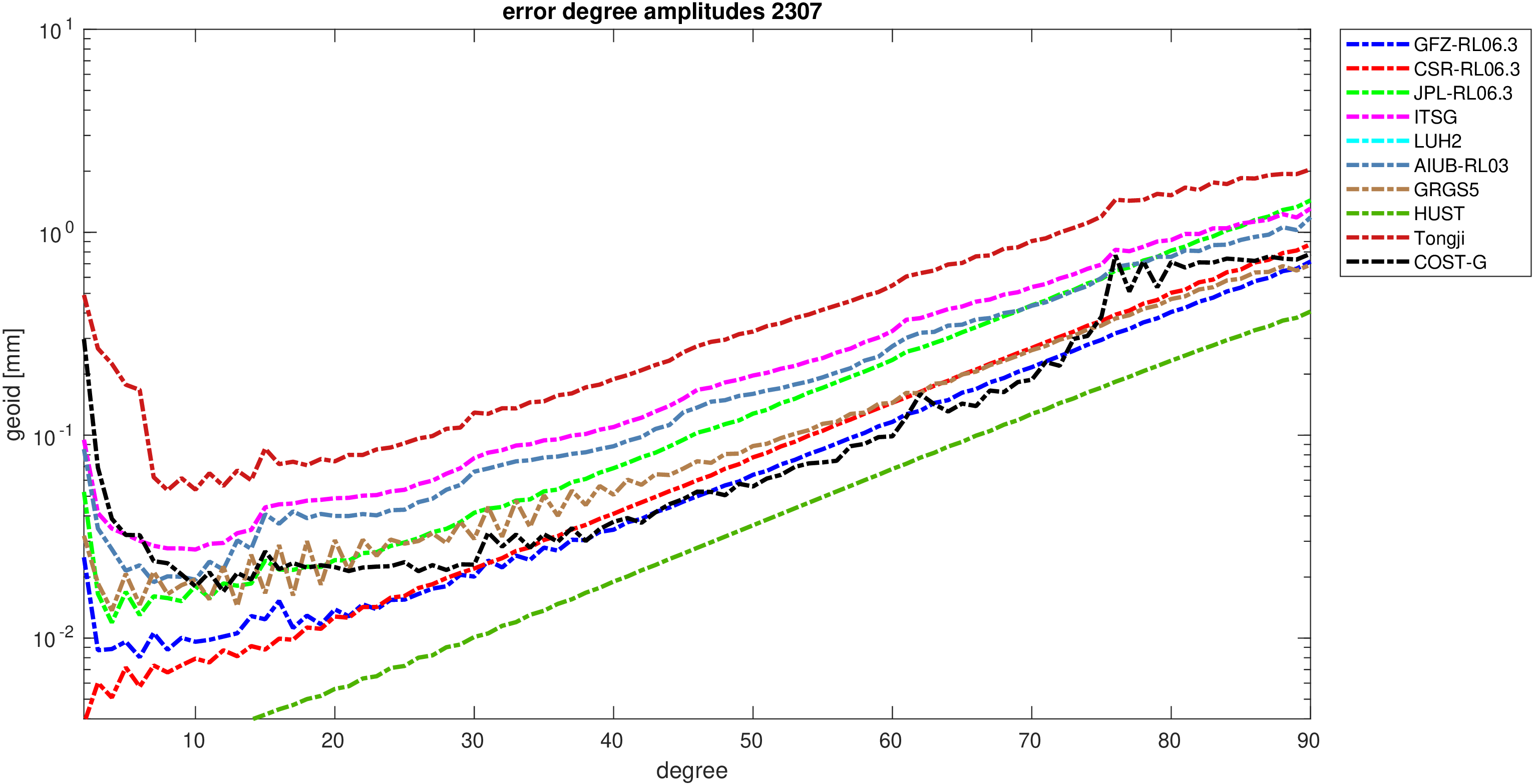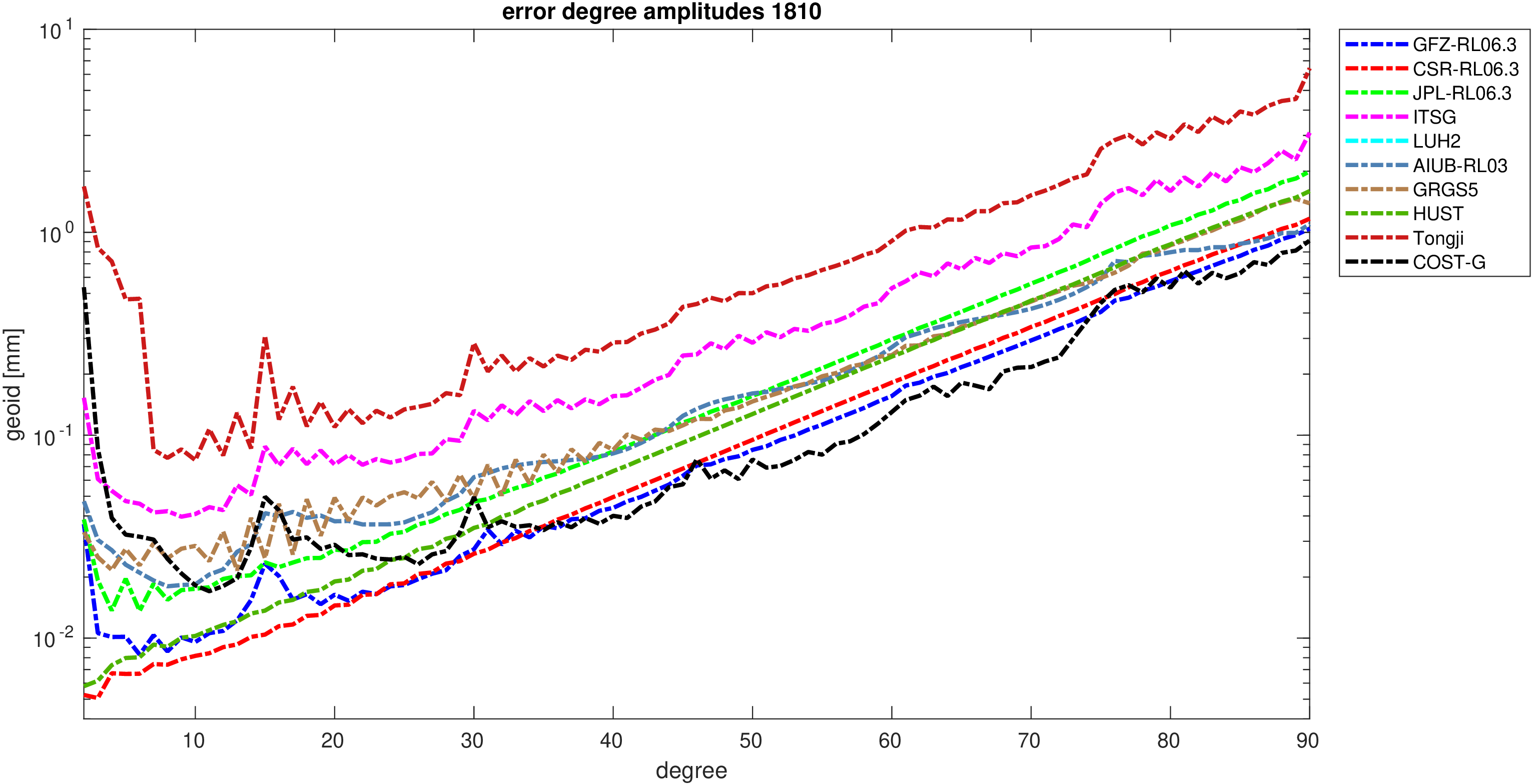 For comparisons in the spherical harmonic domain no filter is applied. Low degree anomalies are dominated by