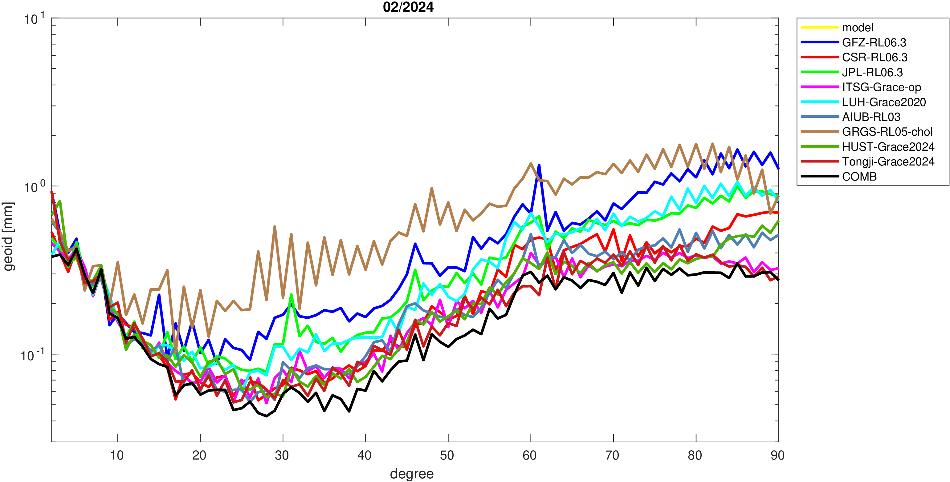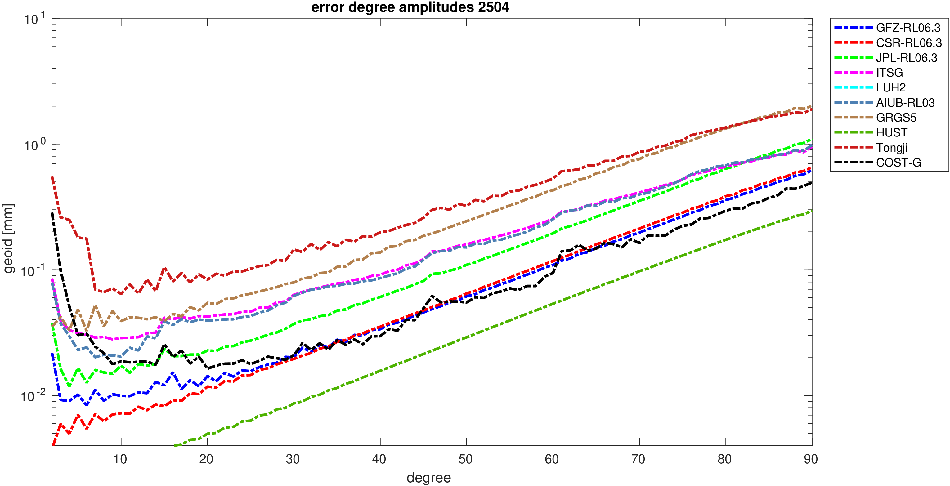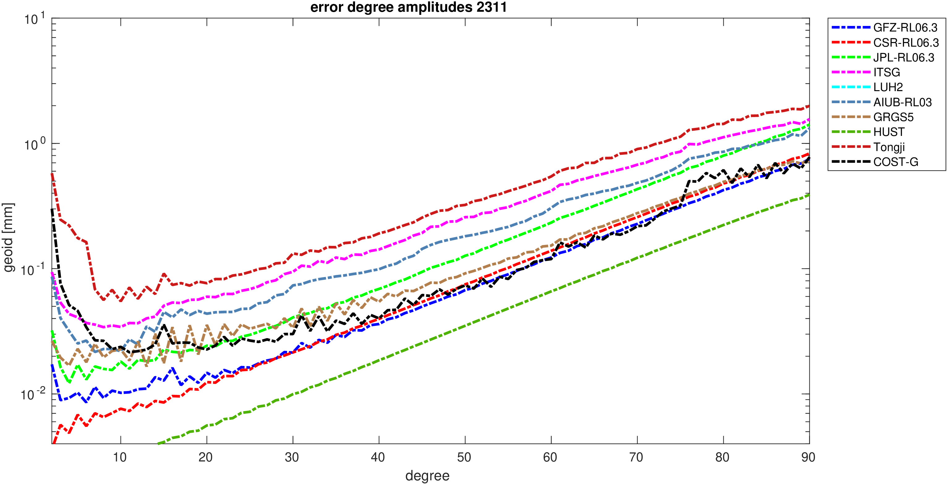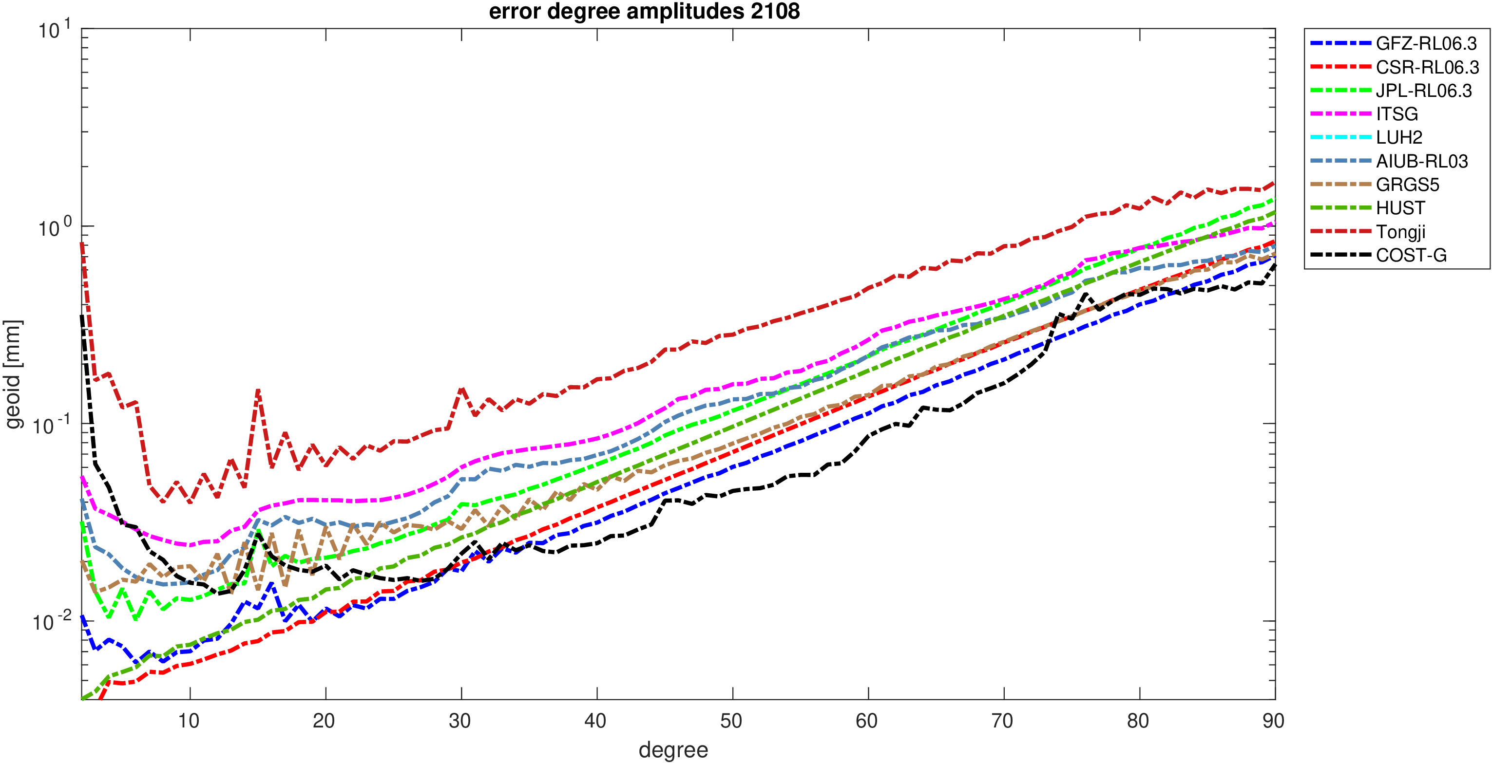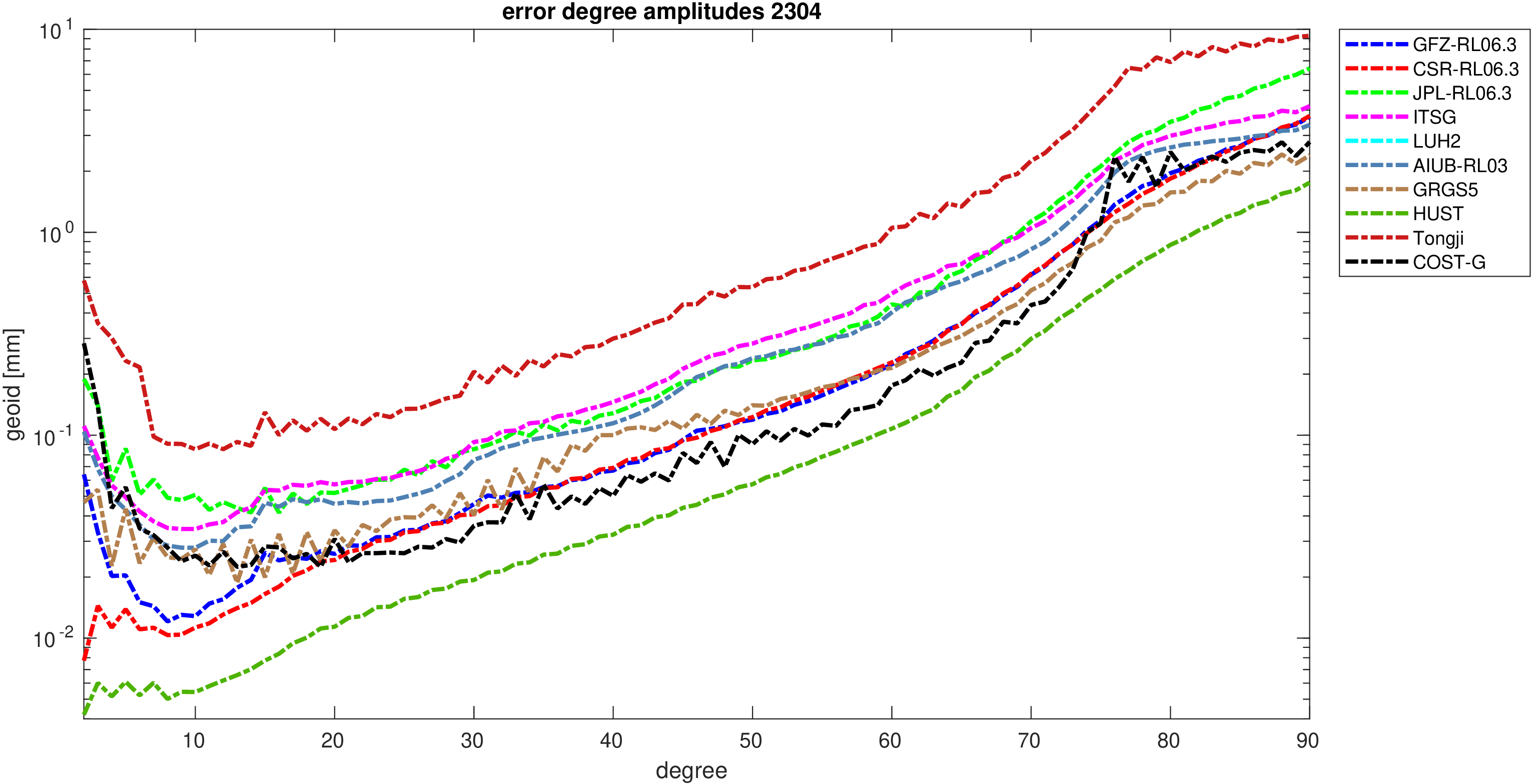 For comparisons in the spherical harmonic domain no filter is applied. Low degree anomalies are dominated by