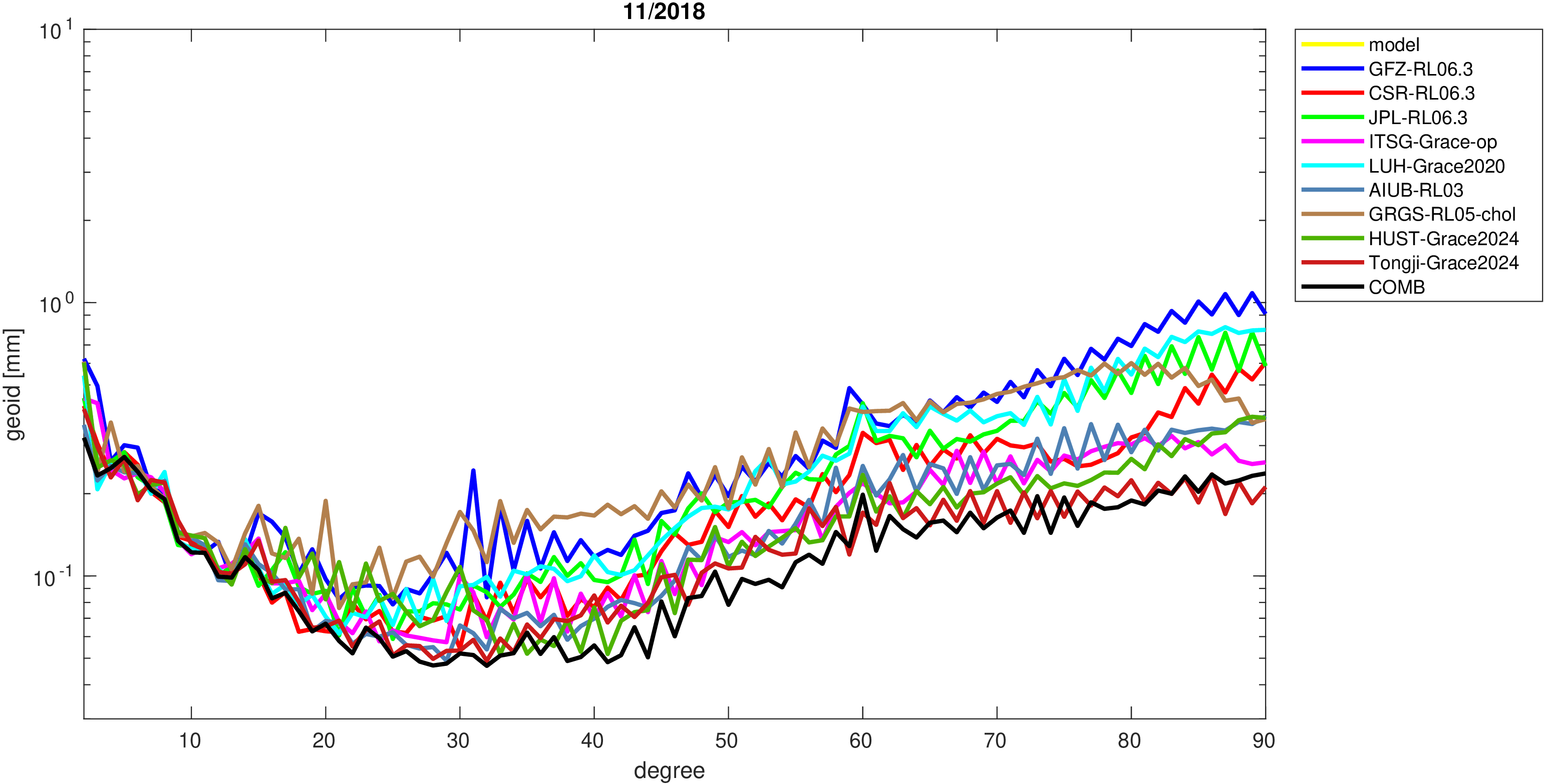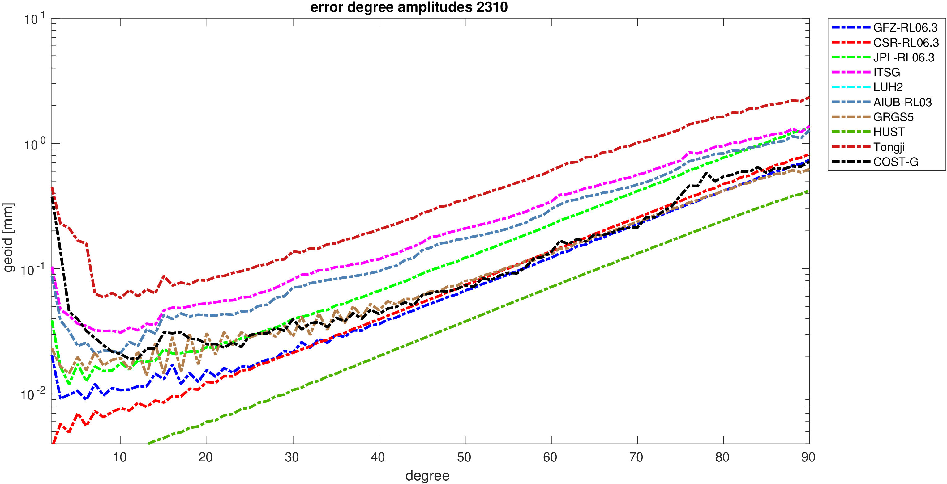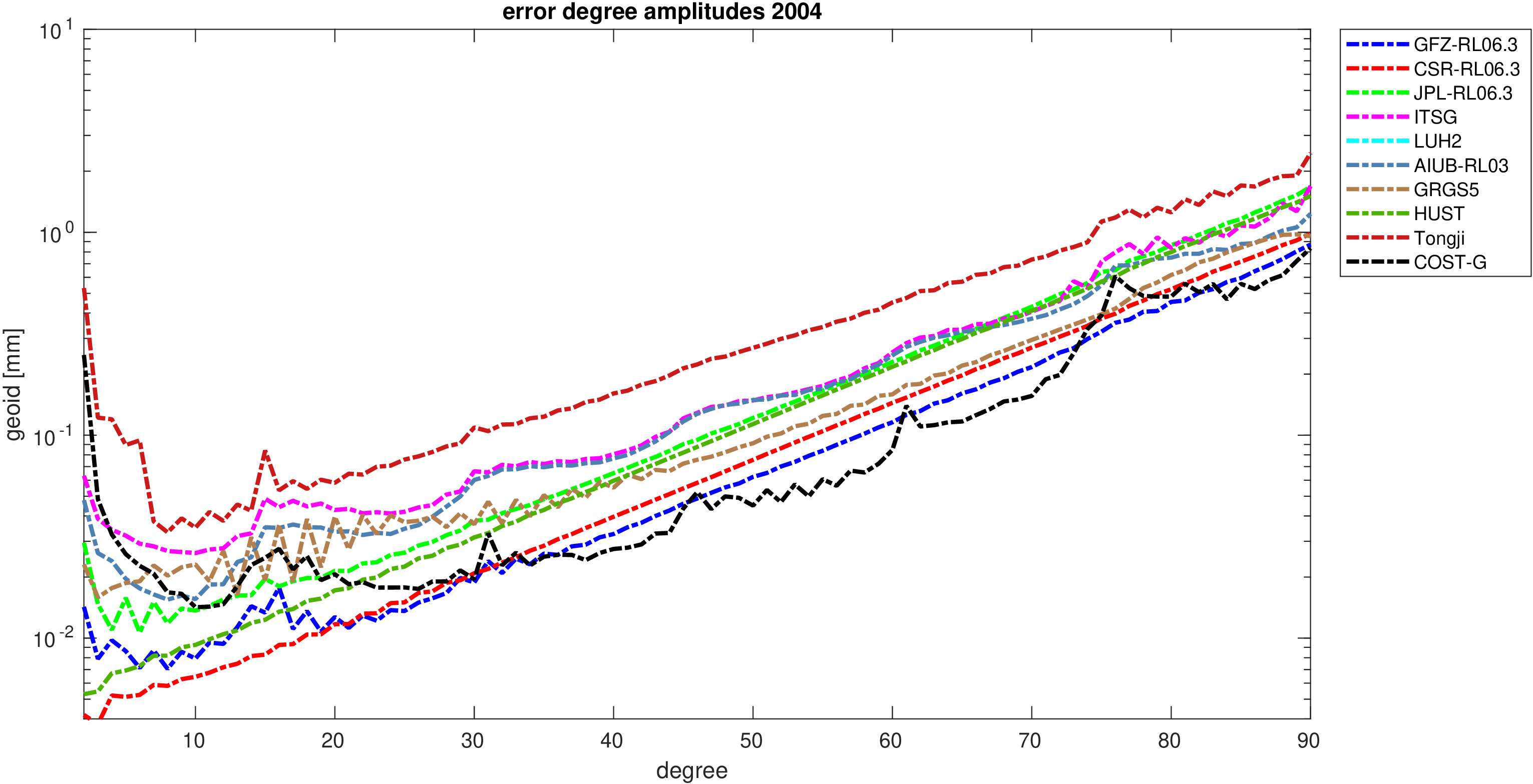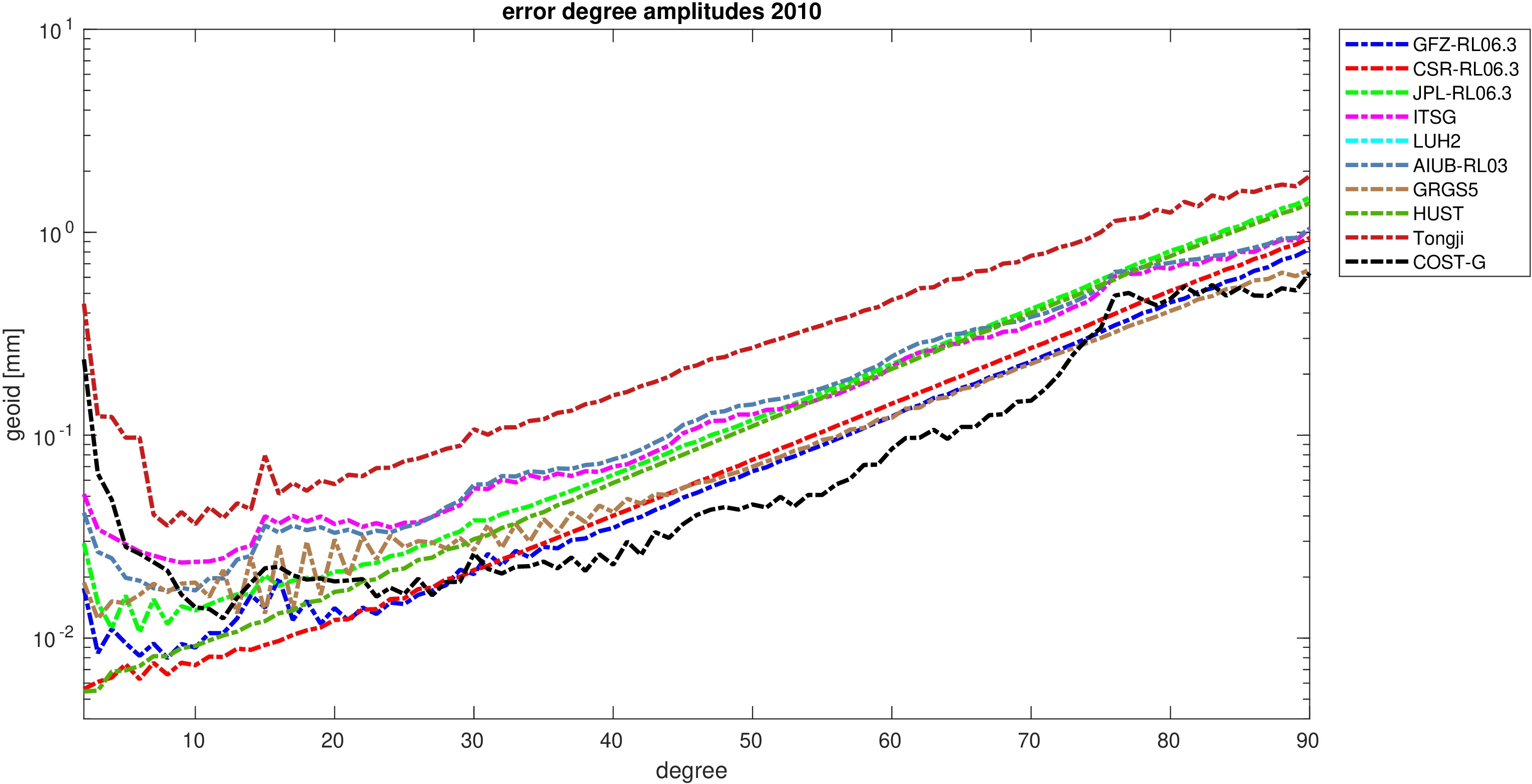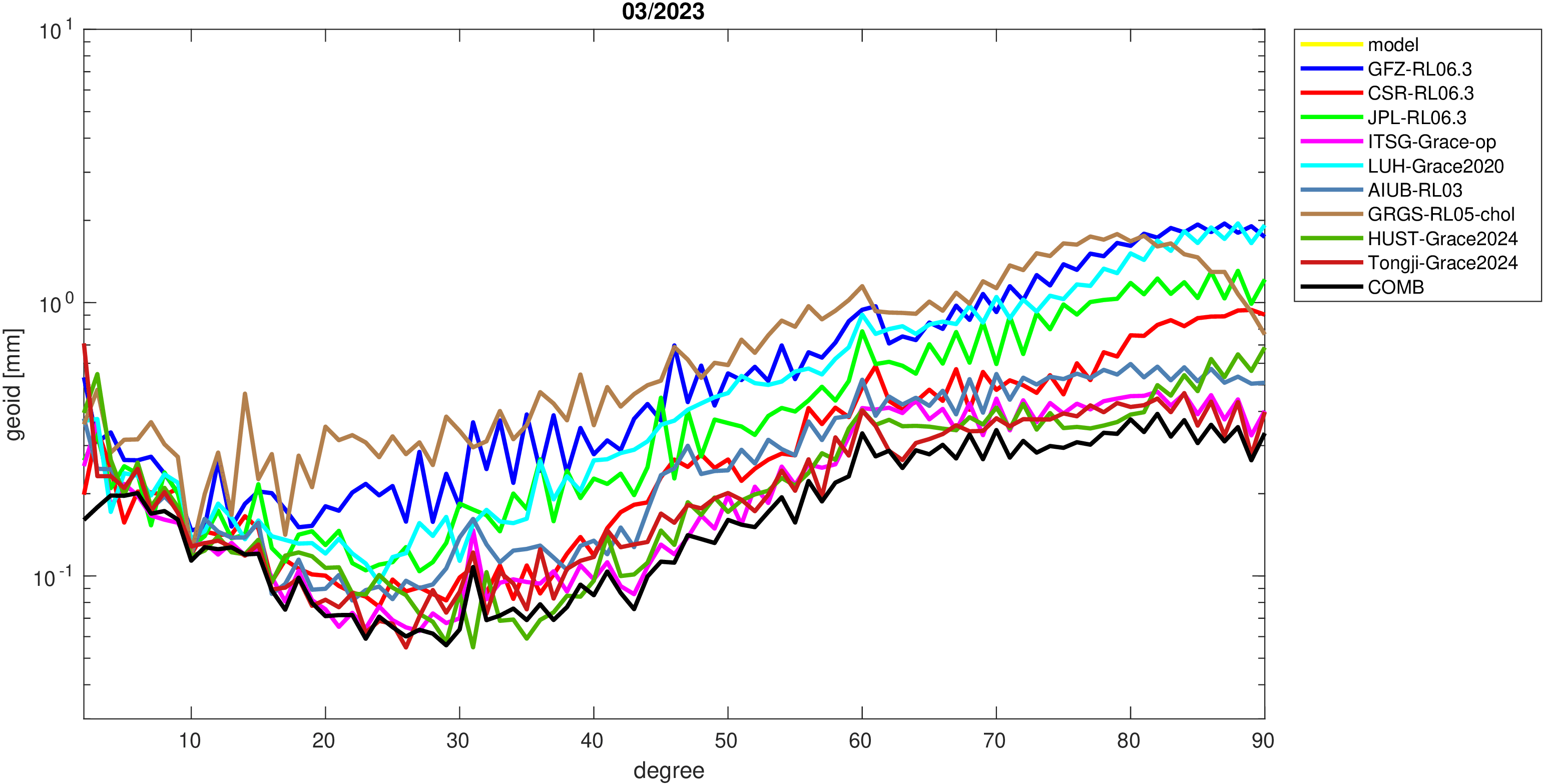 For comparisons in the spherical harmonic domain no filter is applied. Low degree anomalies are dominated by