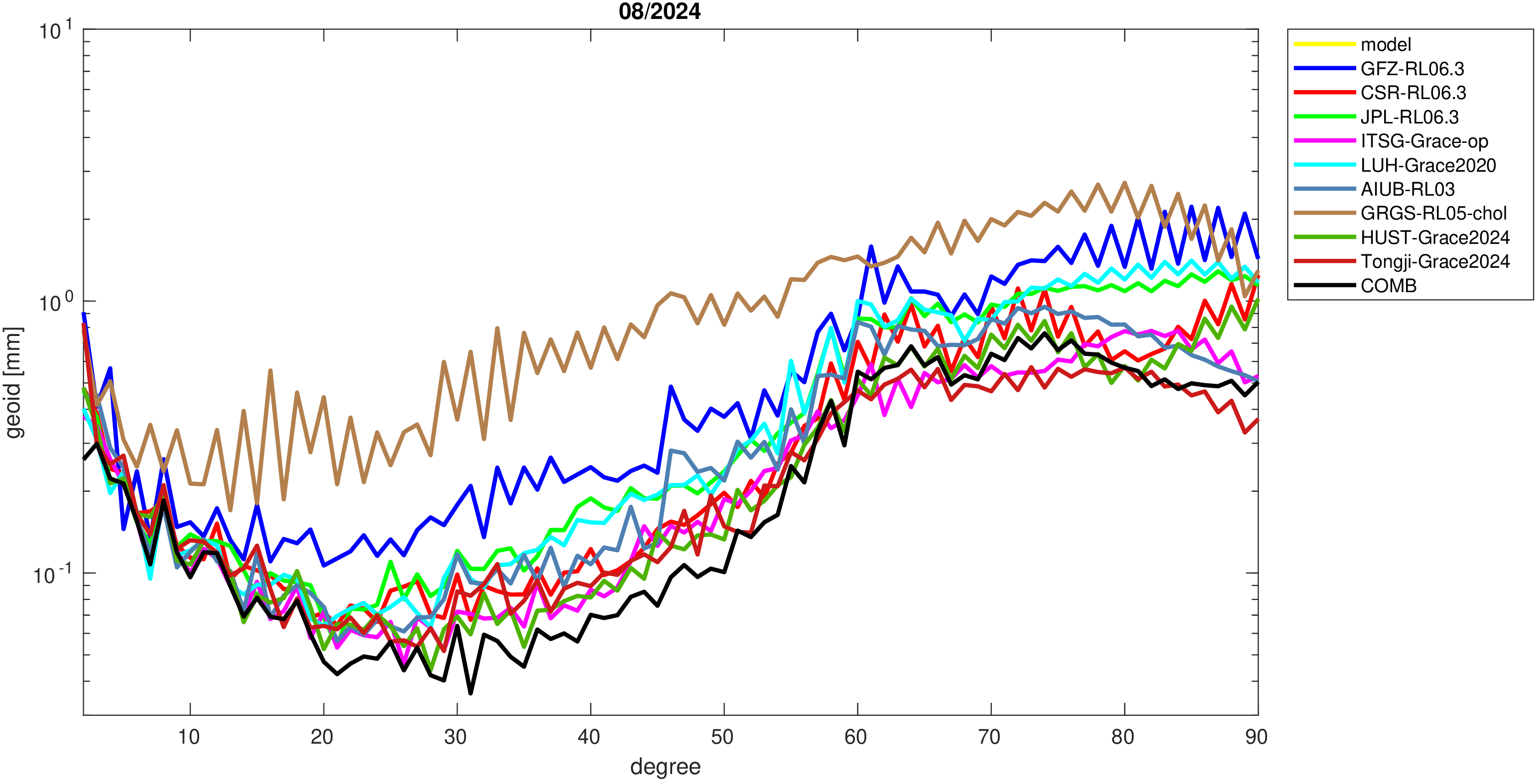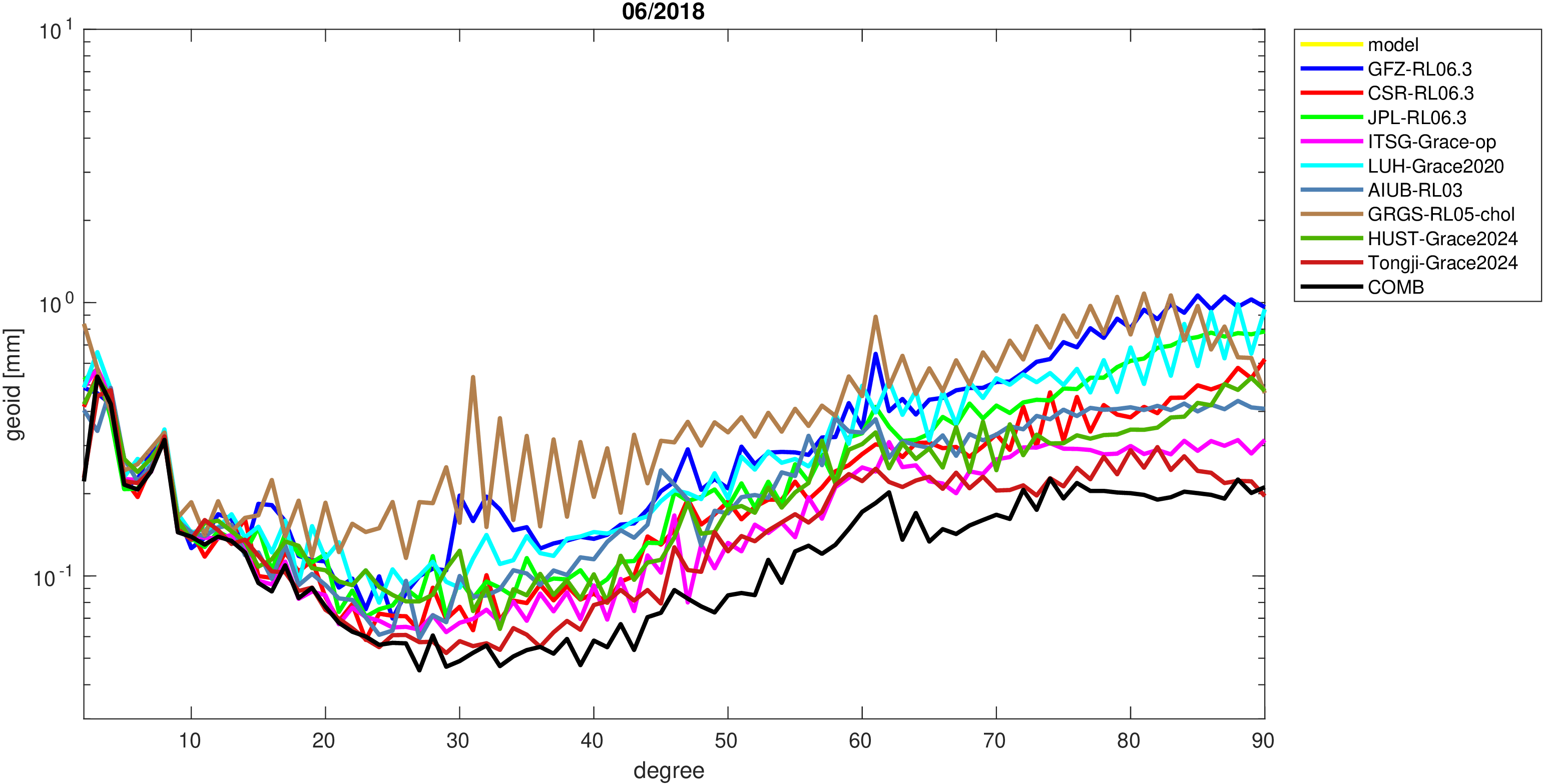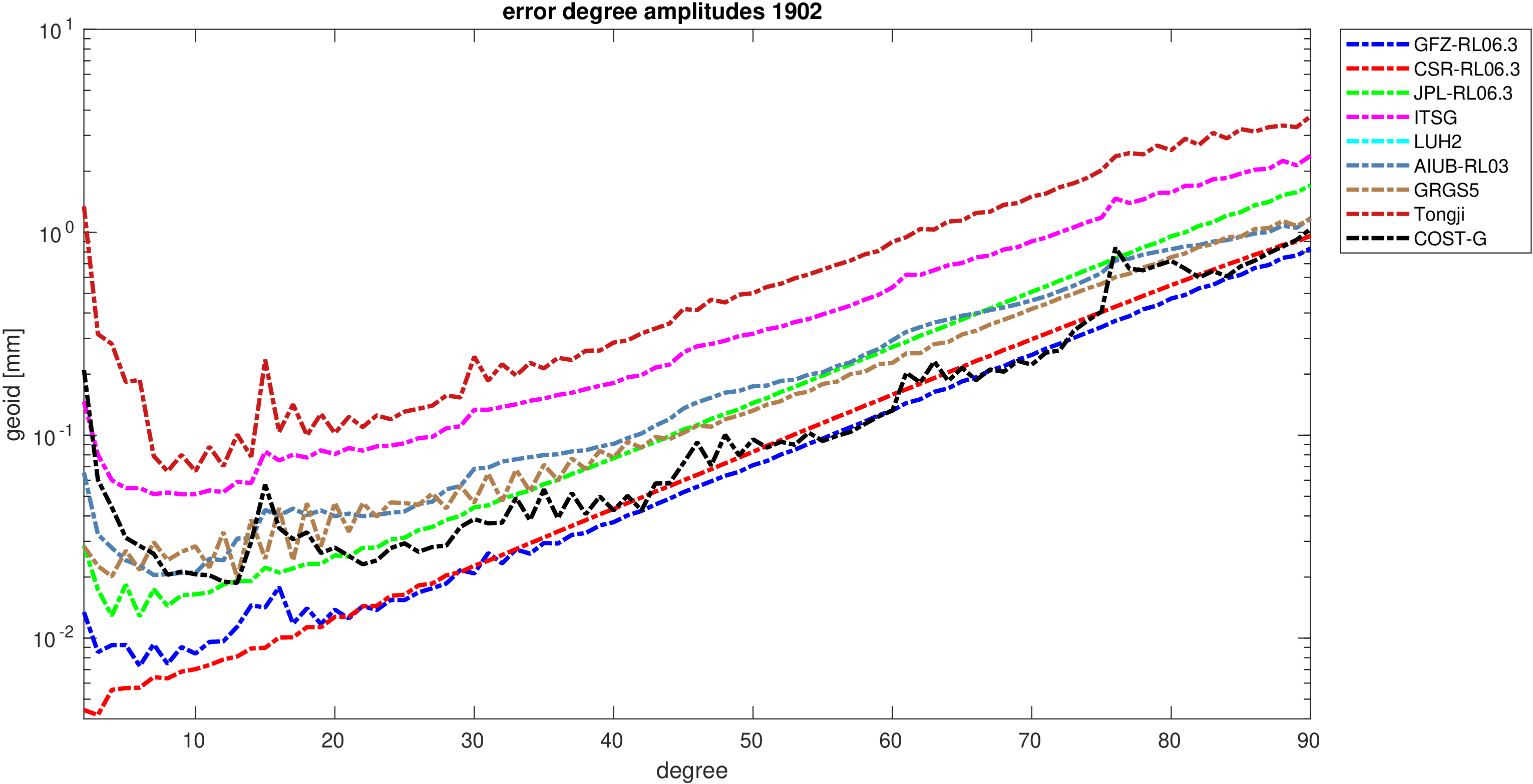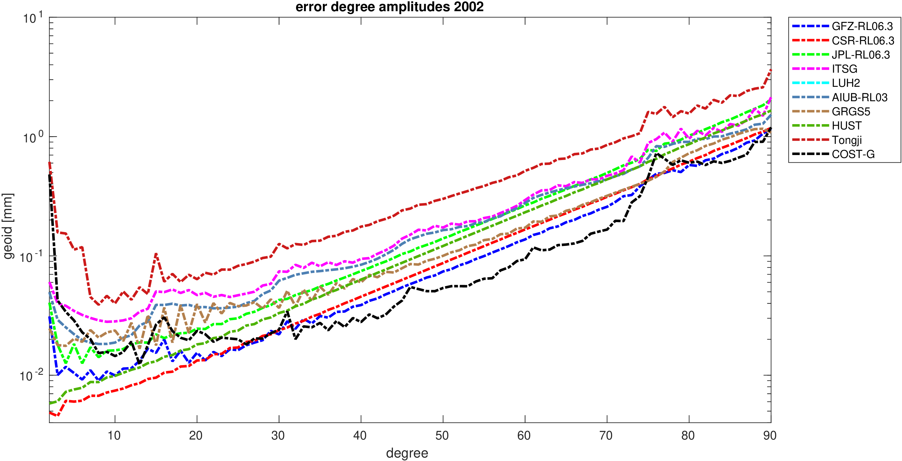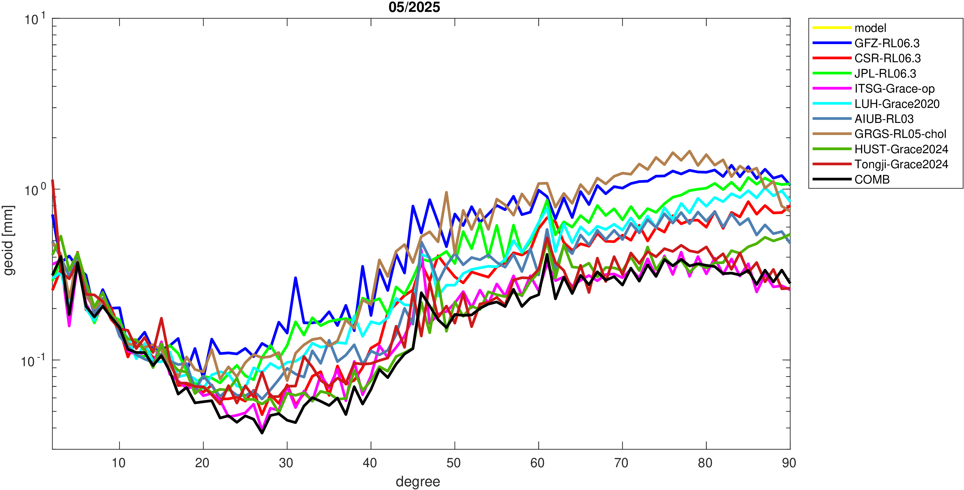 For comparisons in the spherical harmonic domain no filter is applied. Low degree anomalies are dominated by