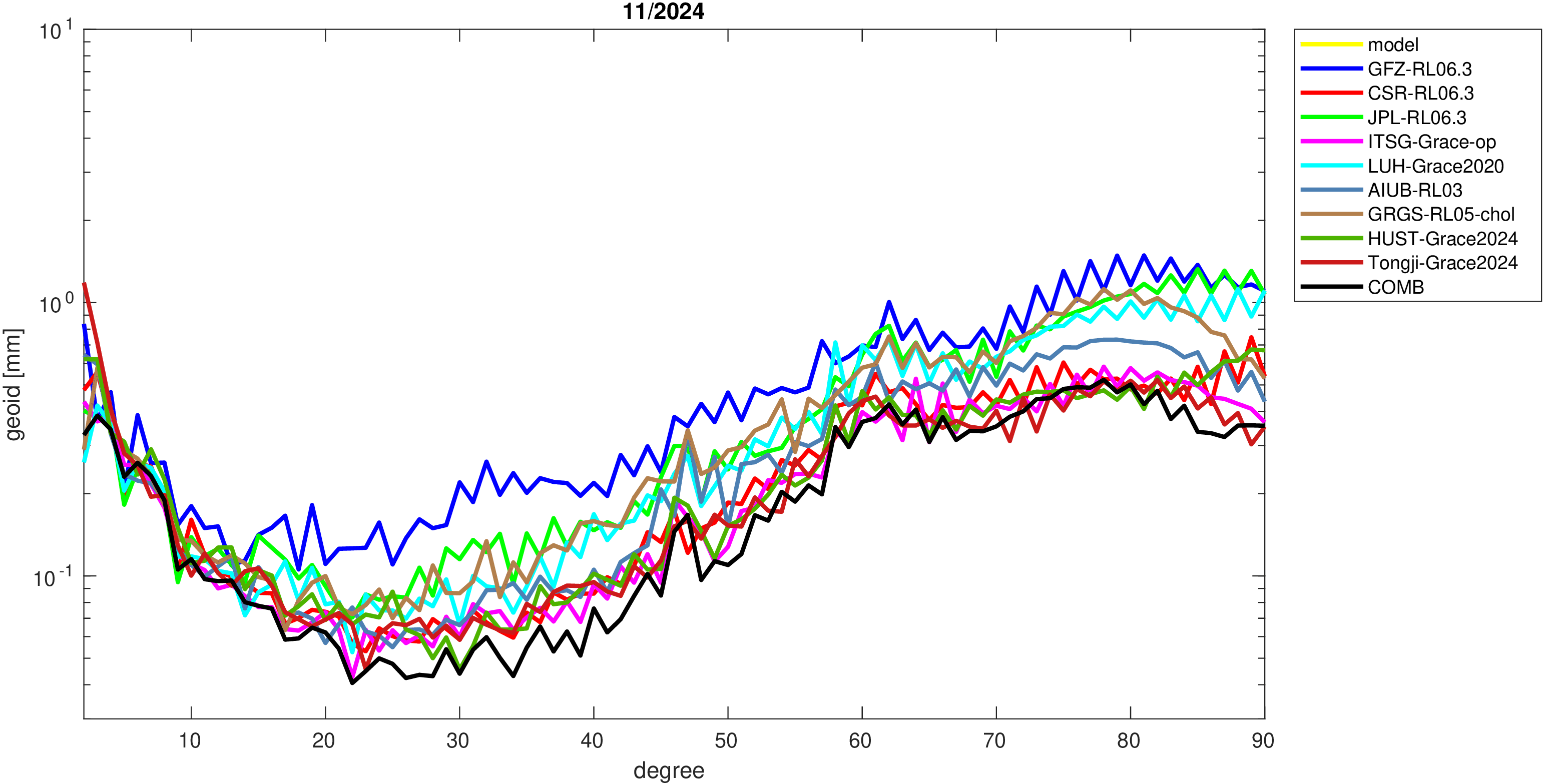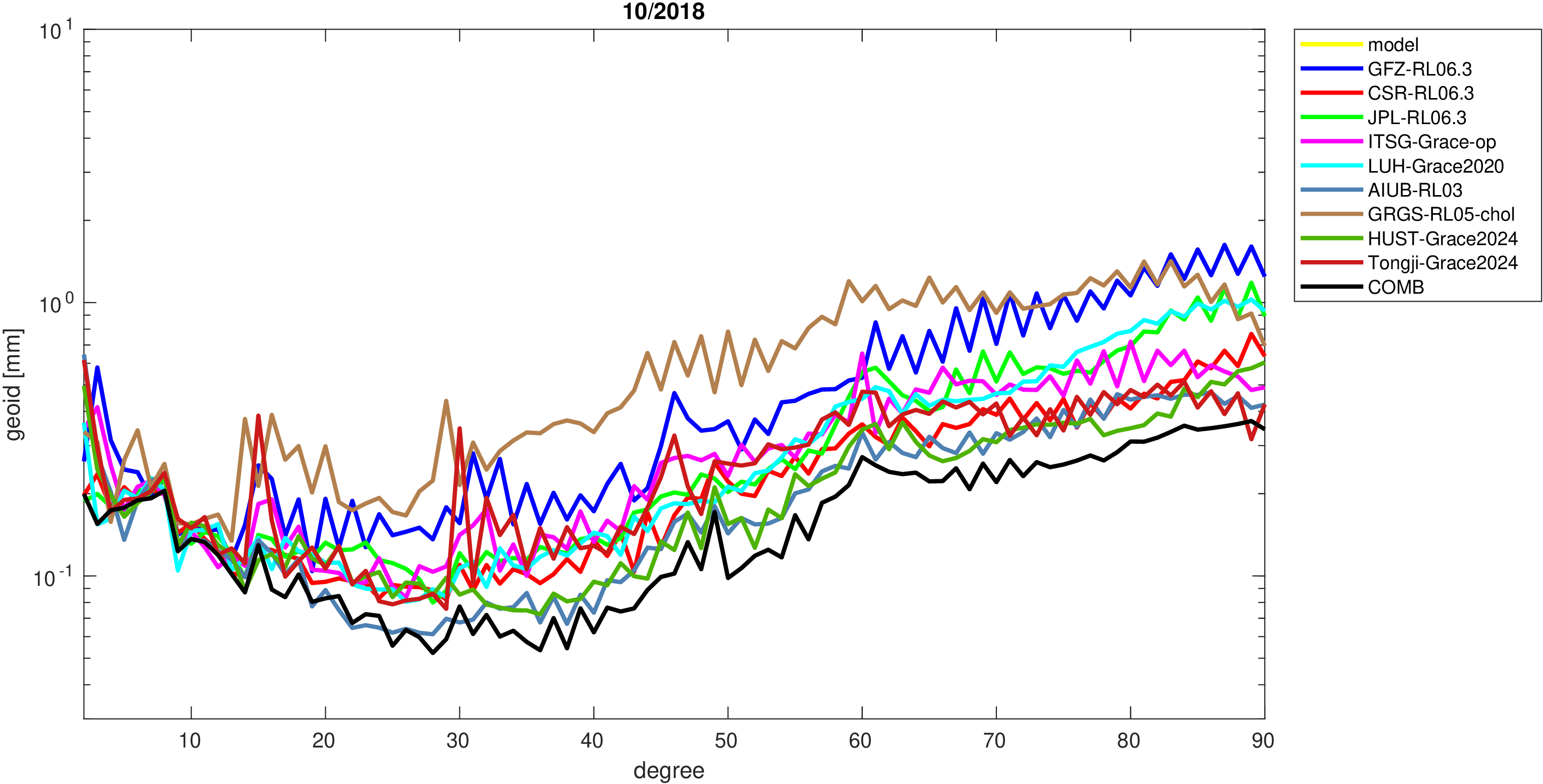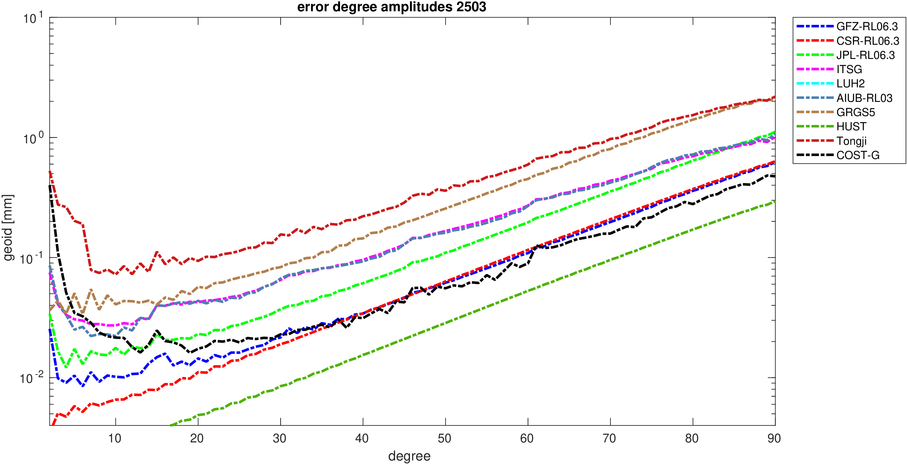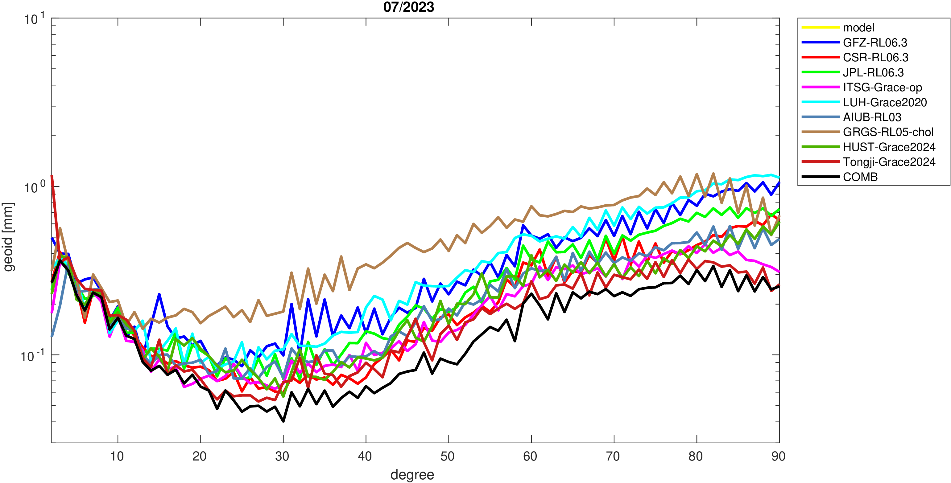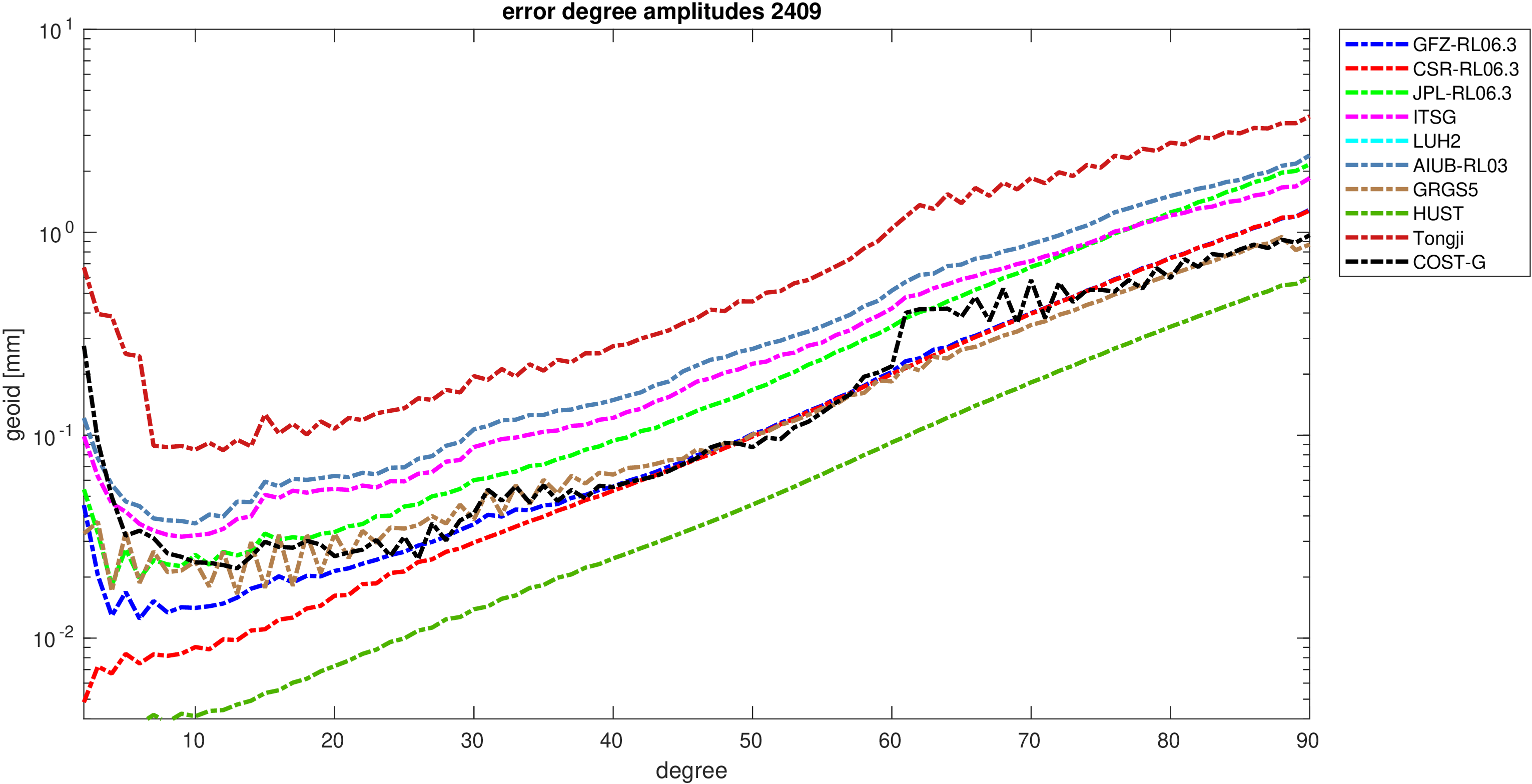 For comparisons in the spherical harmonic domain no filter is applied. Low degree anomalies are dominated by