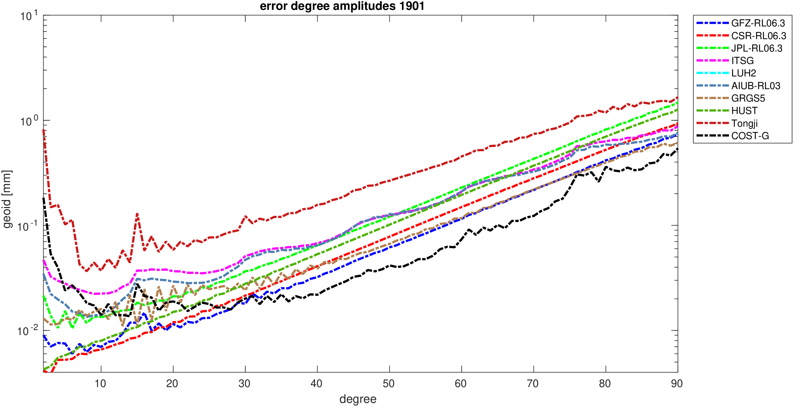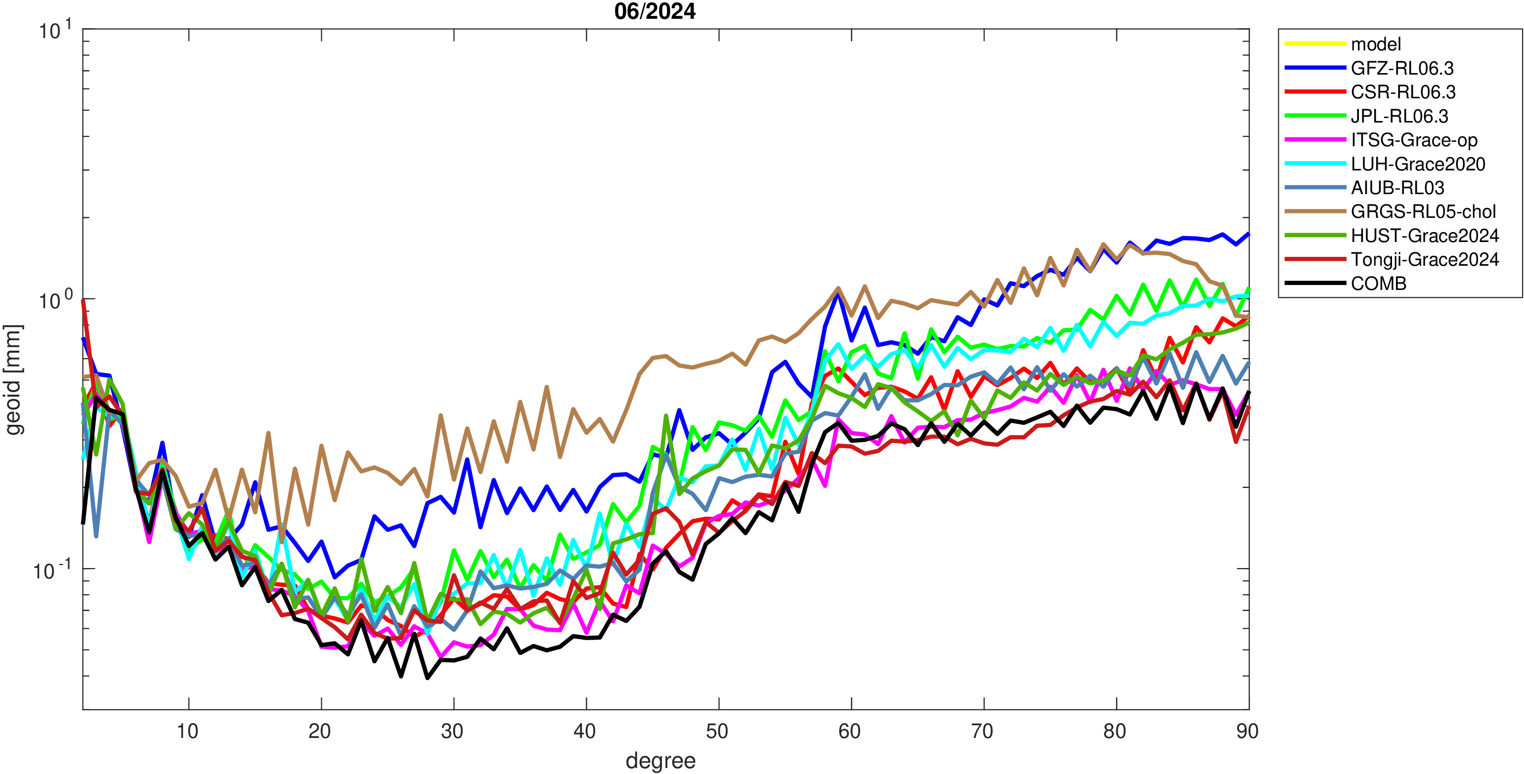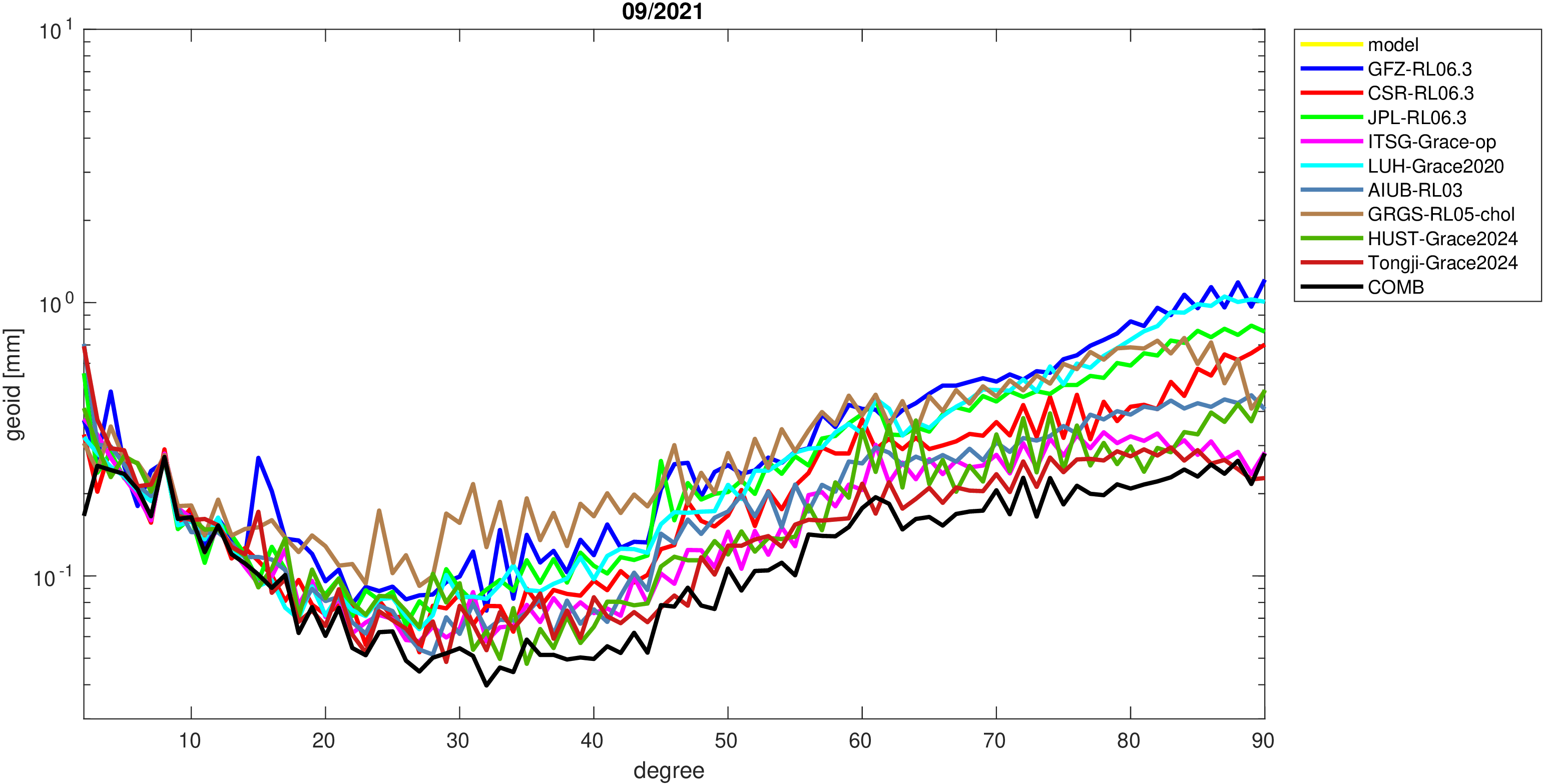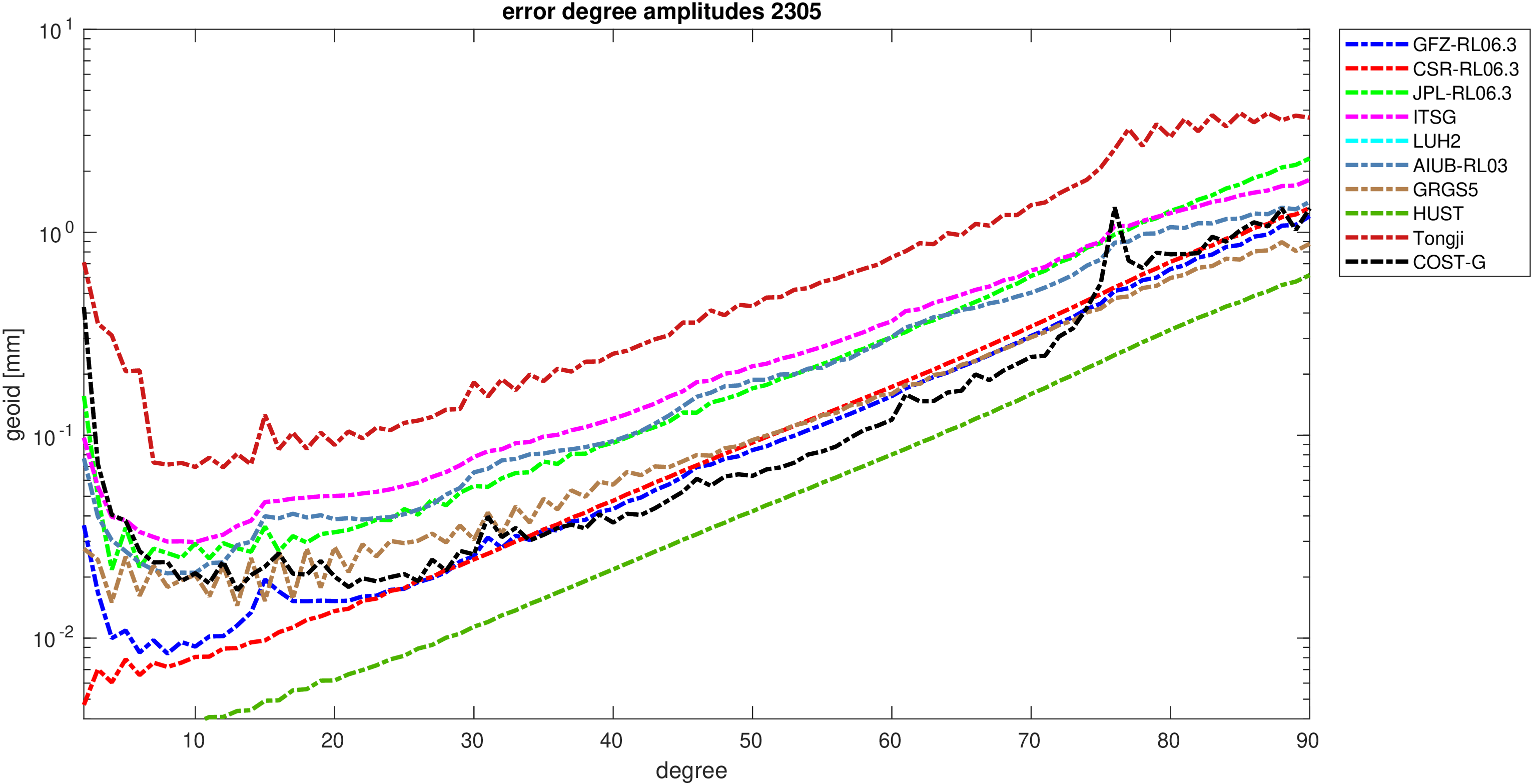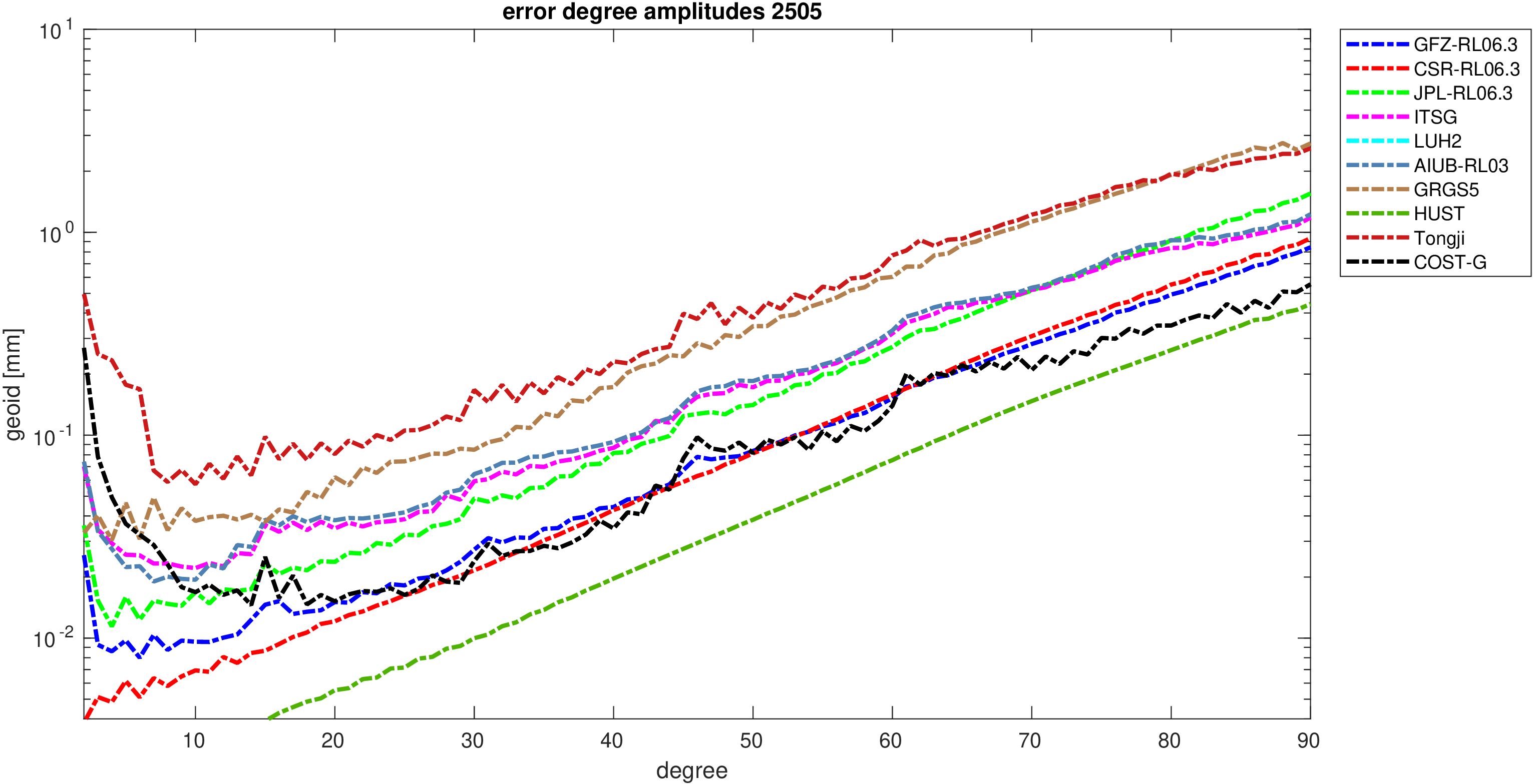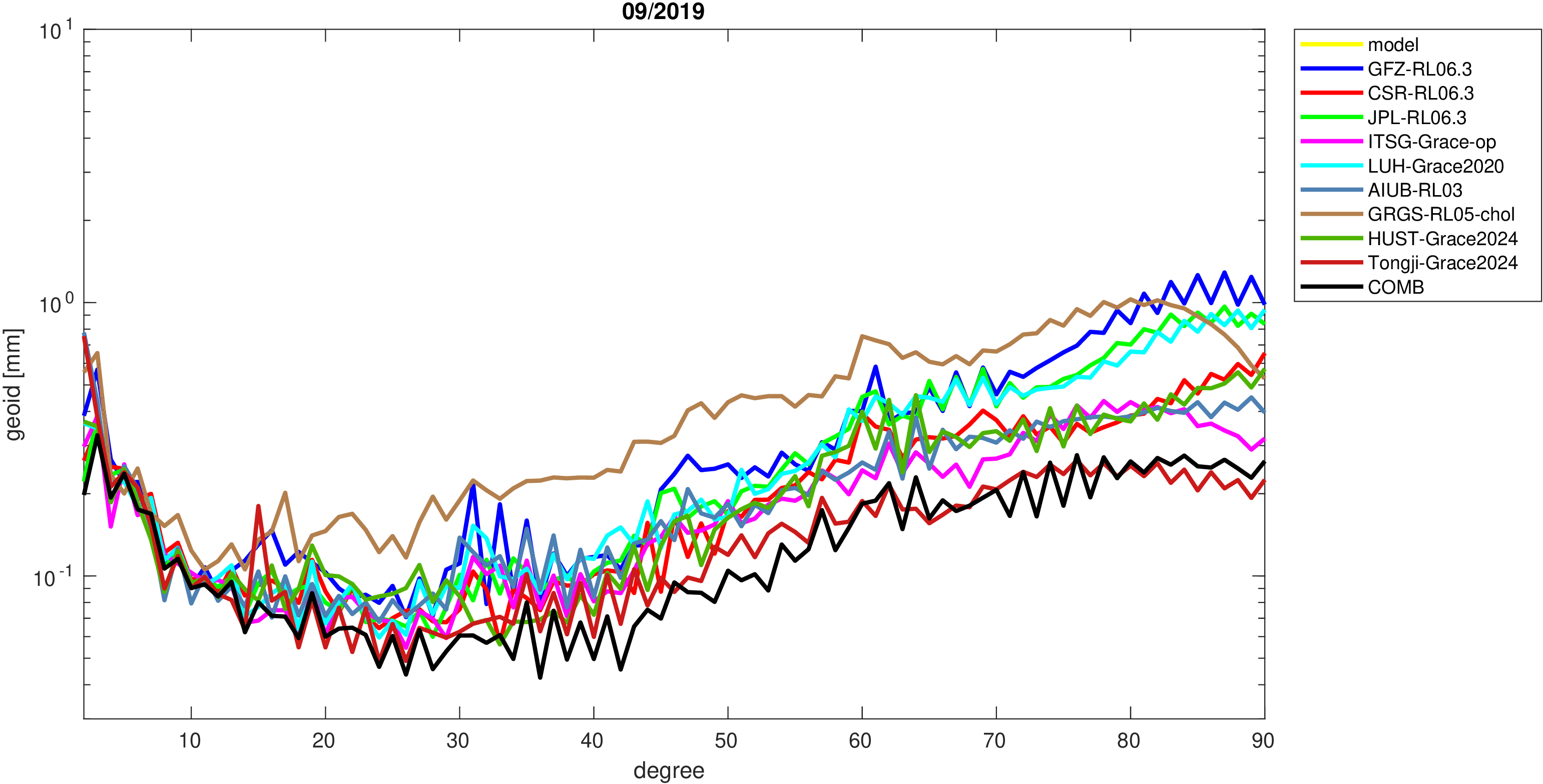 For comparisons in the spherical harmonic domain no filter is applied. Low degree anomalies are dominated by