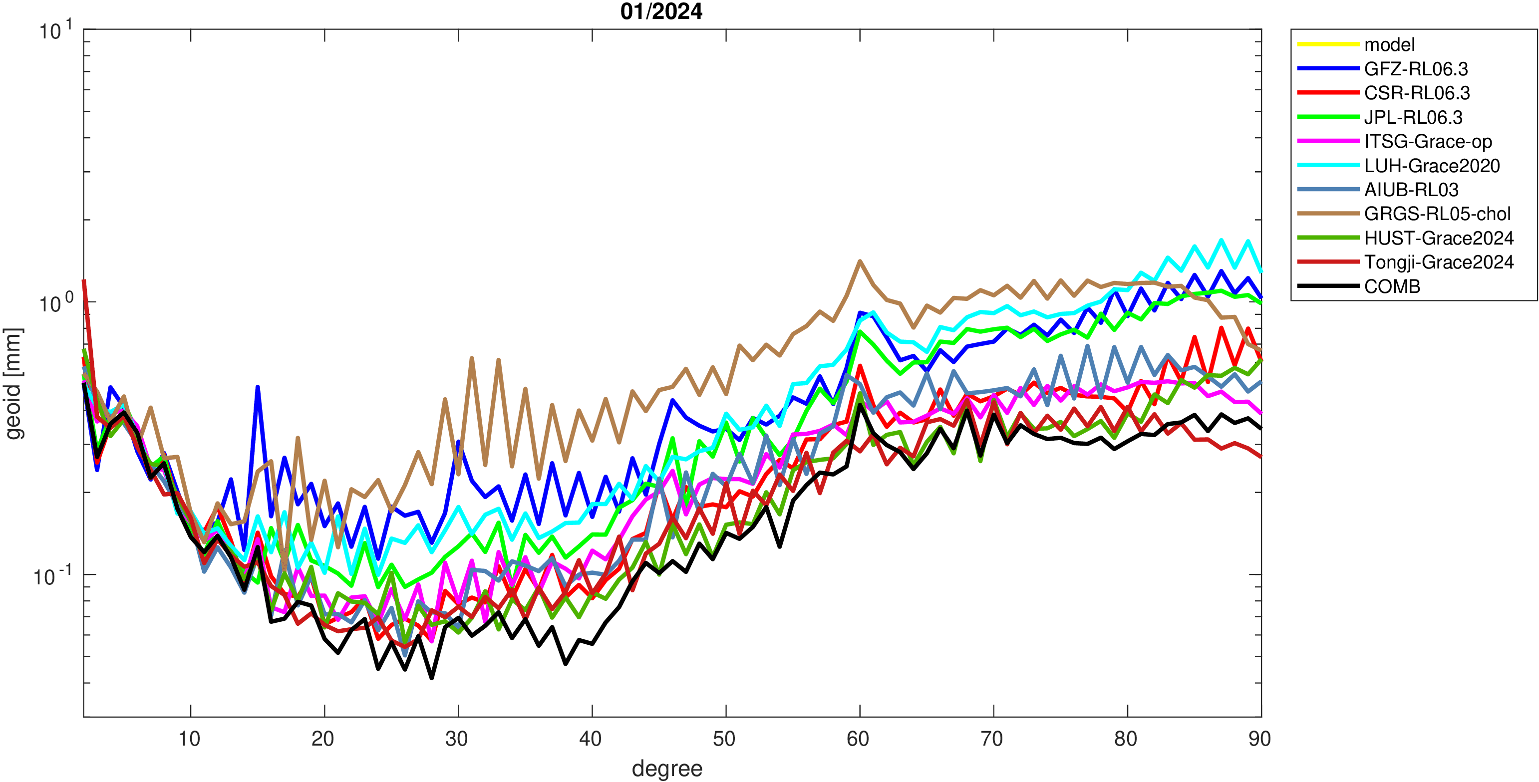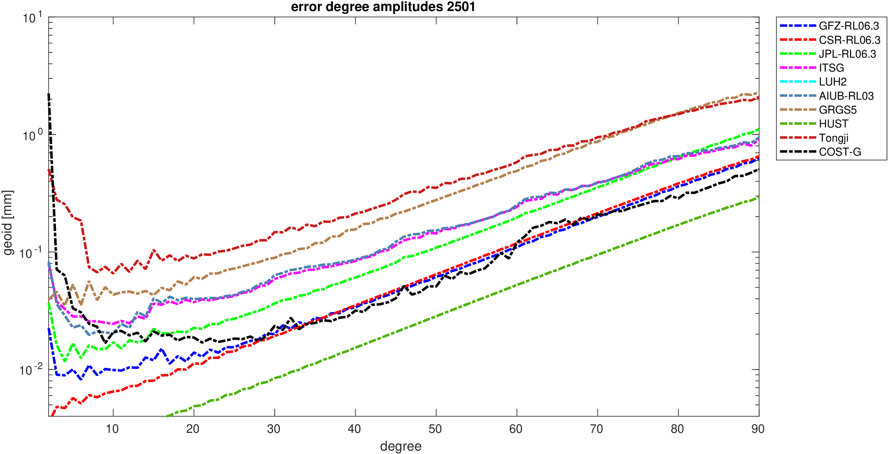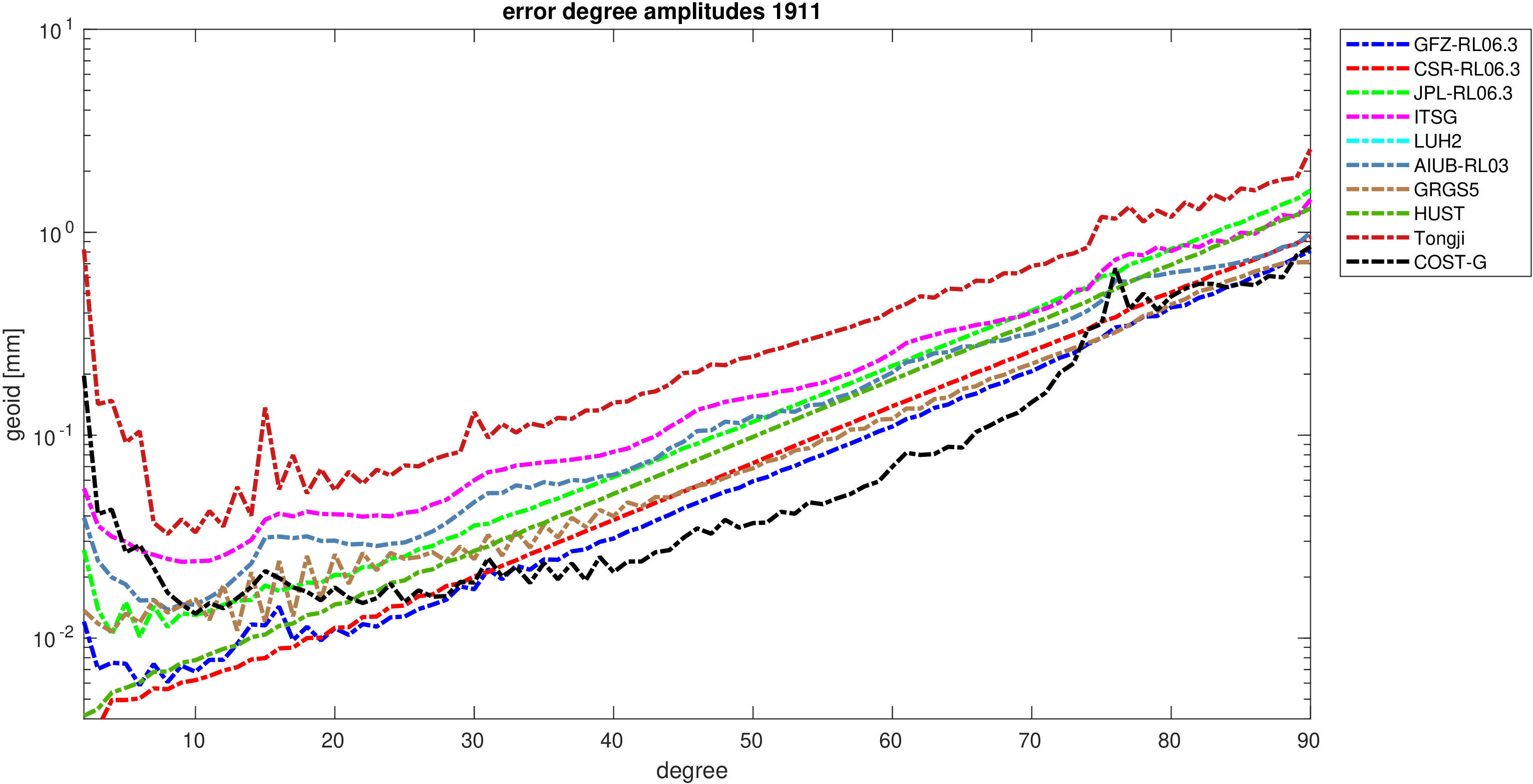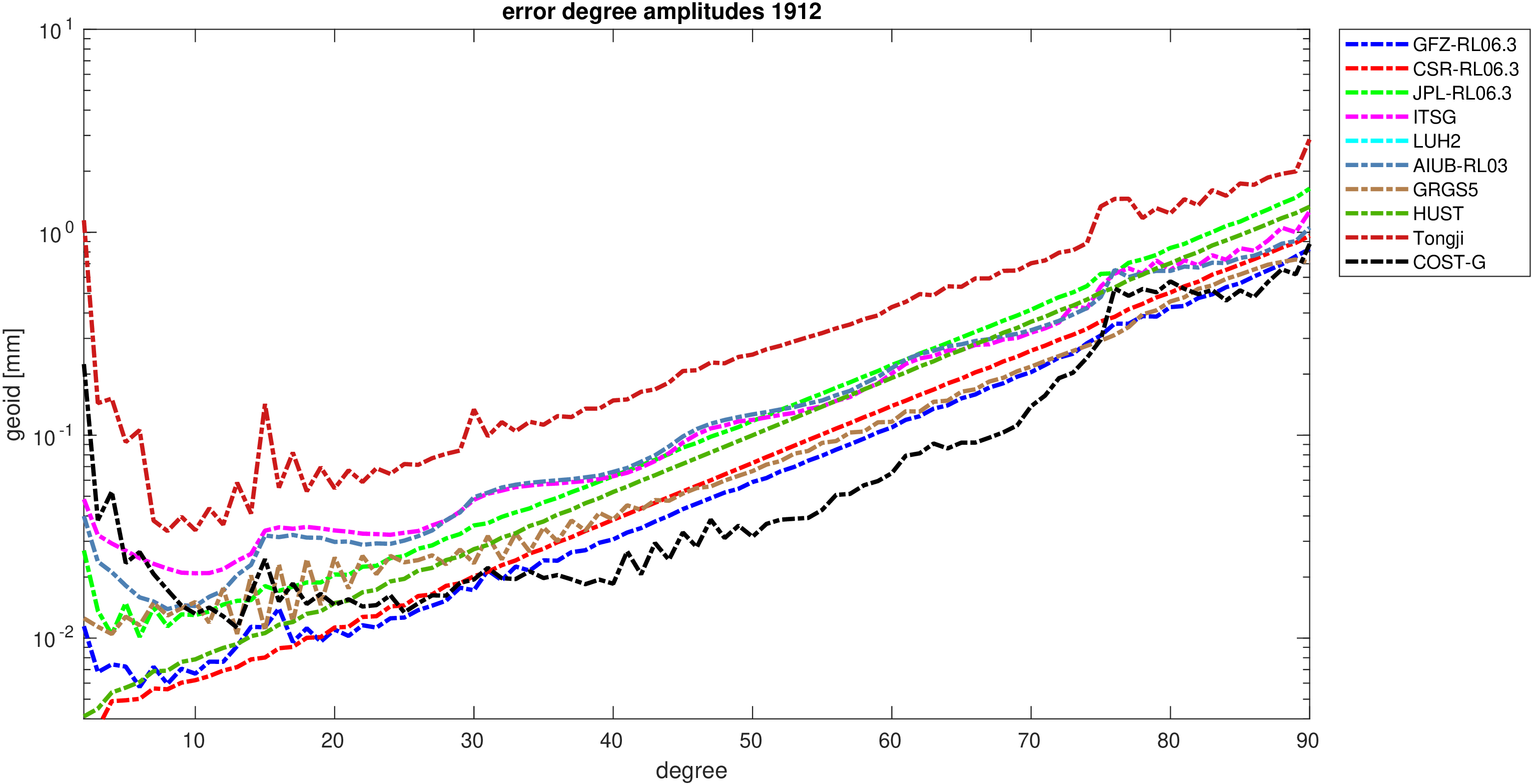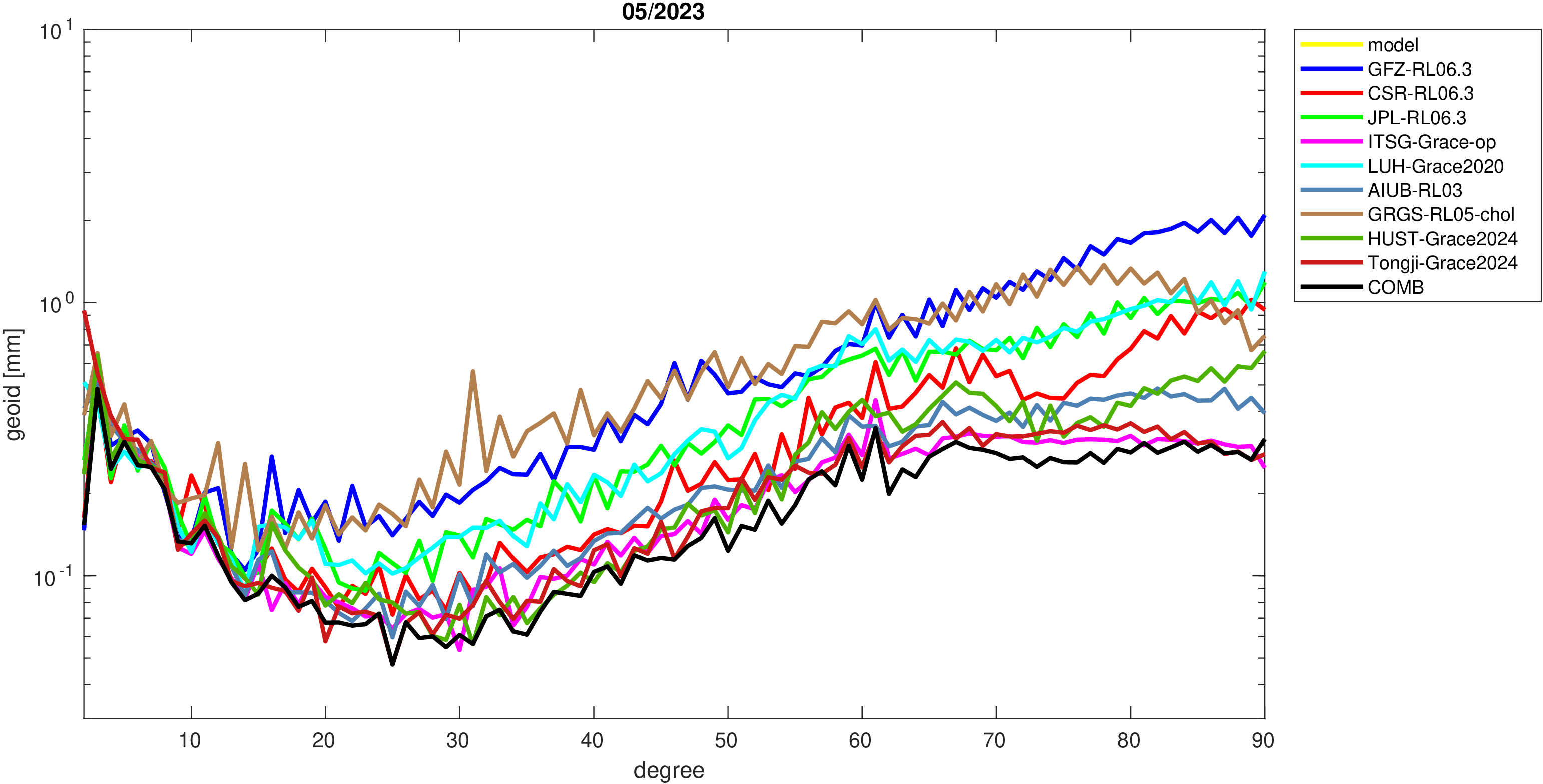 For comparisons in the spherical harmonic domain no filter is applied. Low degree anomalies are dominated by