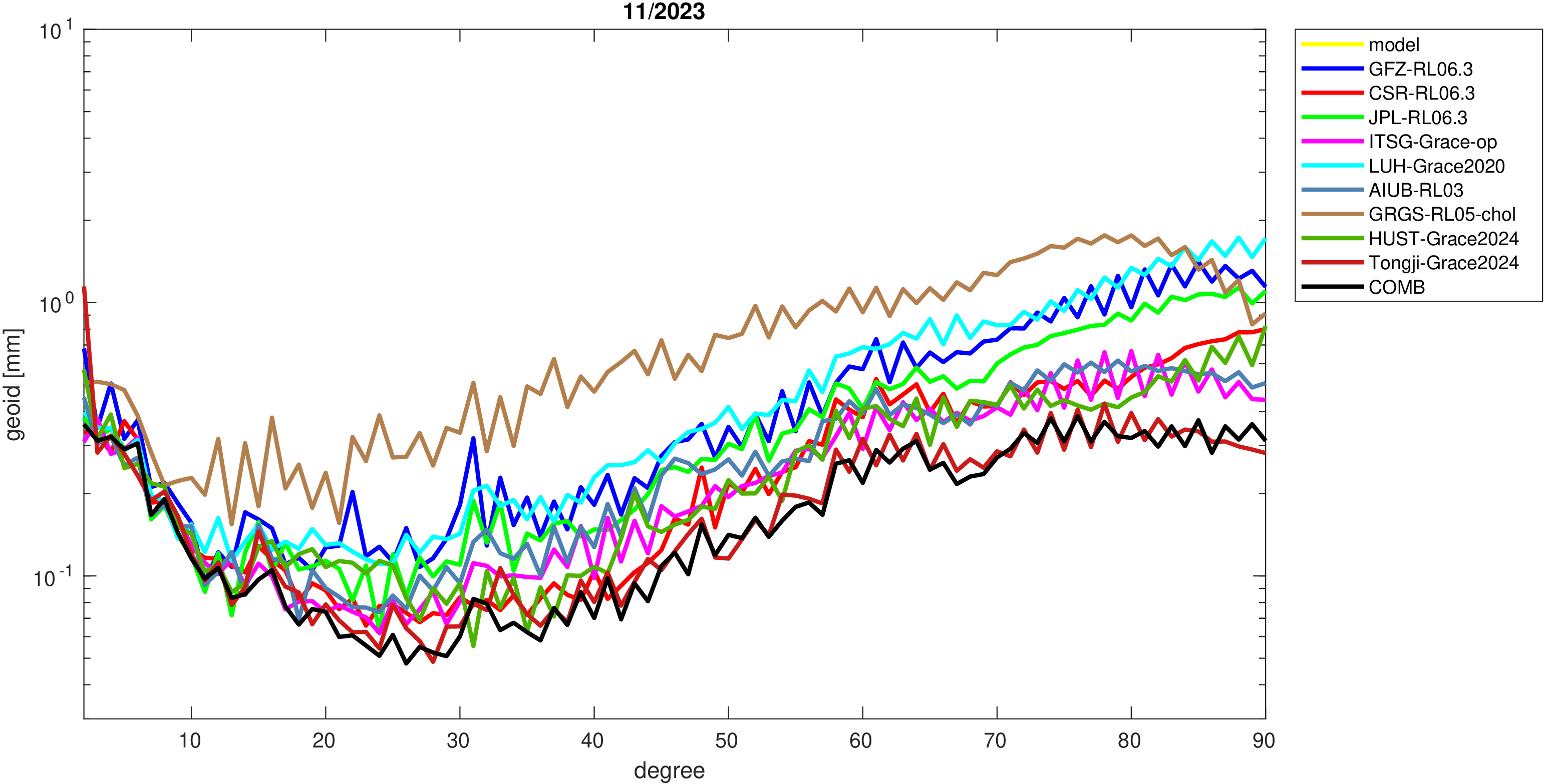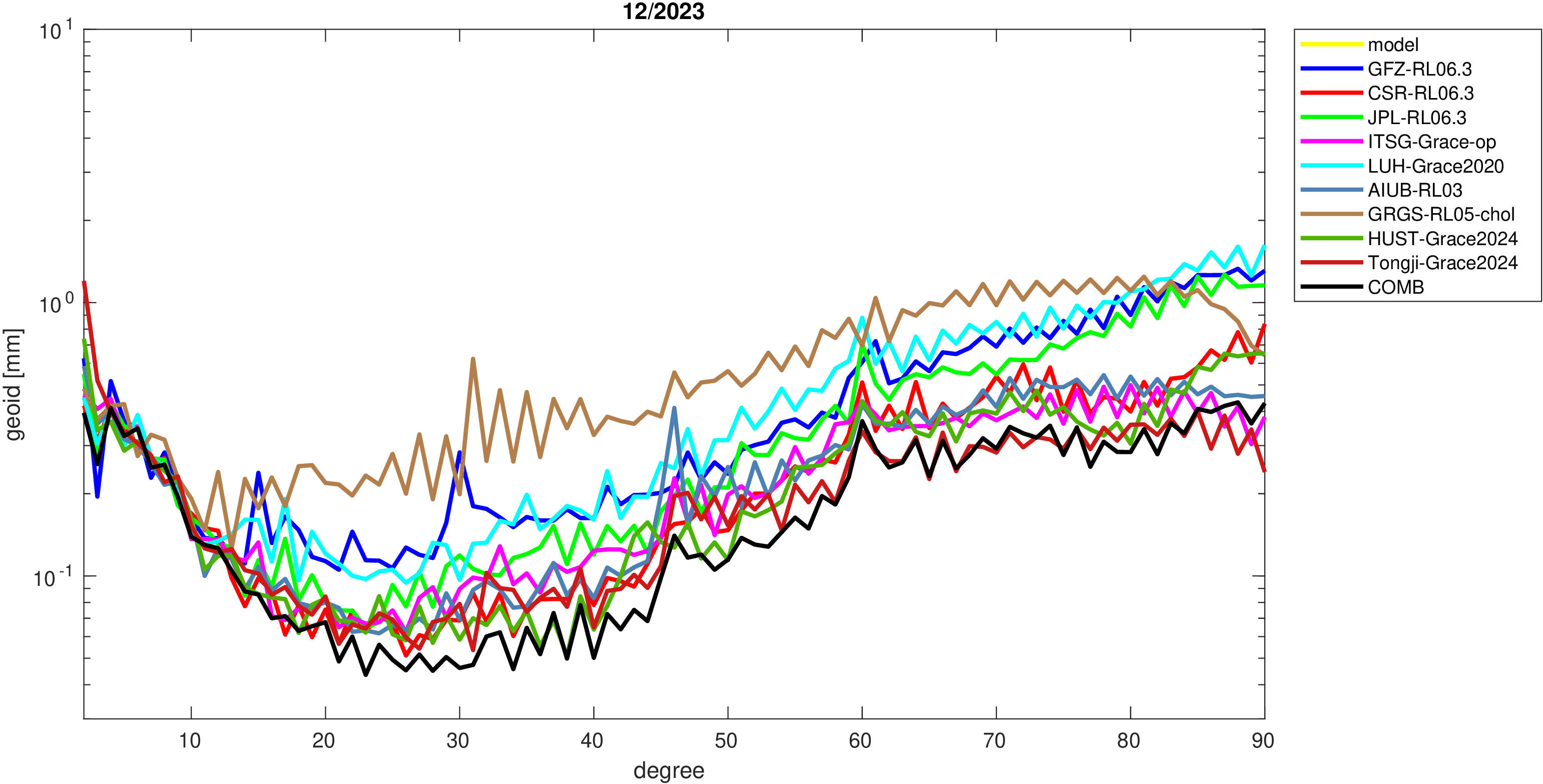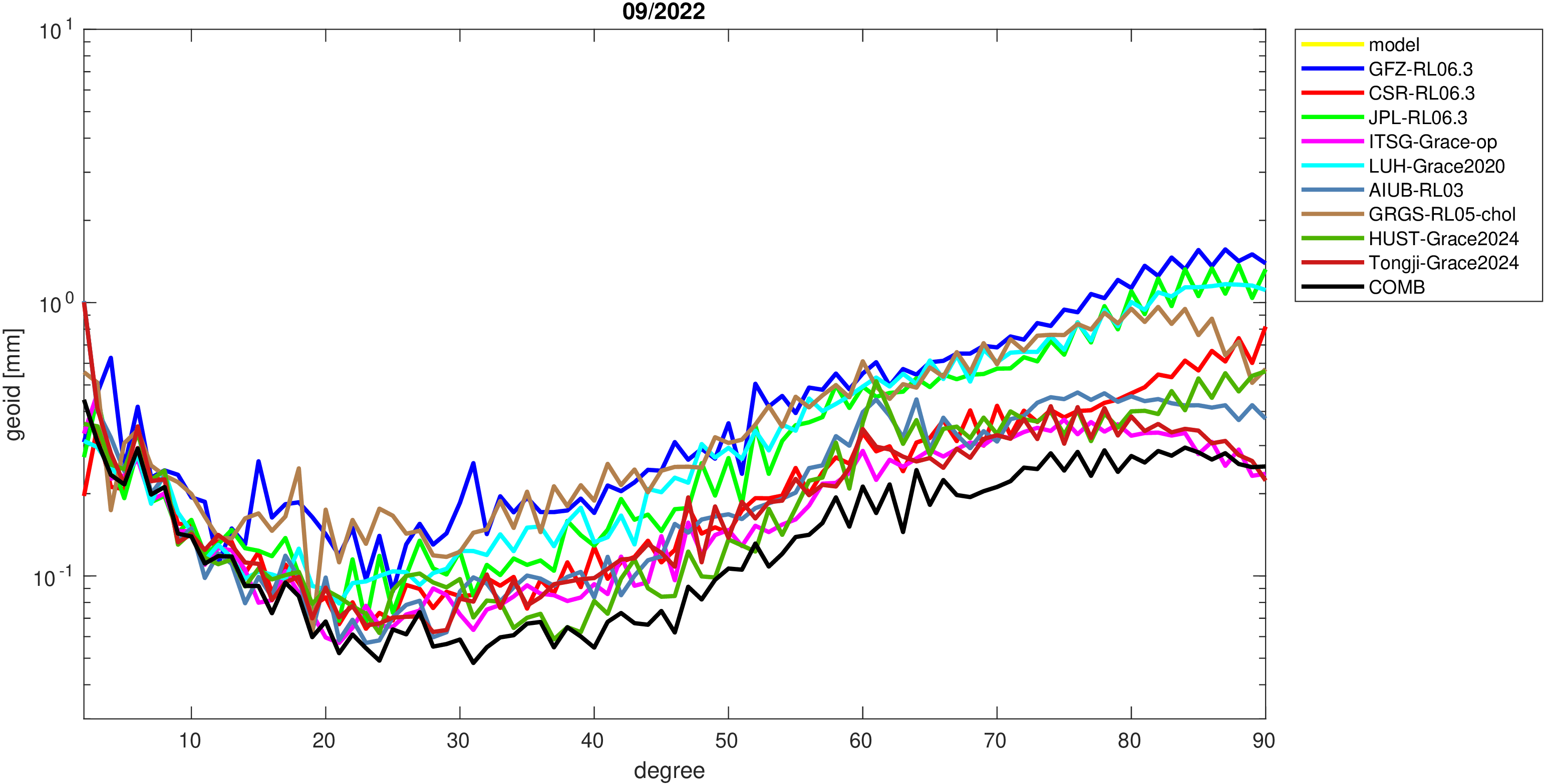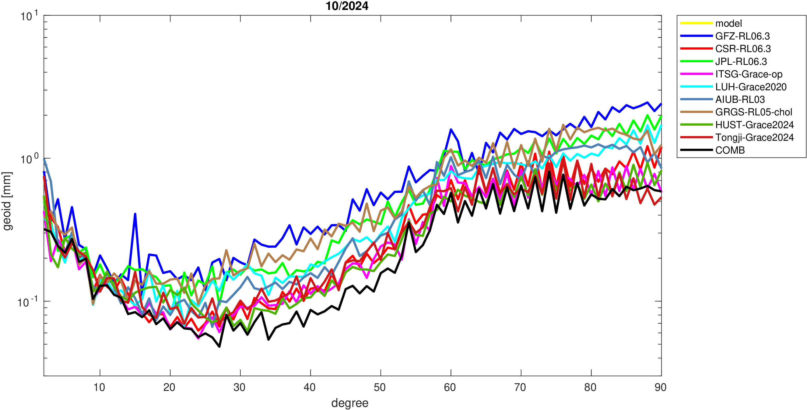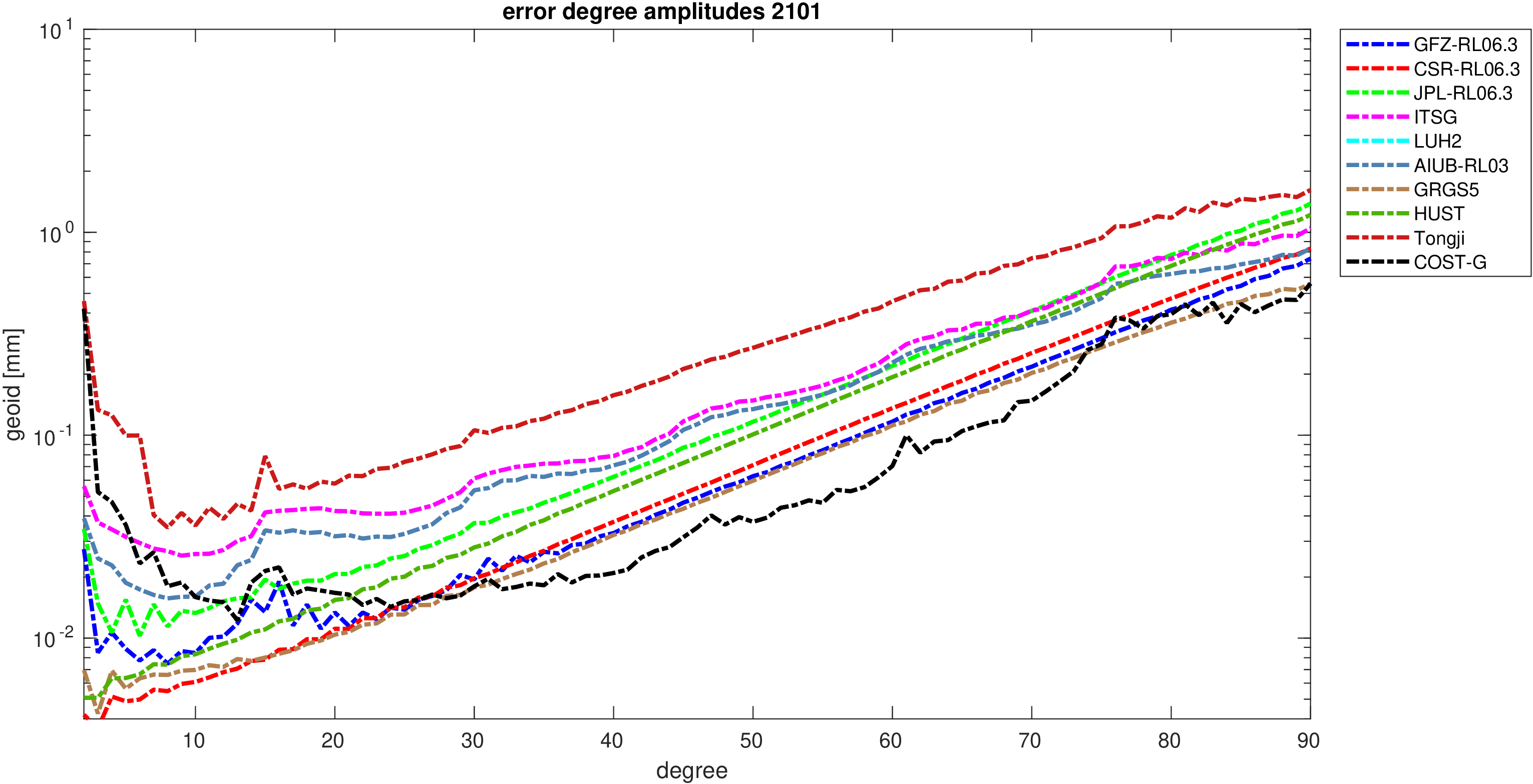 For comparisons in the spherical harmonic domain no filter is applied. Low degree anomalies are dominated by