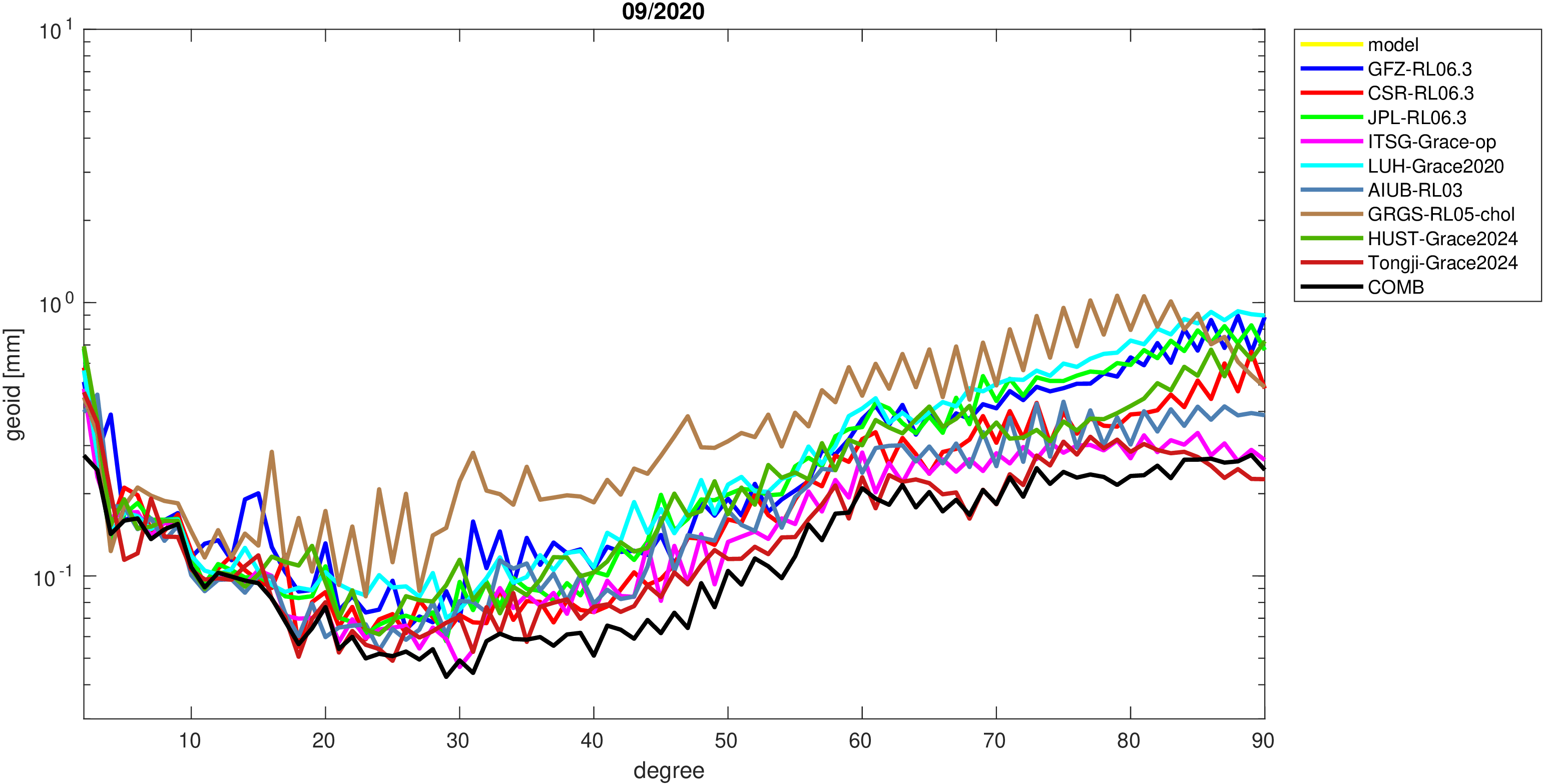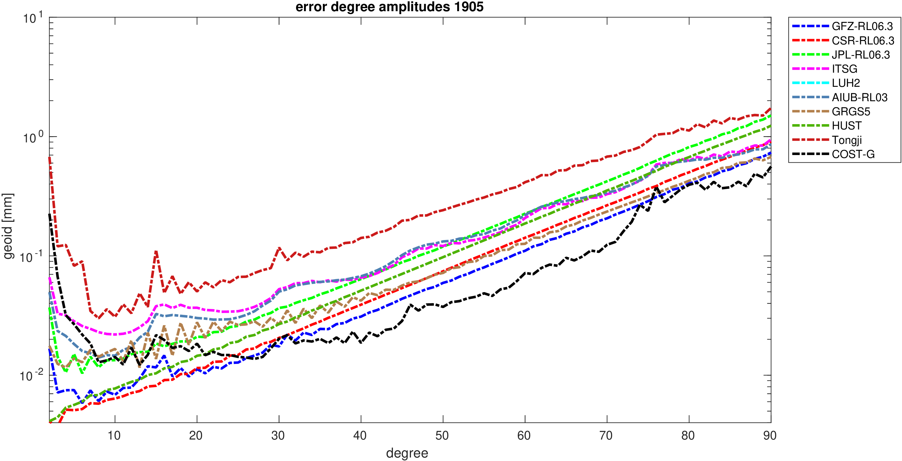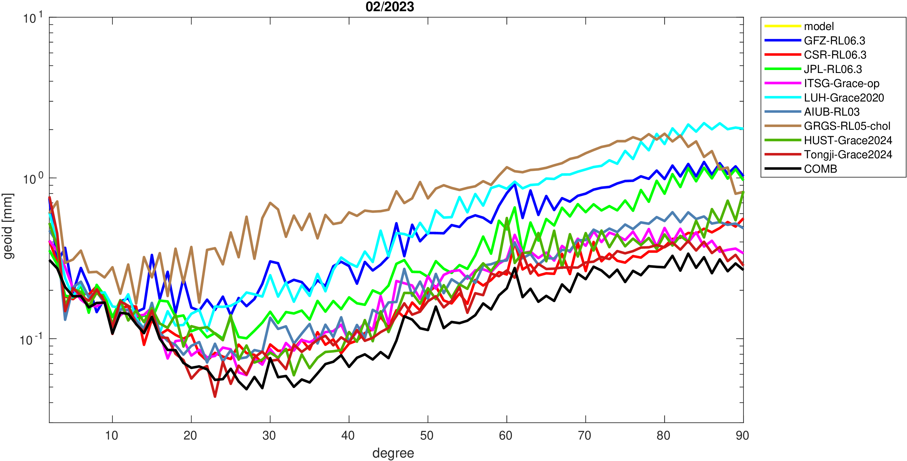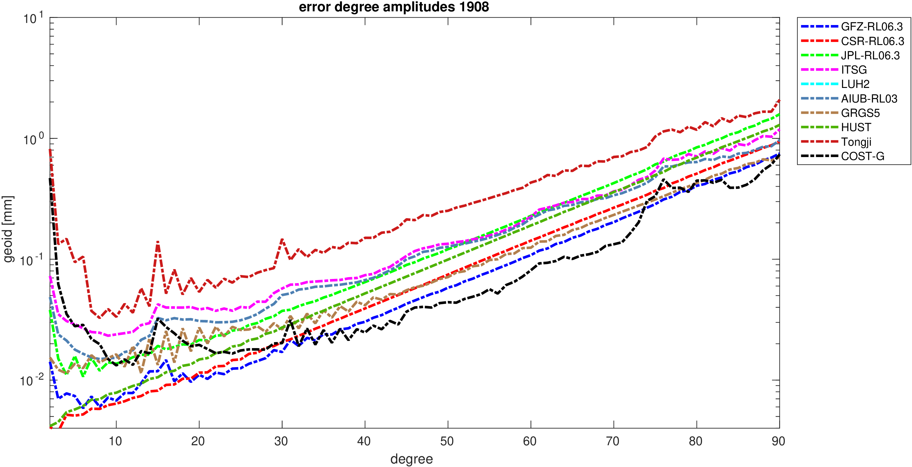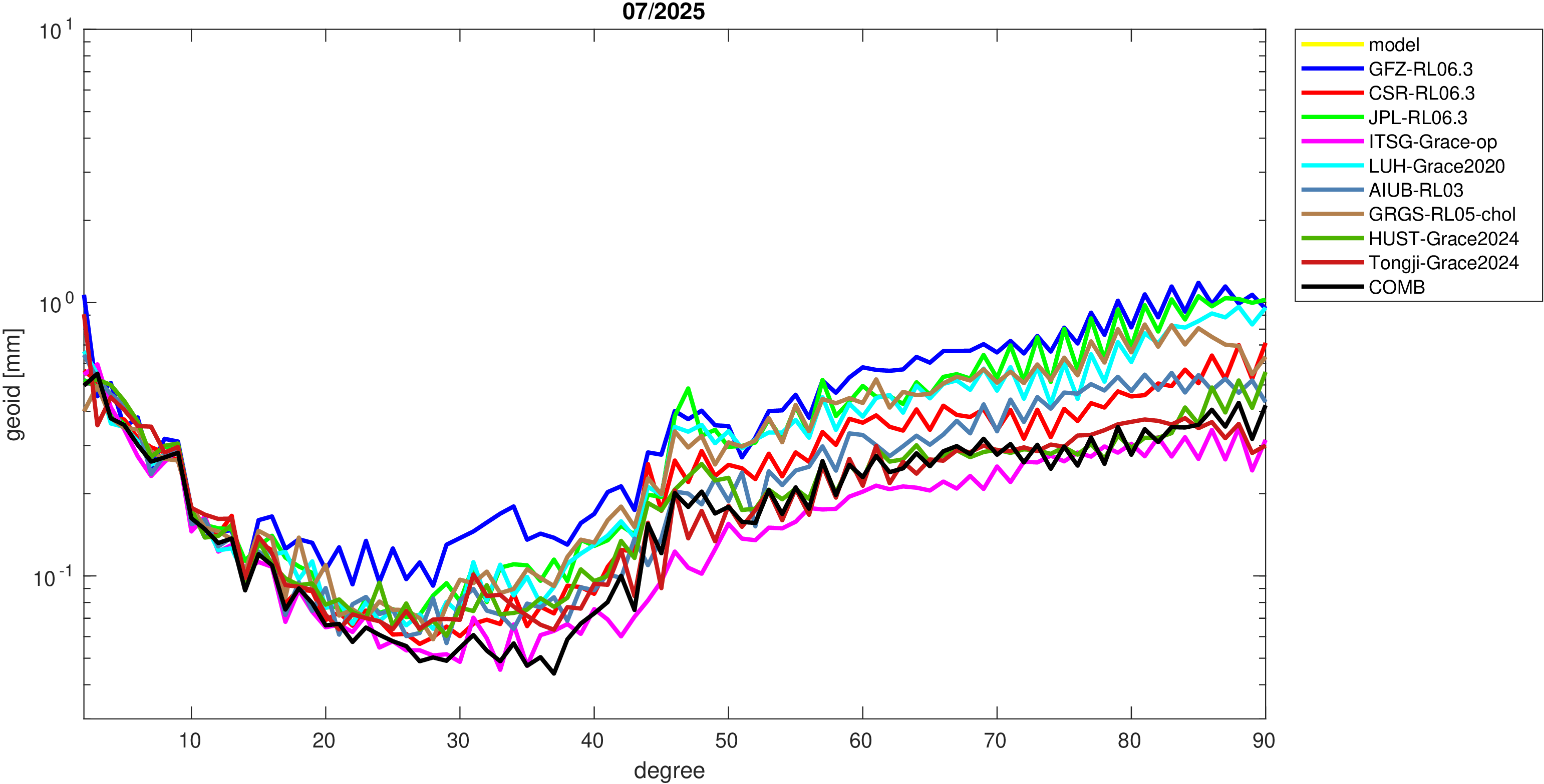 For comparisons in the spherical harmonic domain no filter is applied. Low degree anomalies are dominated by